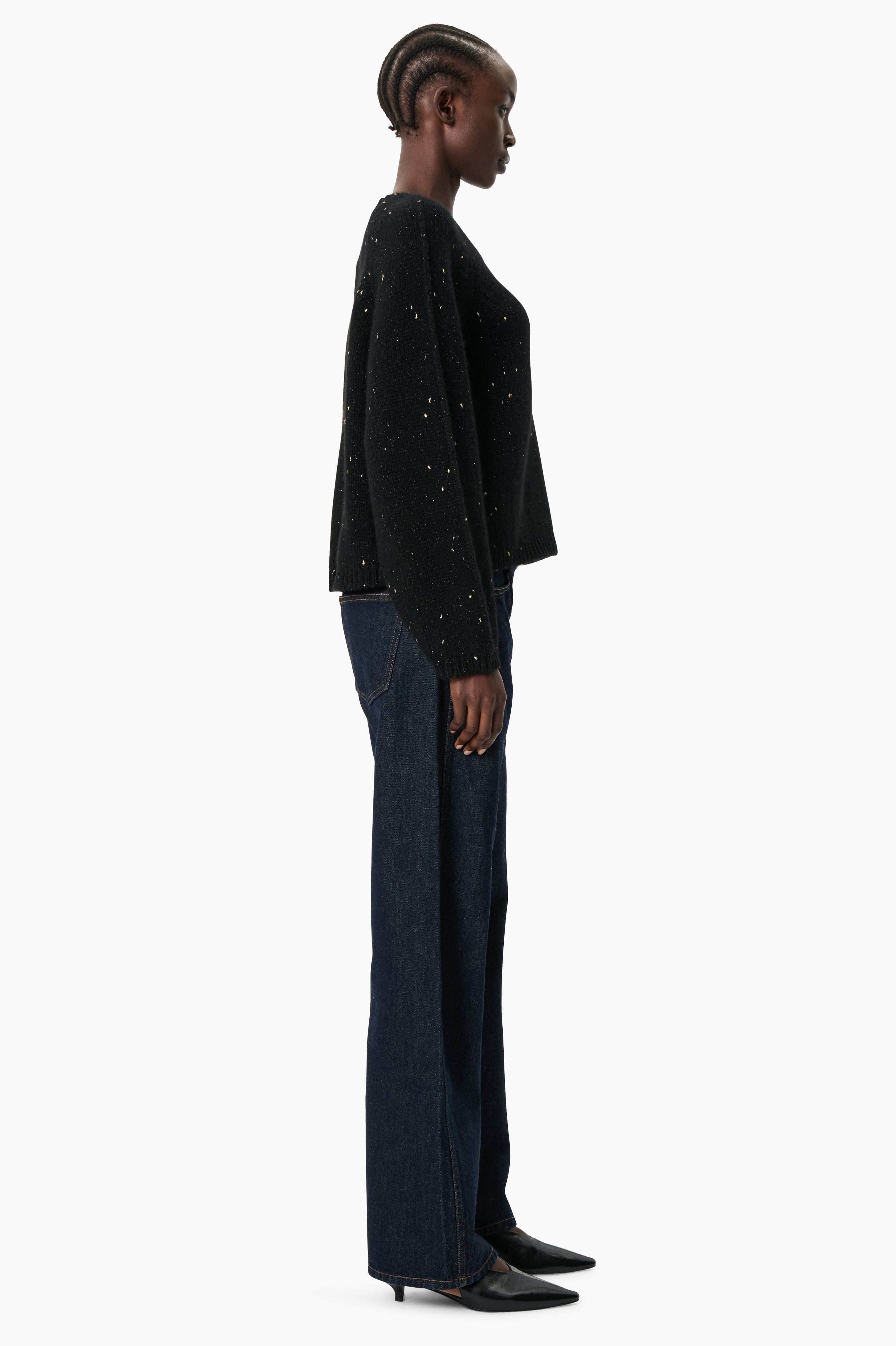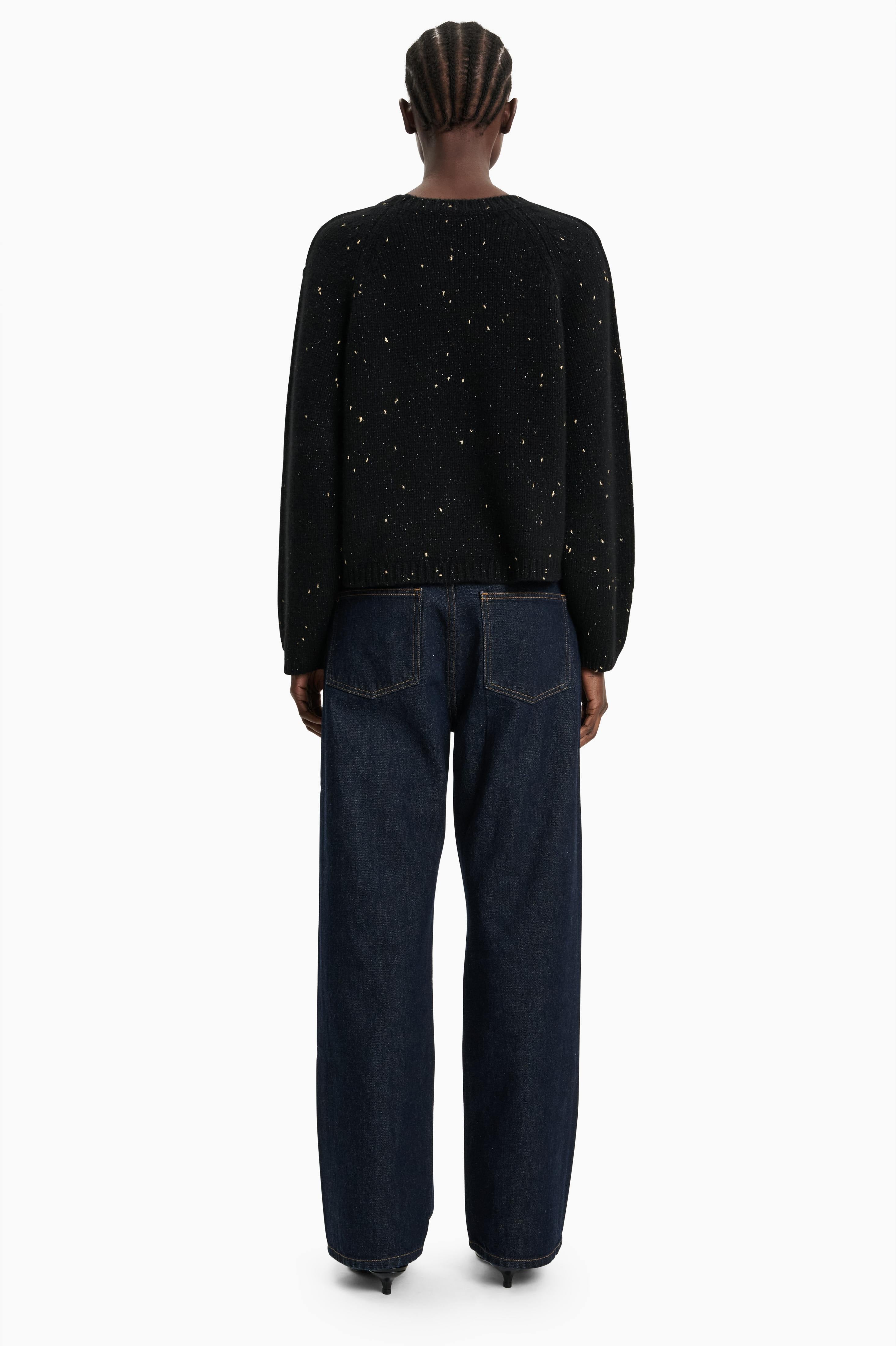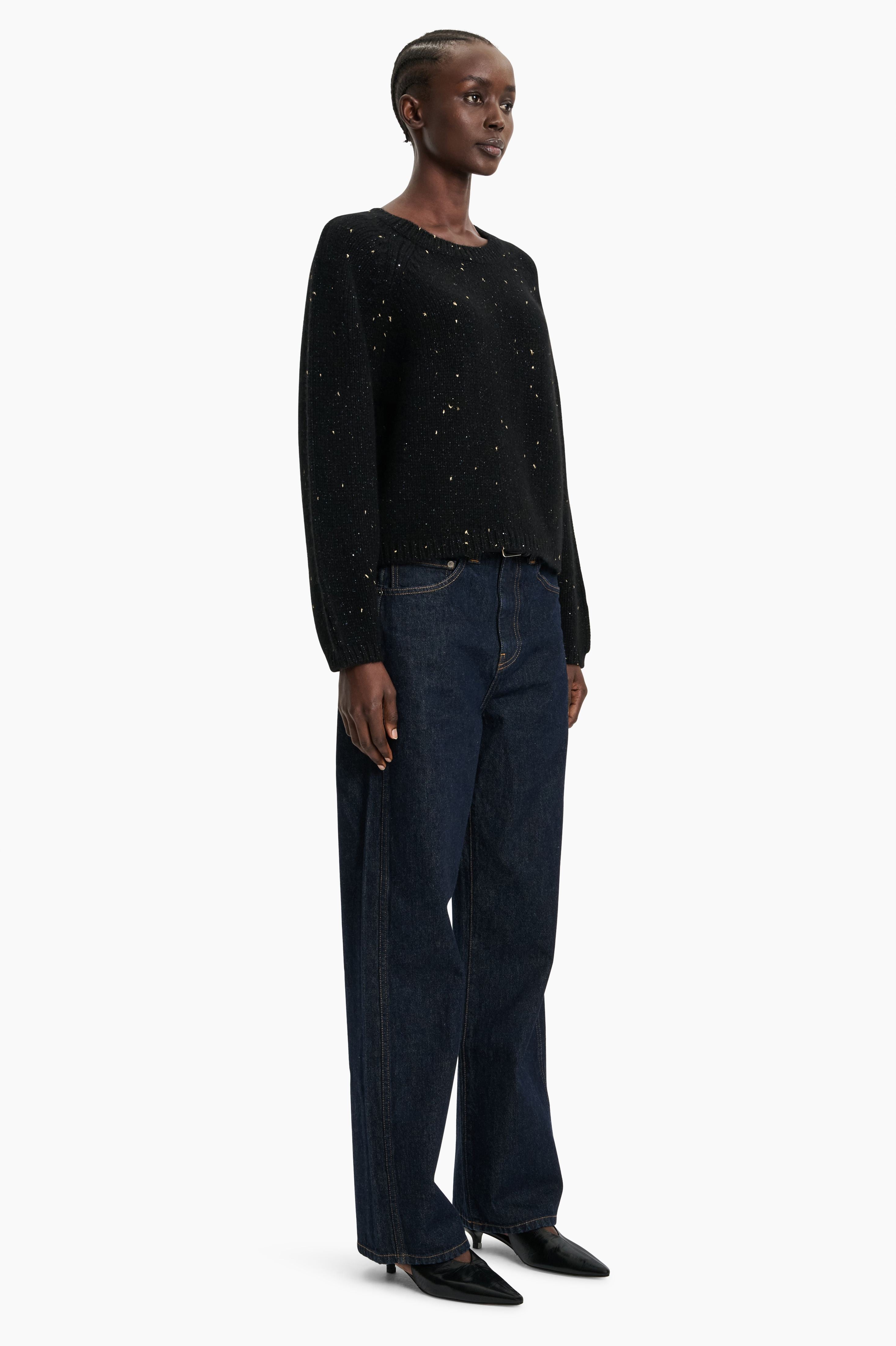 This crew neck jumper is crafted in heavyweight, luxurious chunky-knit cashmere, carefully and sustainably selected for its exceptional softness and rich texture. A soft scattering of gold is delicately woven throughout, catching the light for an understated touch of luminosity. Featuring fully fashioned seams, a slightly fitted cropped silhouette balanced by deliberately elongated sleeves, and finished with a ribbed neckline, cuffs, and hem.