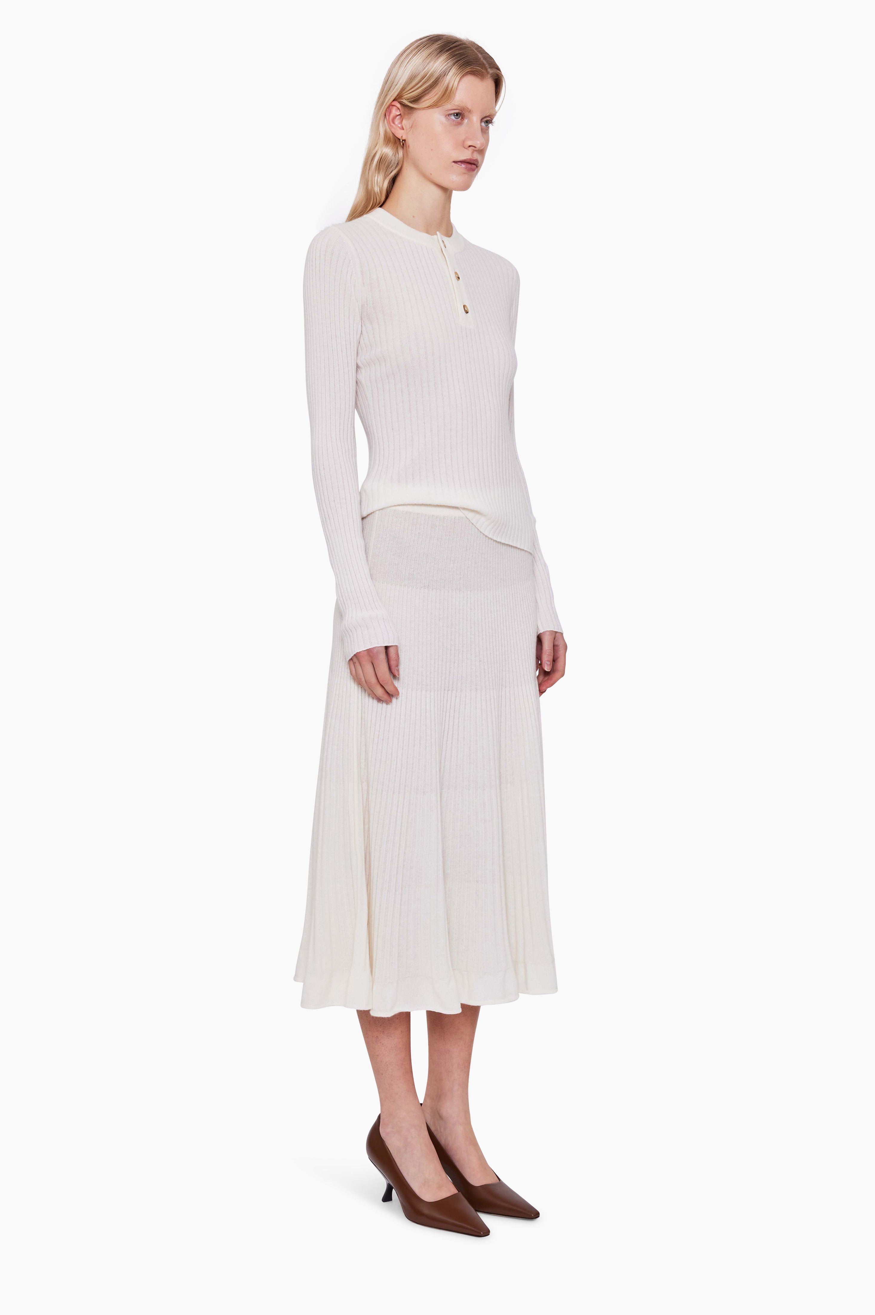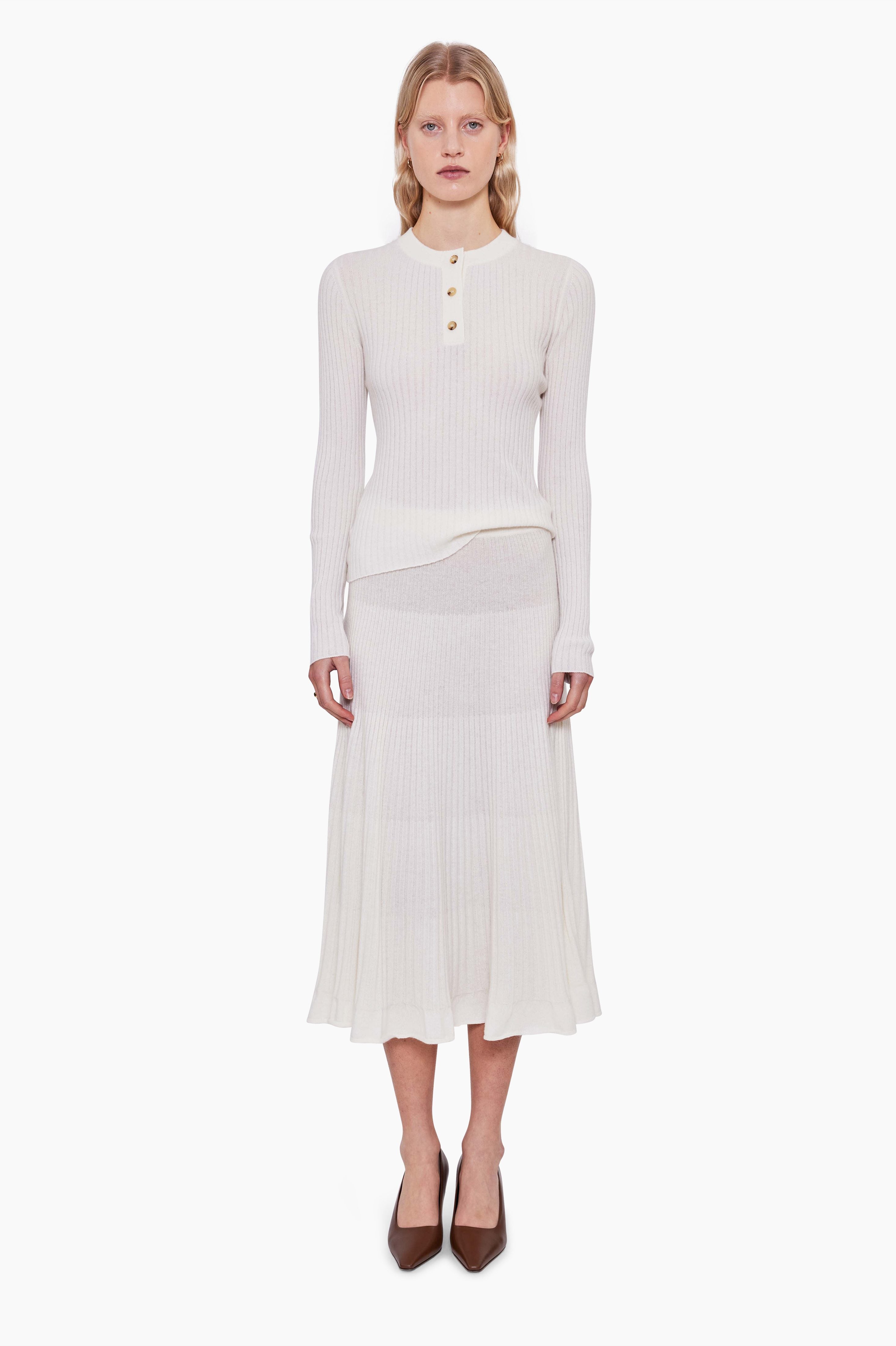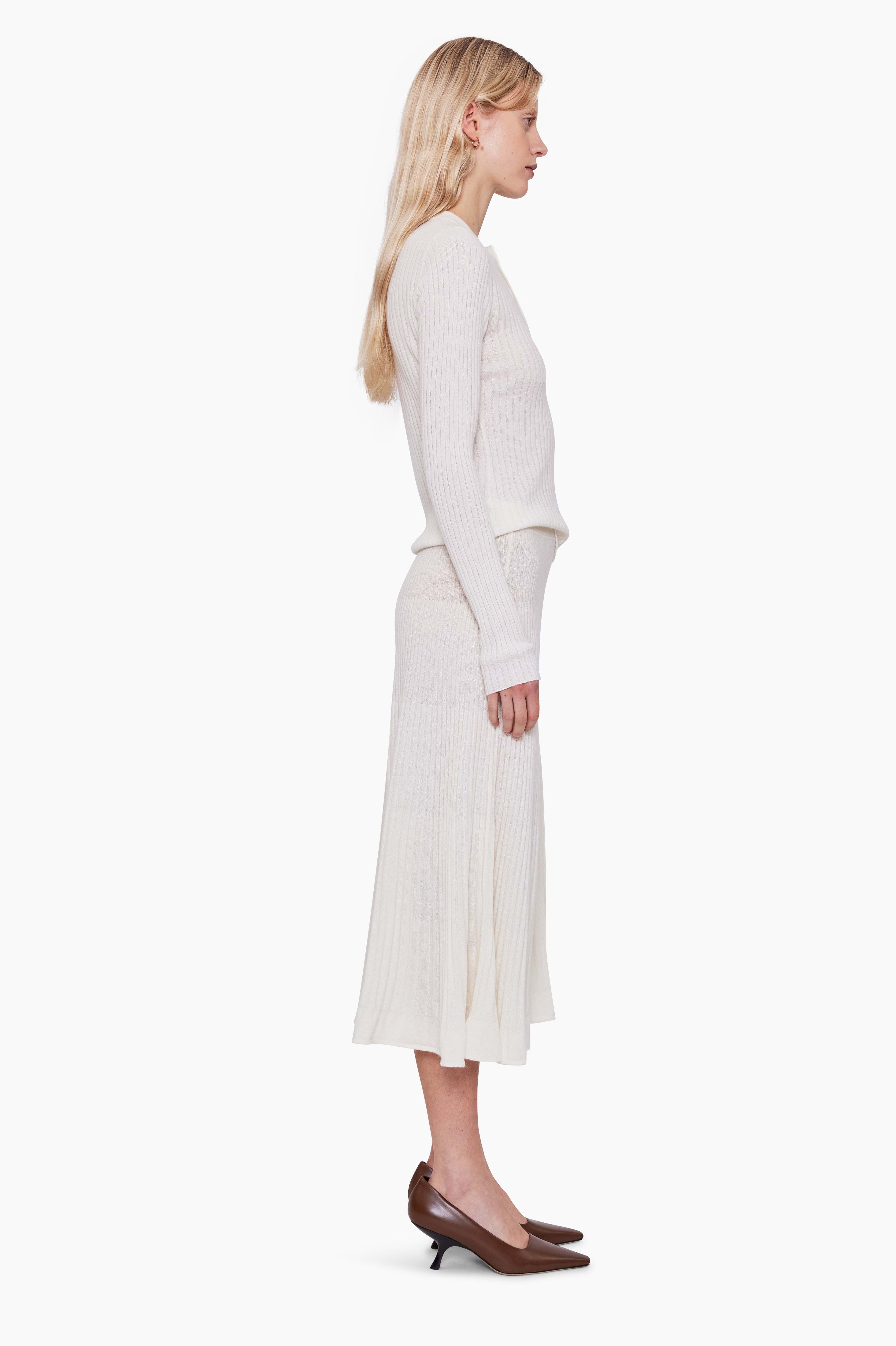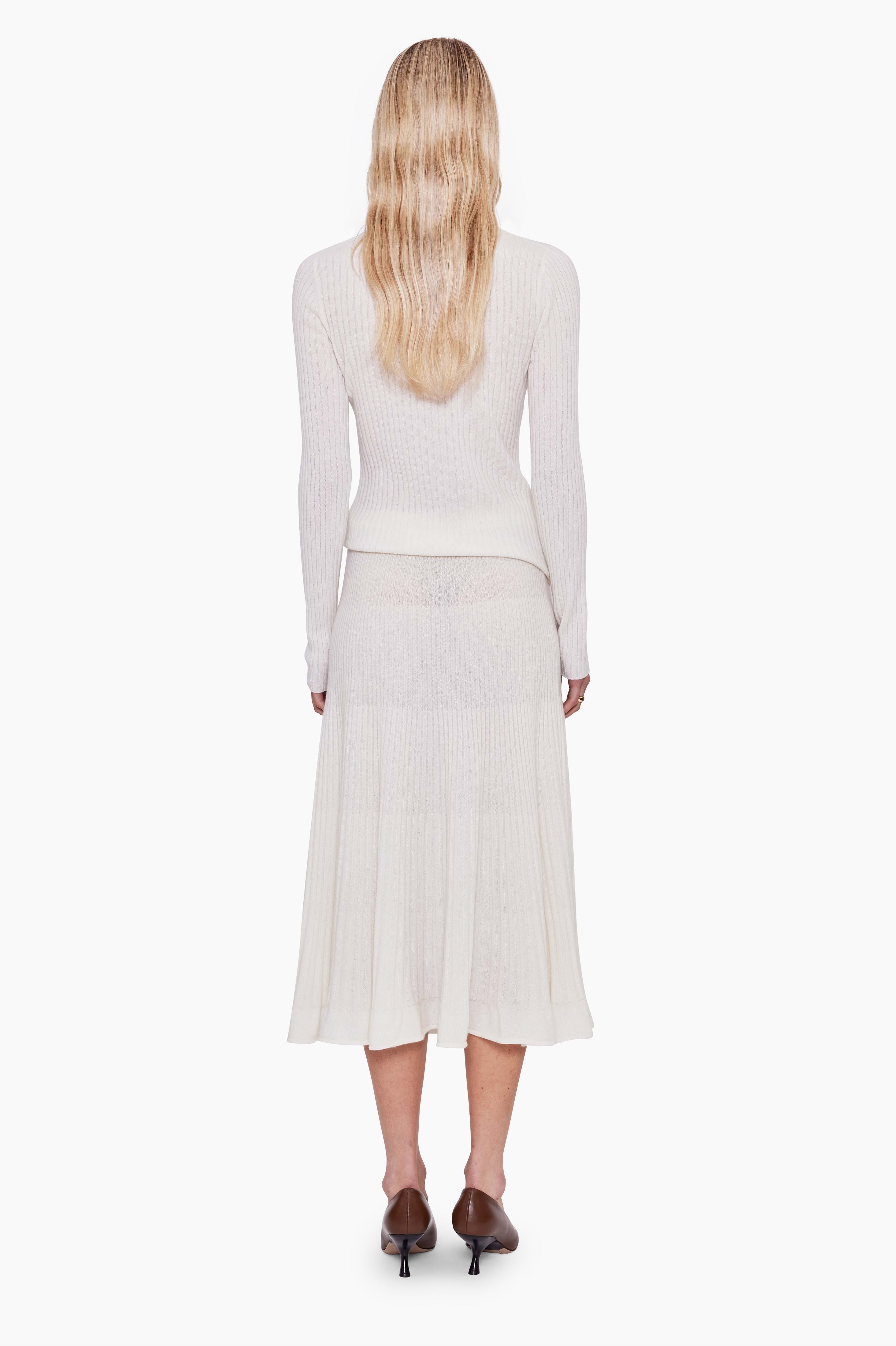 This ribbed knitted skirt, in luxurious baby goat cashmere, has been carefully and sustainably selected for its exceptional softness and texture. It features a floaty elongated A-line silhouette, and is finished with a refined ribbed waistband. 100% Baby goat cashmere.
