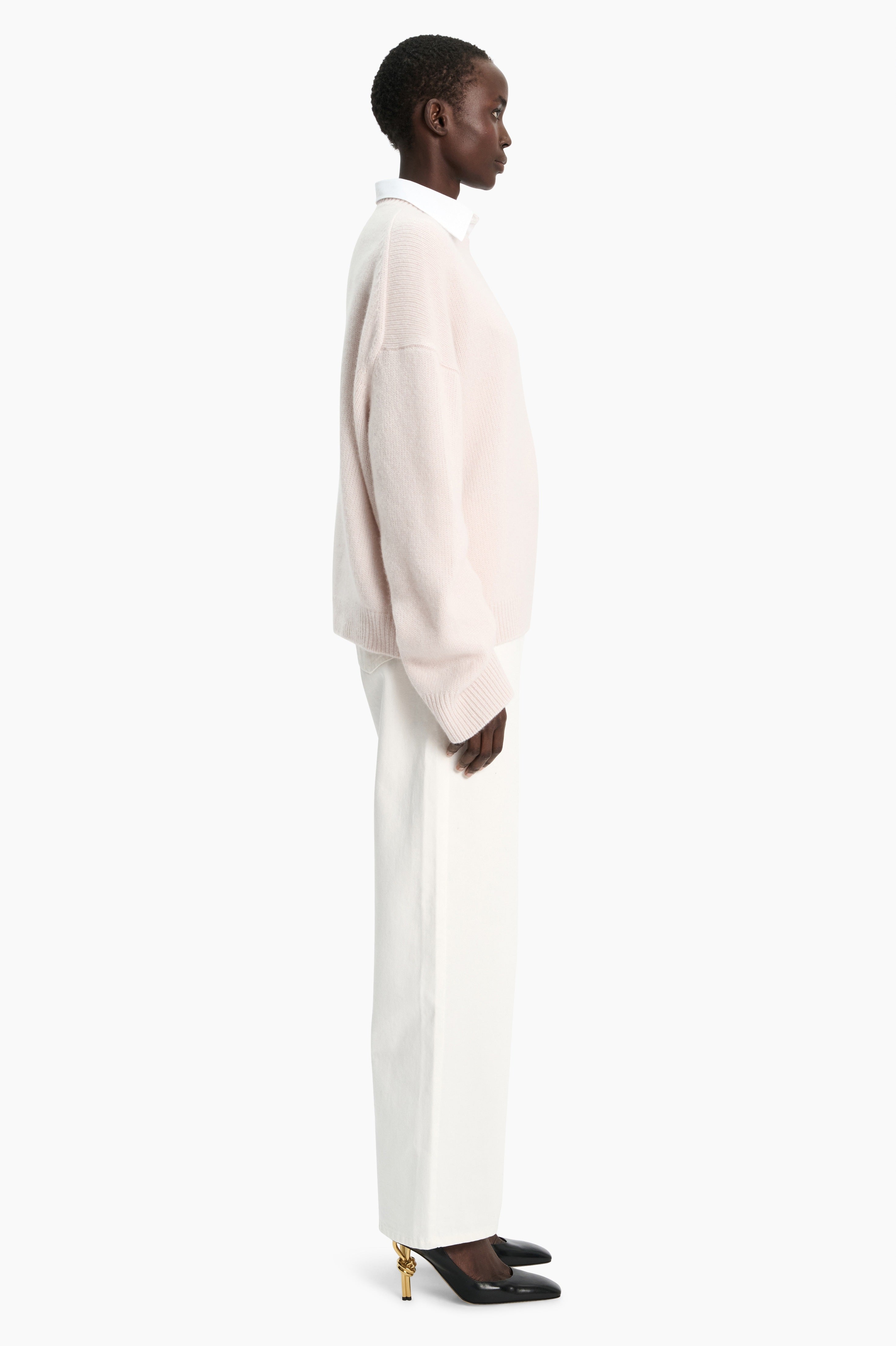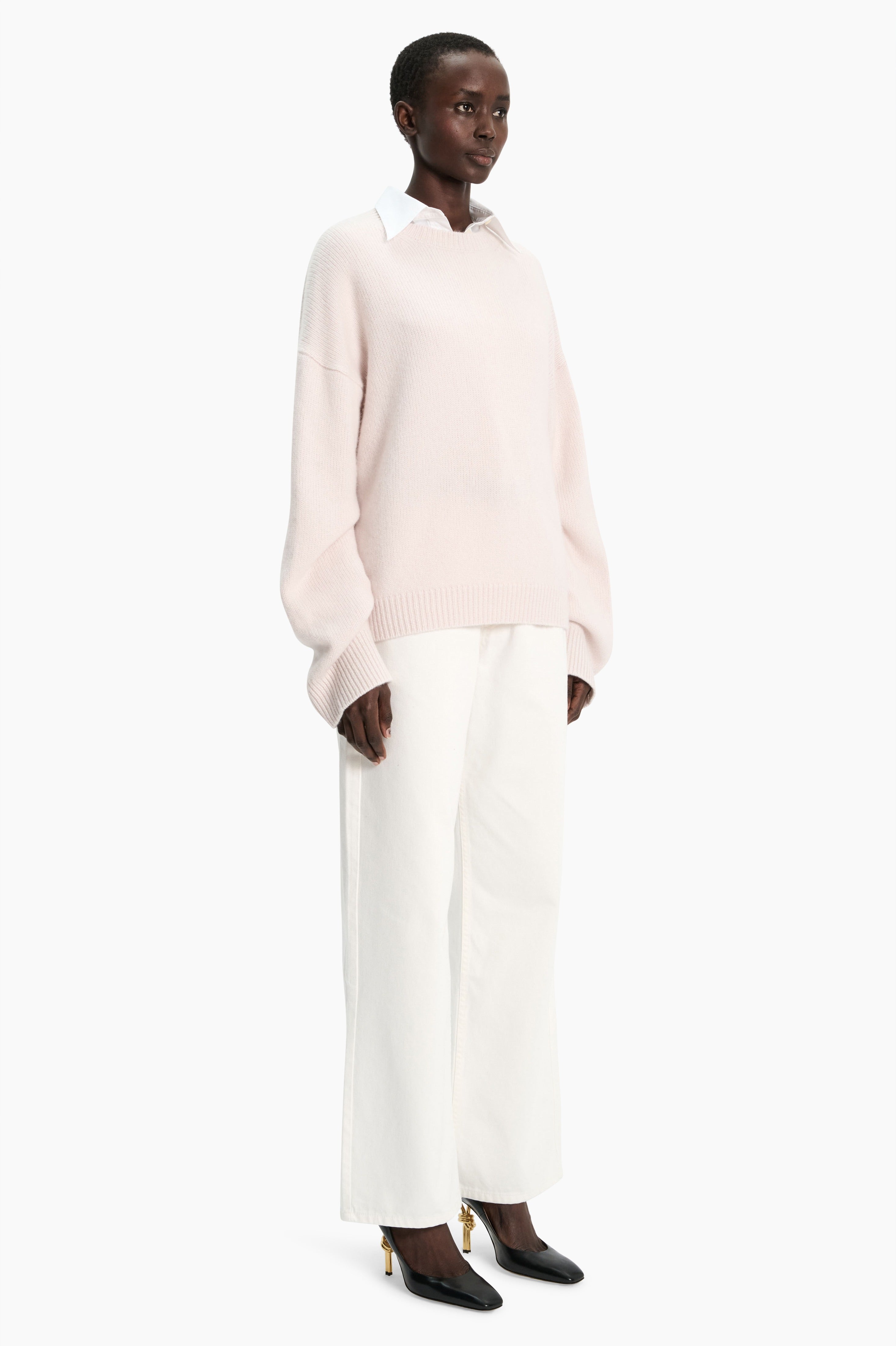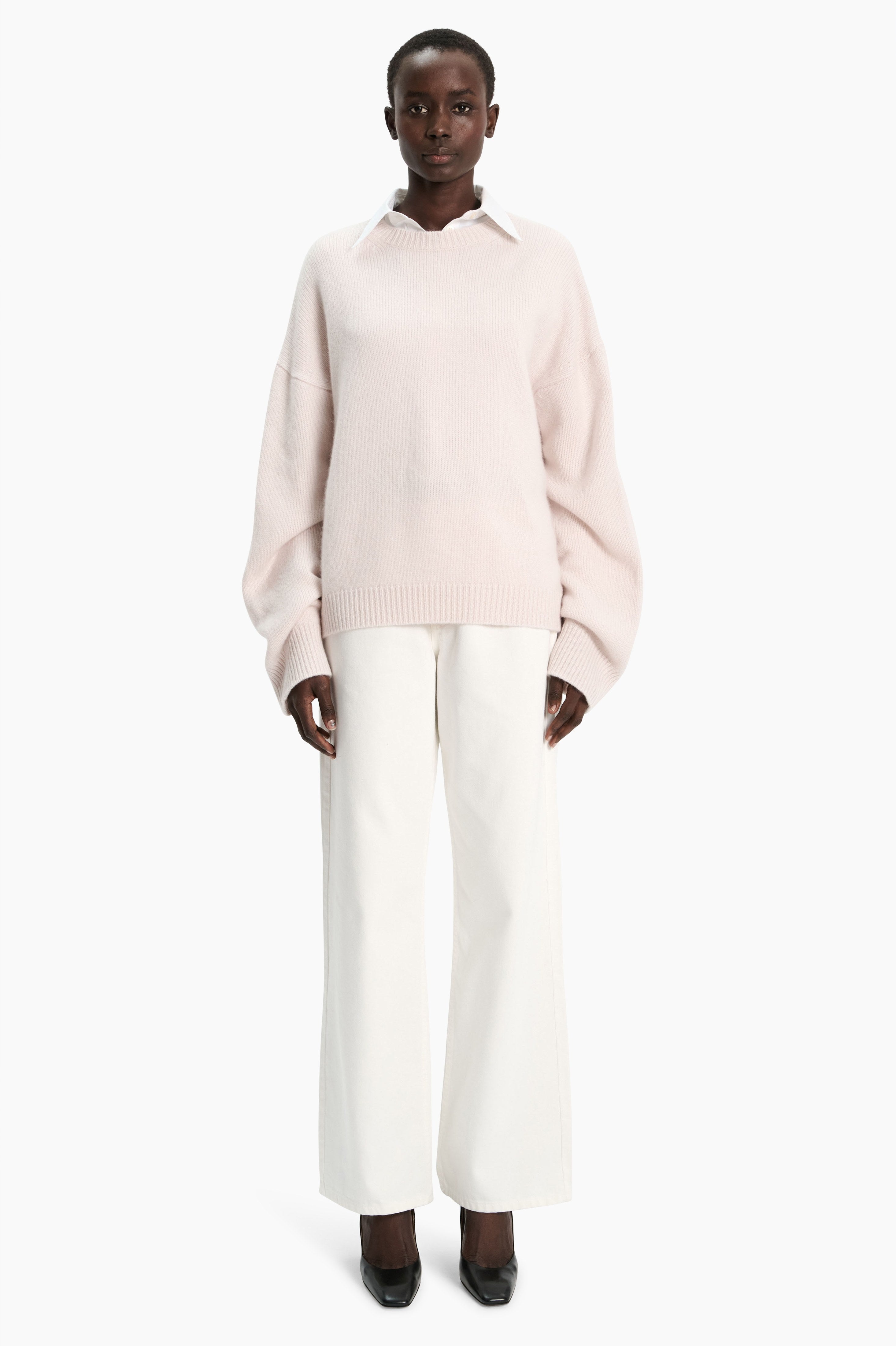 This crew neck jumper, in heavy weight luxurious chunky knit cashmere, carefully and sustainably selected for its exceptional softness and rich texture. Featuring fully fashioned seams, with a slightly fitted cropped silhouette balanced by deliberately elongated sleeves and refined by a ribbed neckline, cuffs and hem.