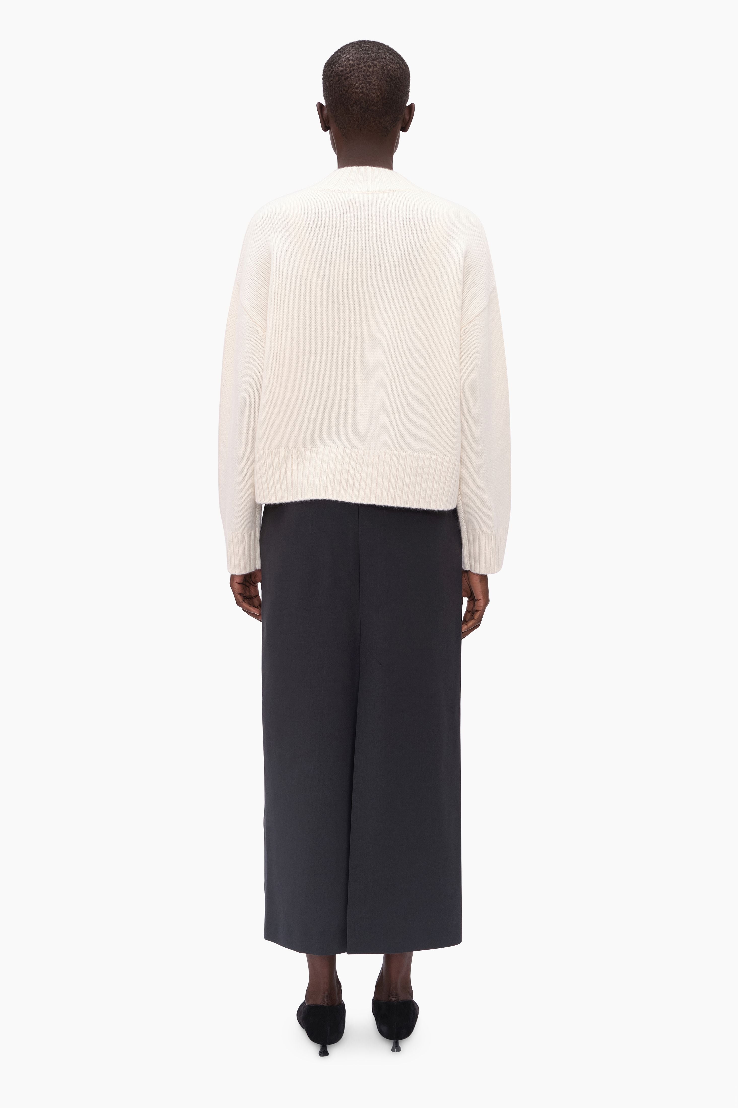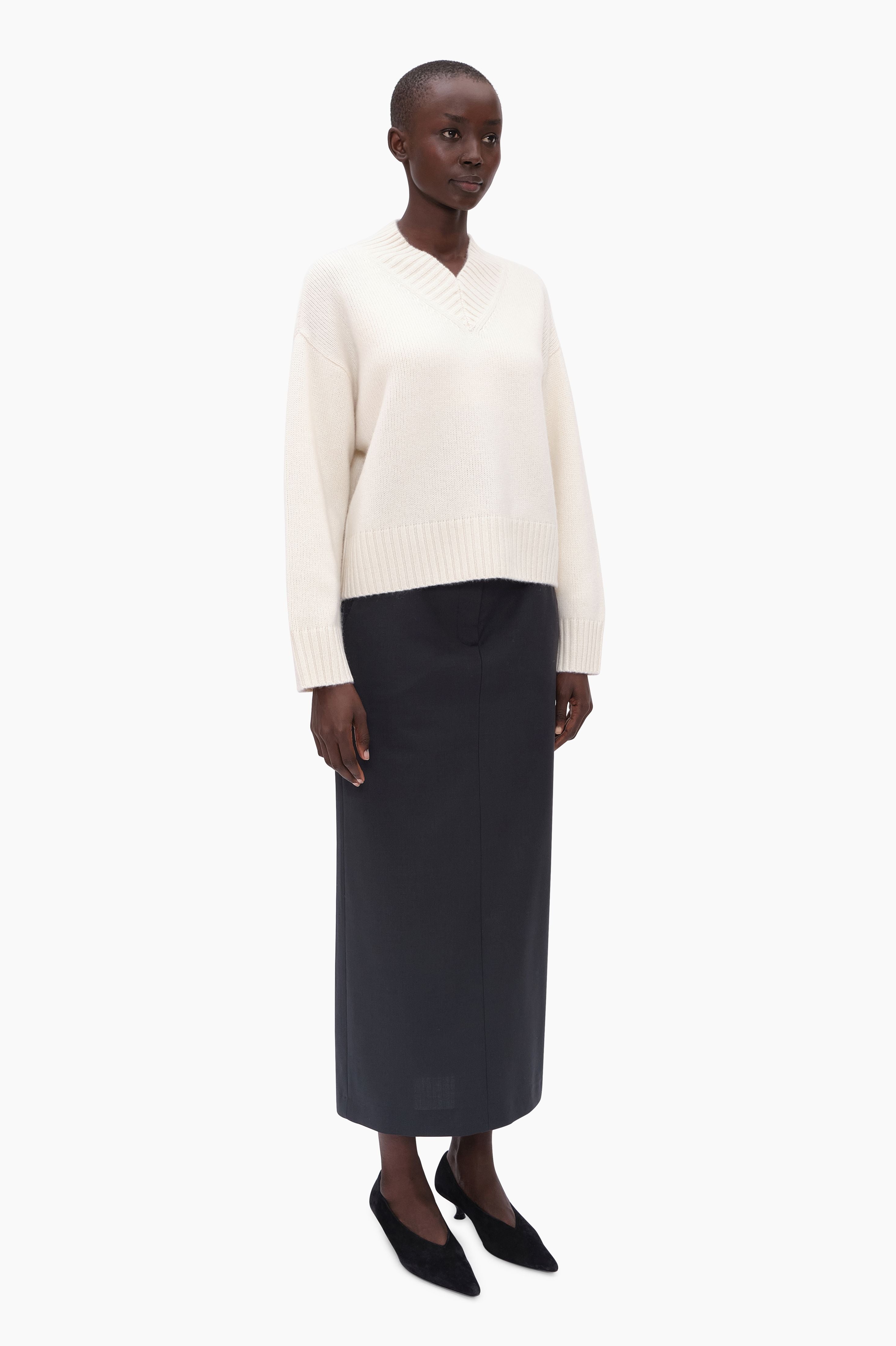 This V-neck jumper, in heavy-weight luxurious chunky knit cashmere, has been carefully and sustainably selected for its exceptional softness and rich texture. Featuring fully fashioned seams with an oversized silhouette, refined by a ribbed neckline, hem and cuffs.