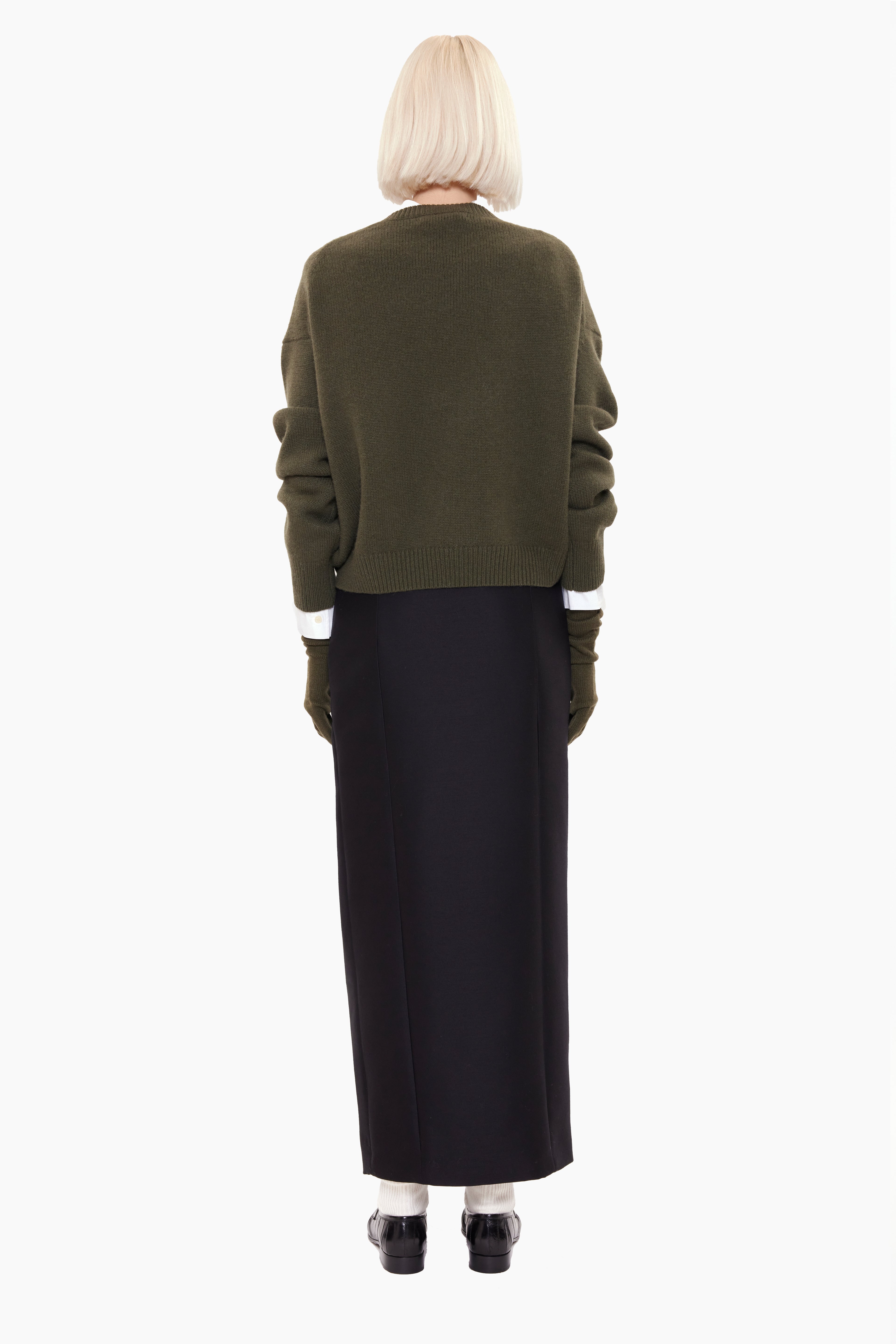 This crew neck jumper, in heavy-weight luxurious chunky knit cashmere, carefully and sustainably selected for its exceptional softness and rich texture. Featuring fully fashioned seams, with a slightly fitted cropped silhouette balanced by deliberately elongated sleeves and refined by a ribbed neckline, cuffs and hem.