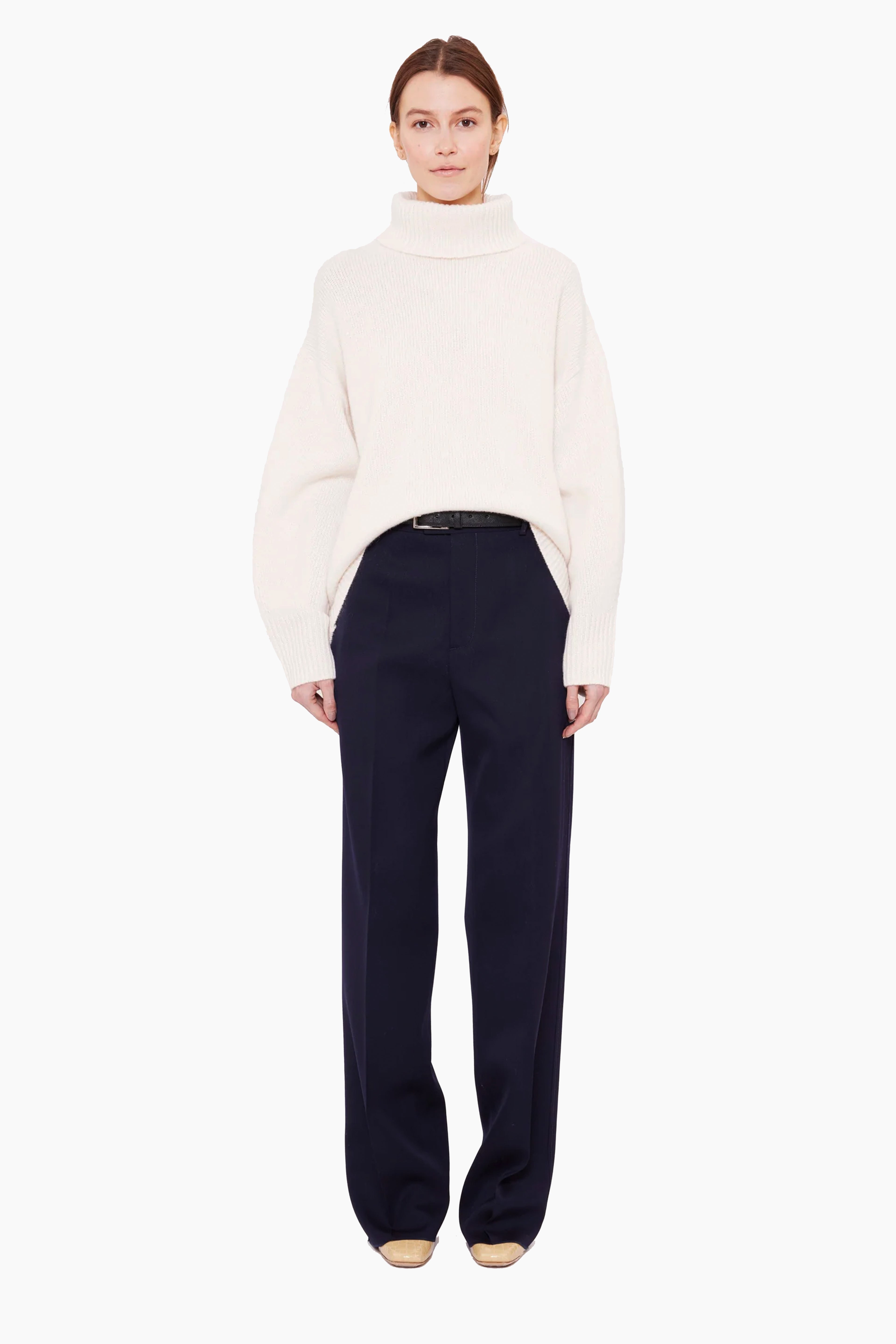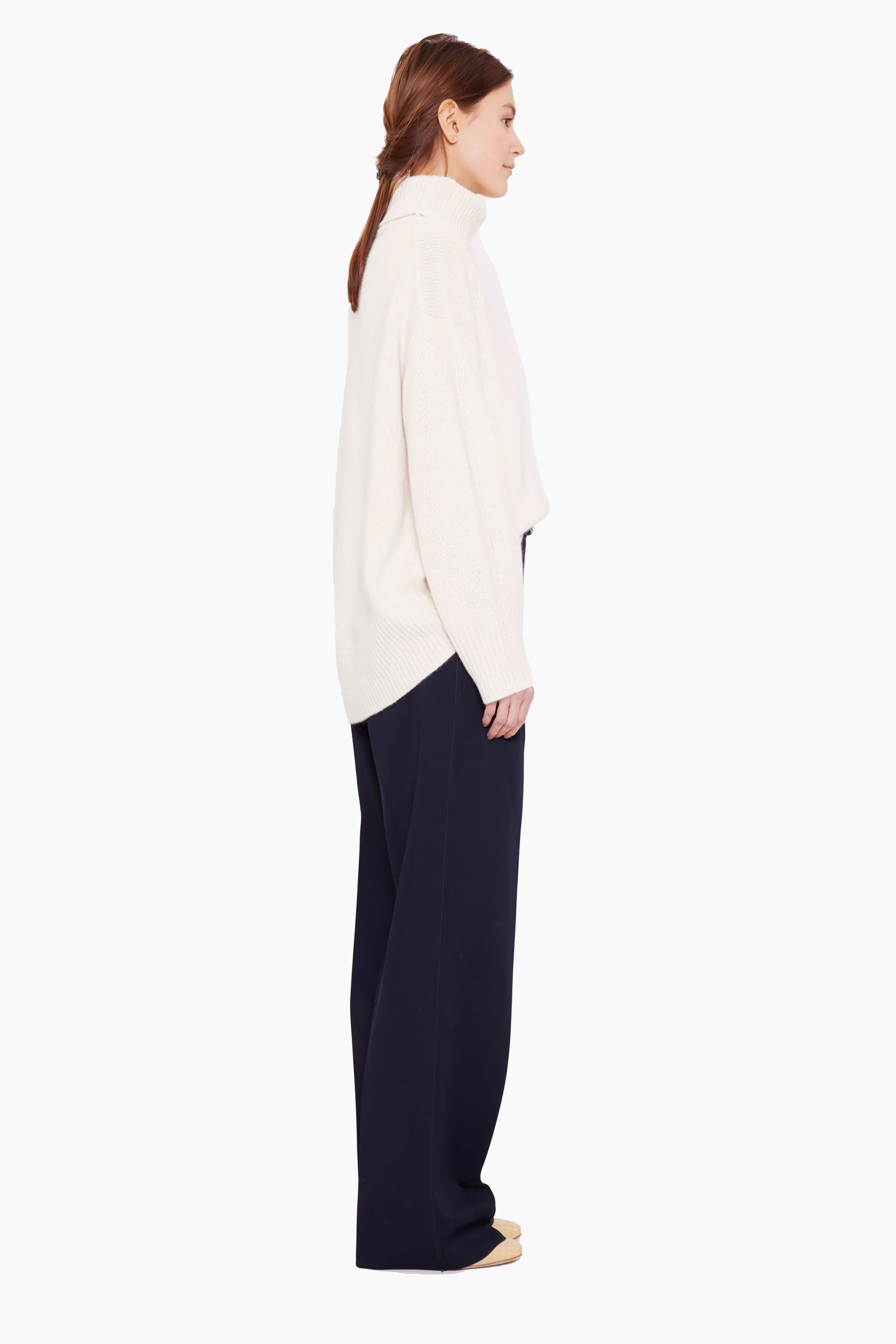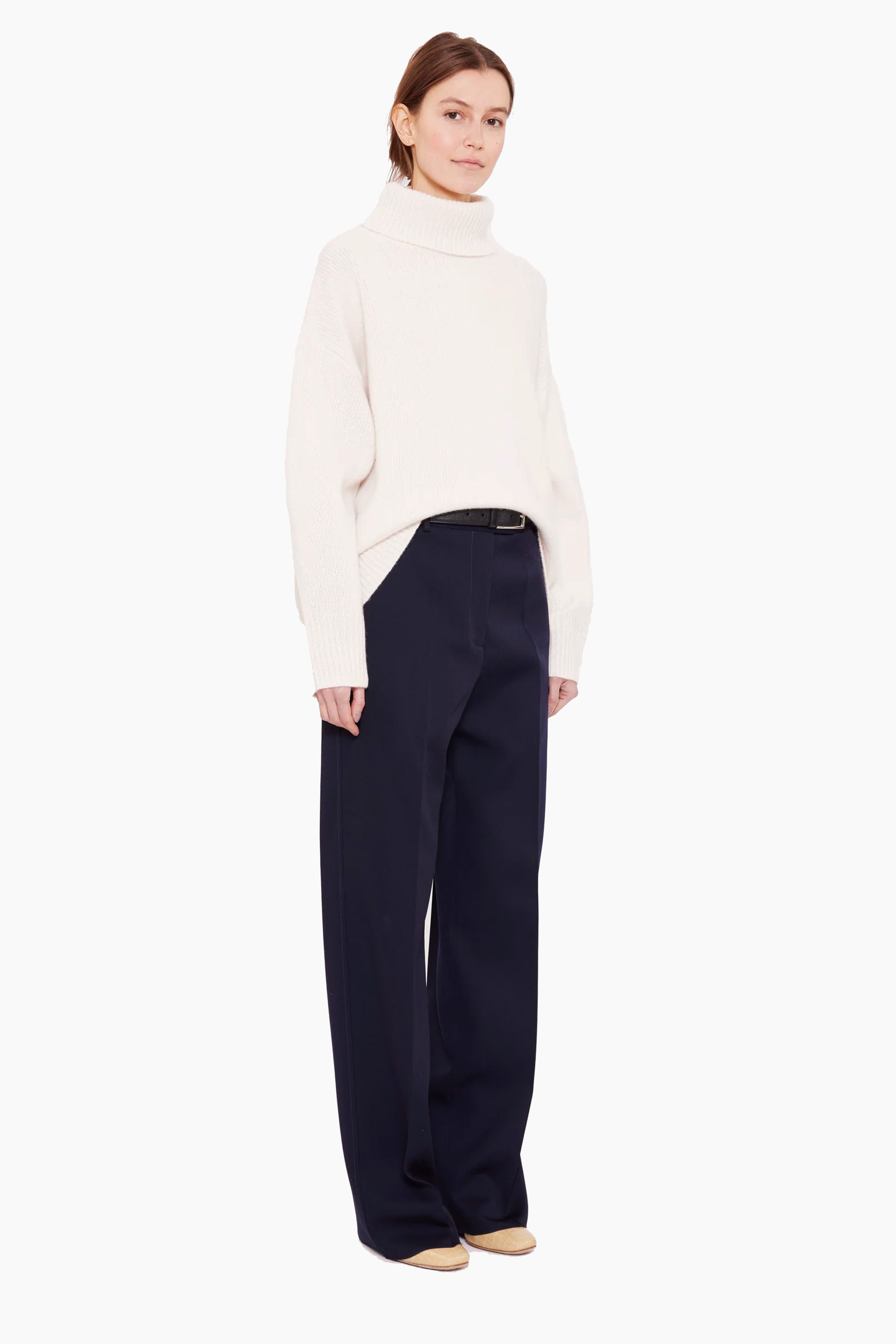 This slouchy roll neck jumper, in heavy weight luxurious chunky knit cashmere, carefully and sustainably selected for its exceptional softness and rich texture. Featuring fully fashioned seams, the oversized silhouette is paired with drop shoulders and refined by a ribbed neckline, cuffs and hem.
