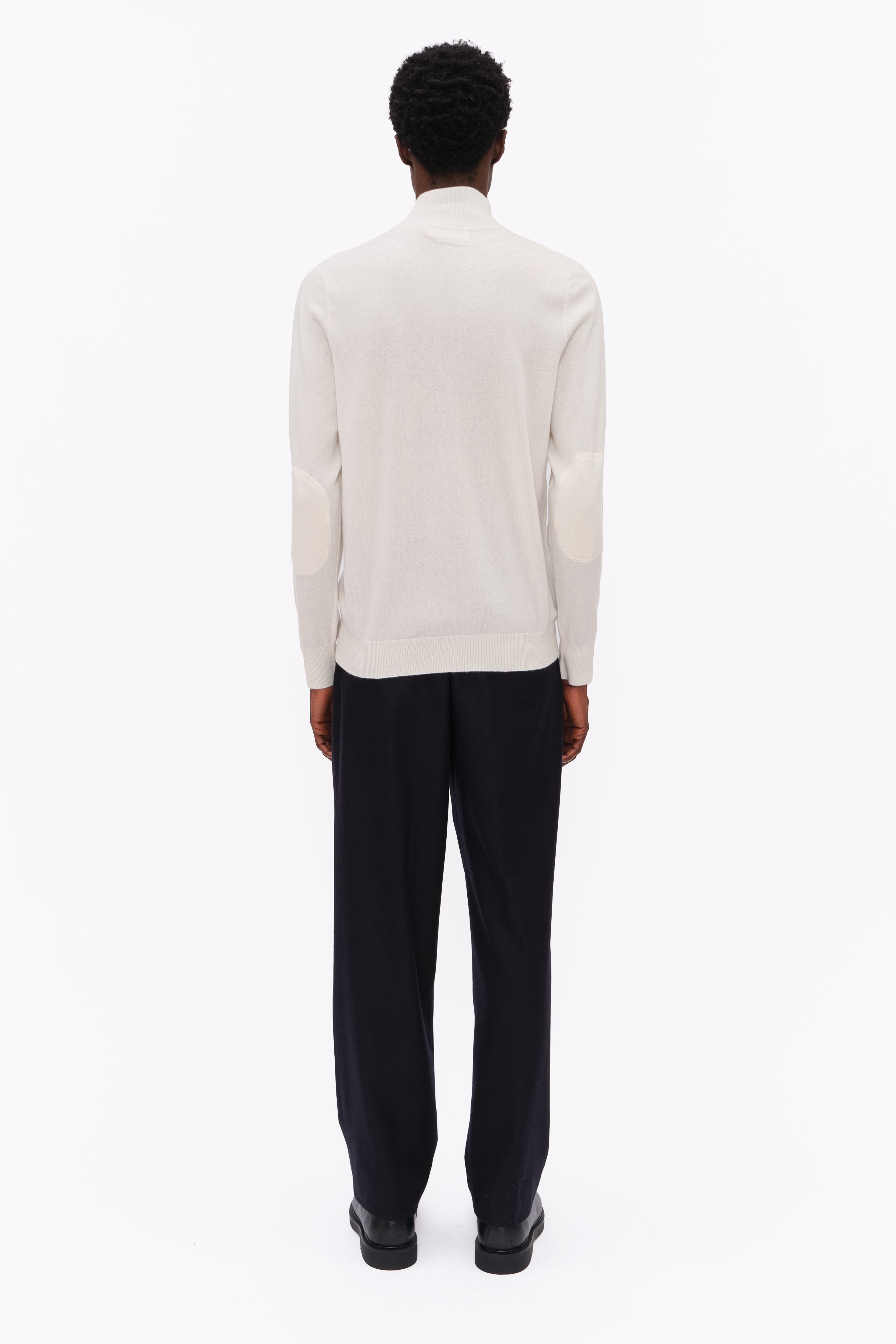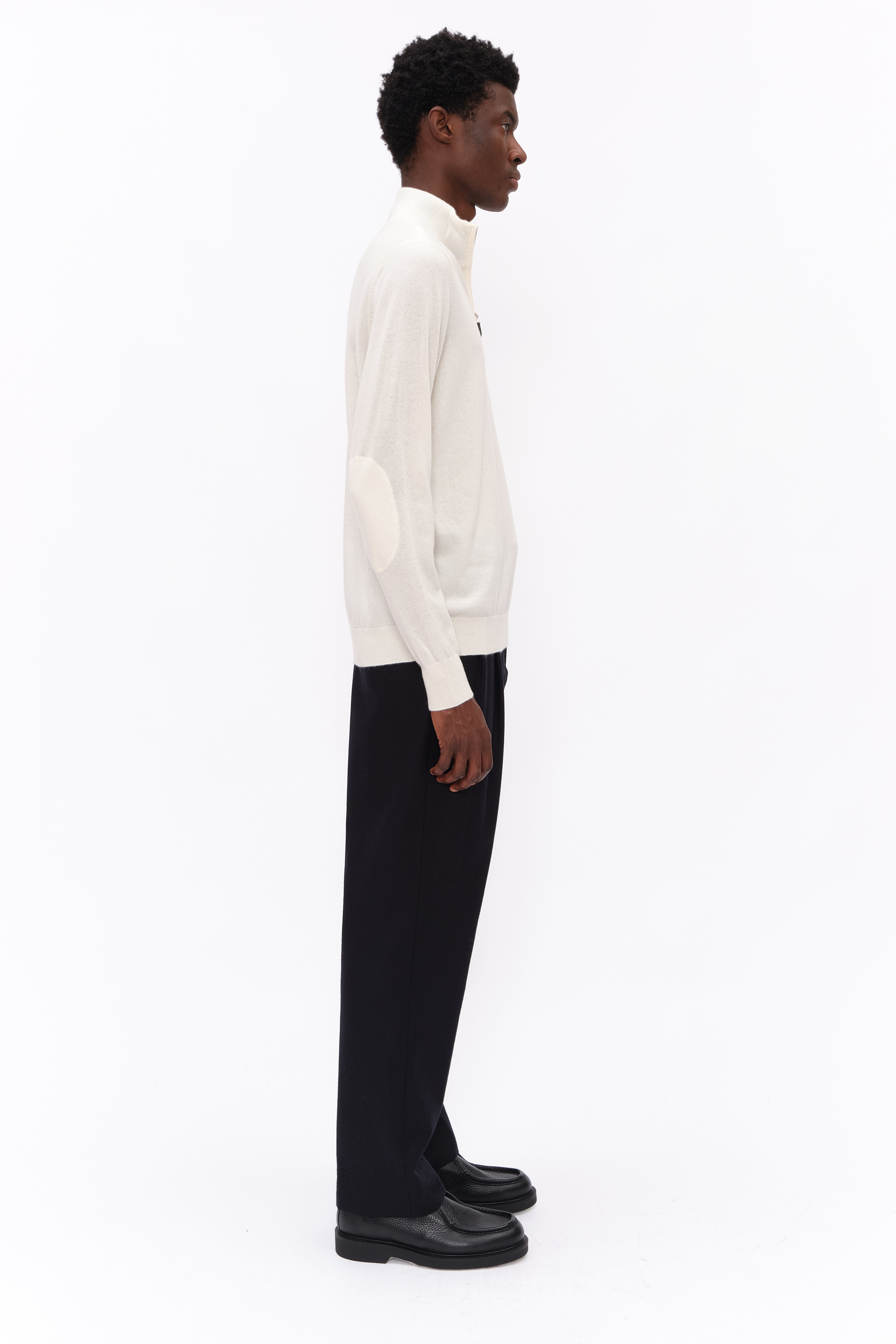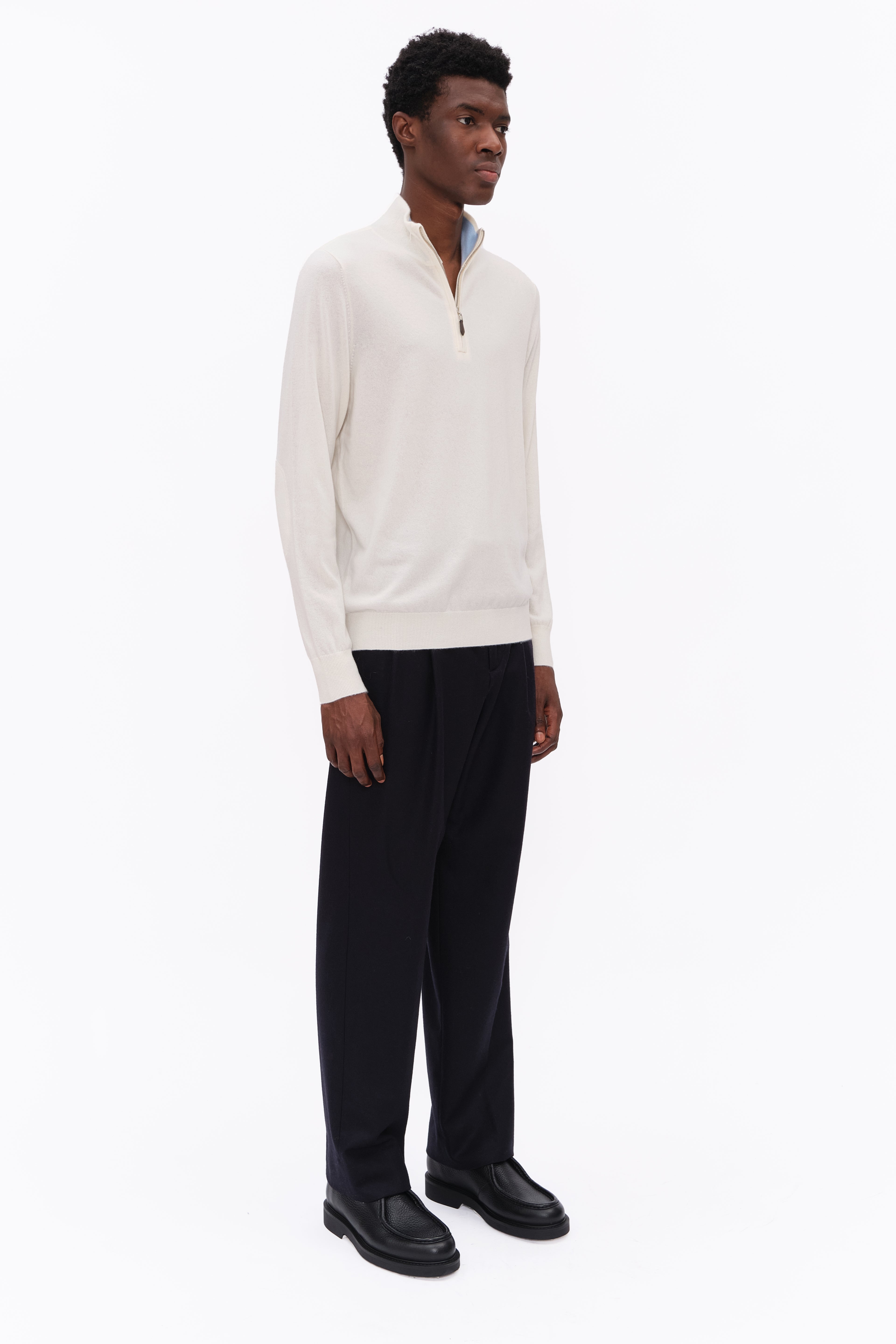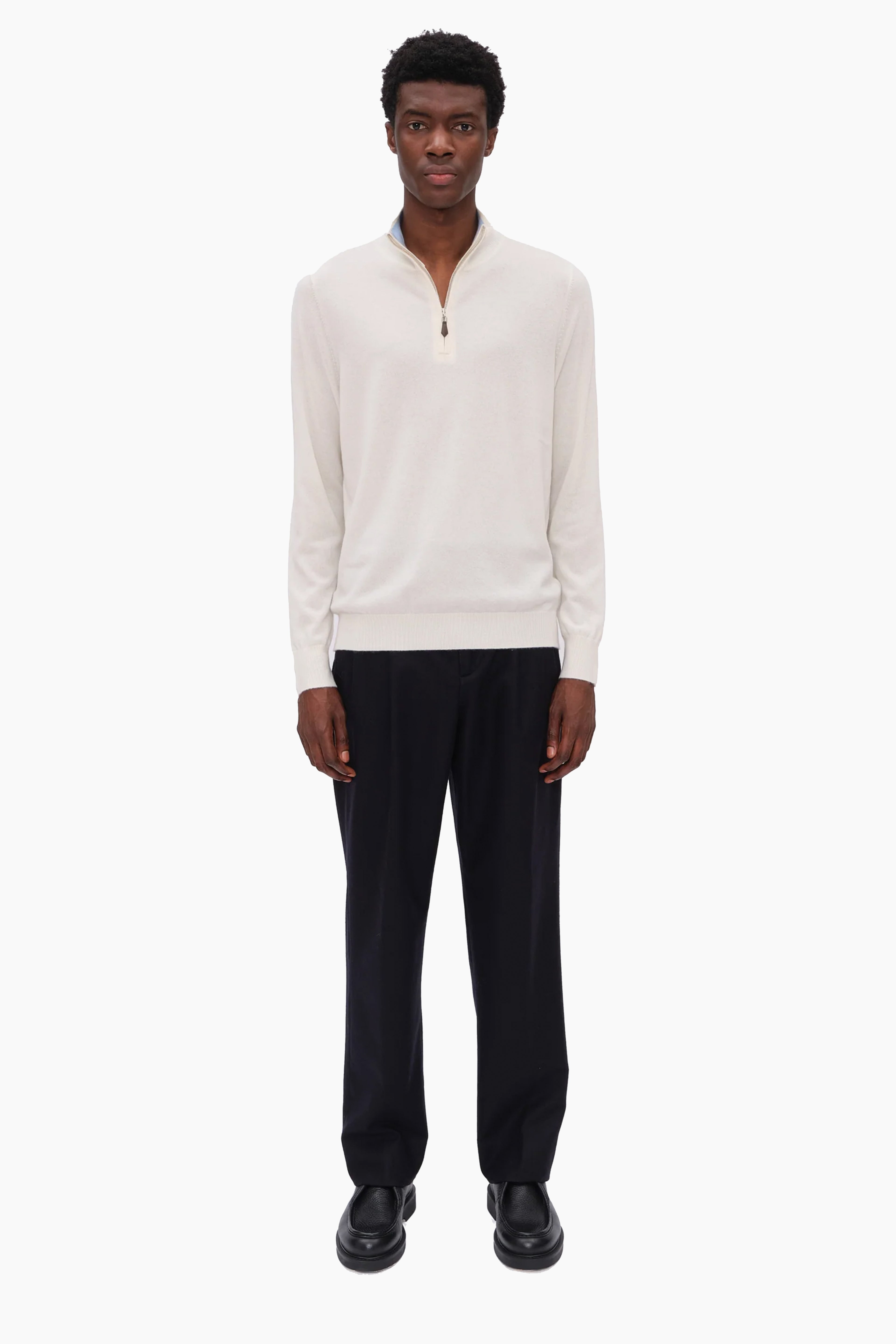 This half zip, in luxurious baby goat cashmere, carefully and sustainably selected for its exceptional lightweight softness. With fitted silhouette balanced by elegant long sleeves, perfect for layering or wearing on its own.