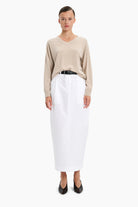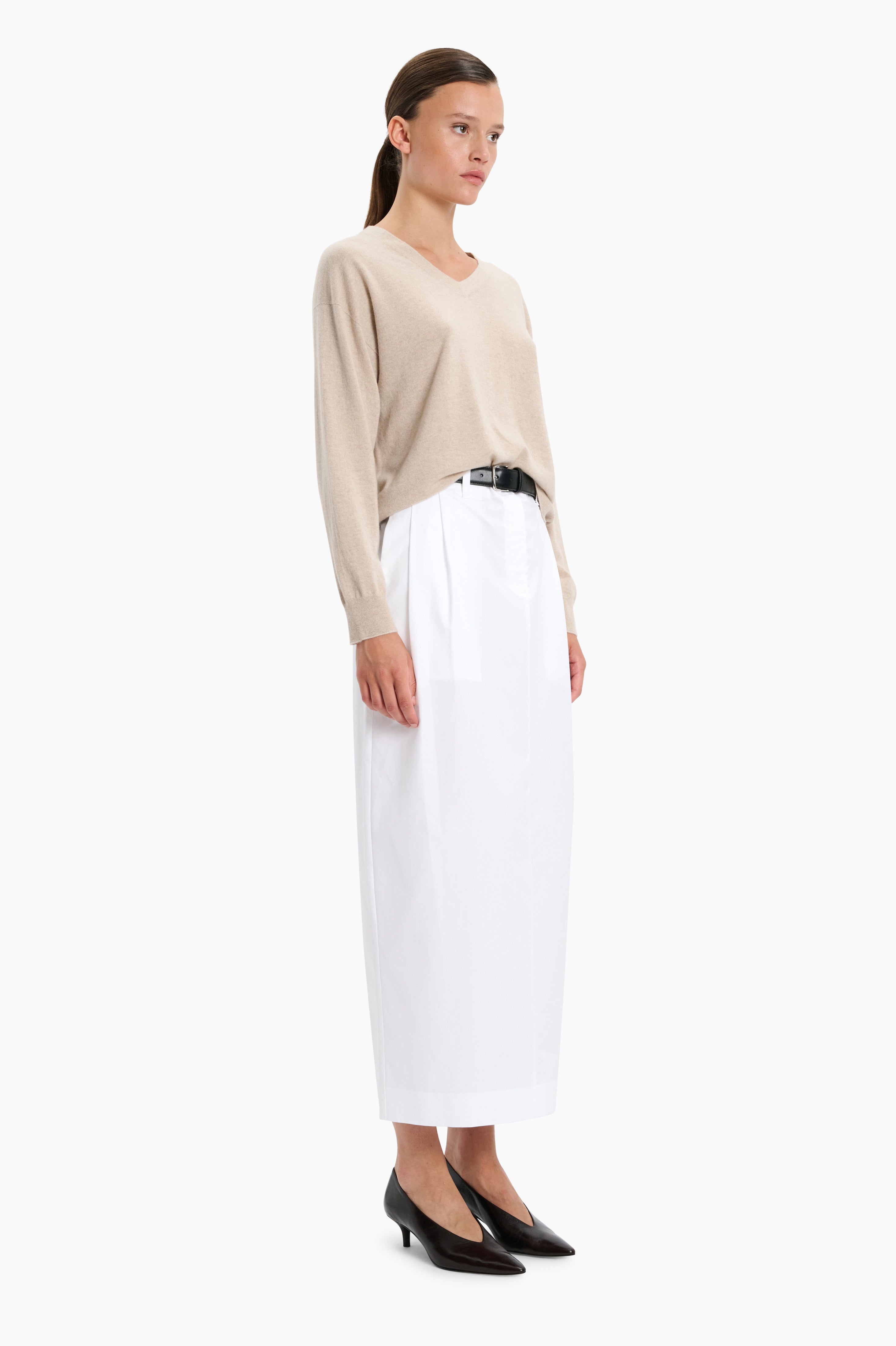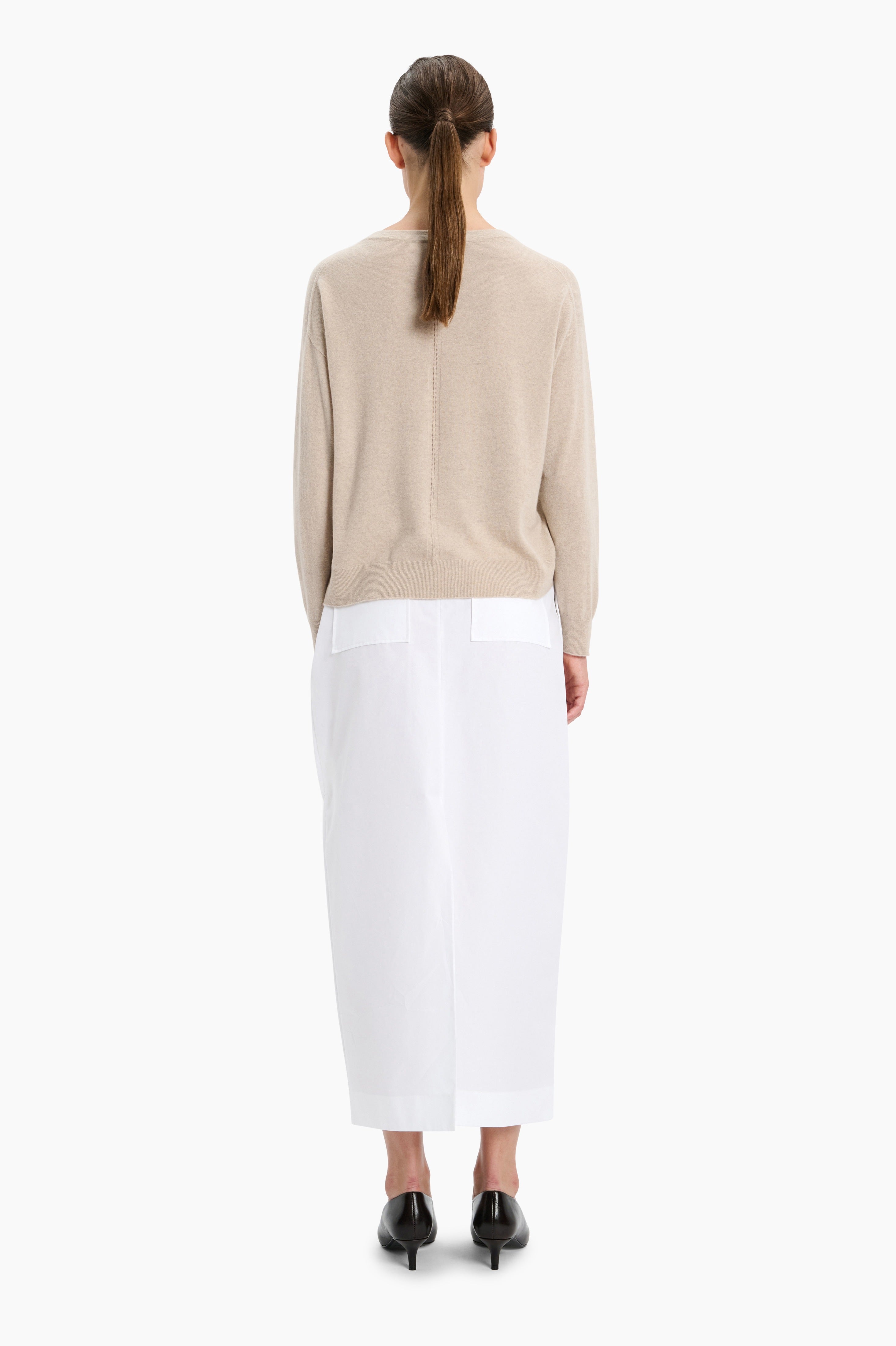 The Briony Top, in a beautifully soft baby goat cashmere knit, carefully and sustainably selected for its exceptional softness and refined texture. Featuring a relaxed silhouette with long sleeves and refined by a V neckline and back seam detailing, finished with clean trims.