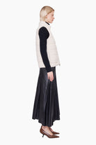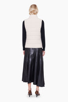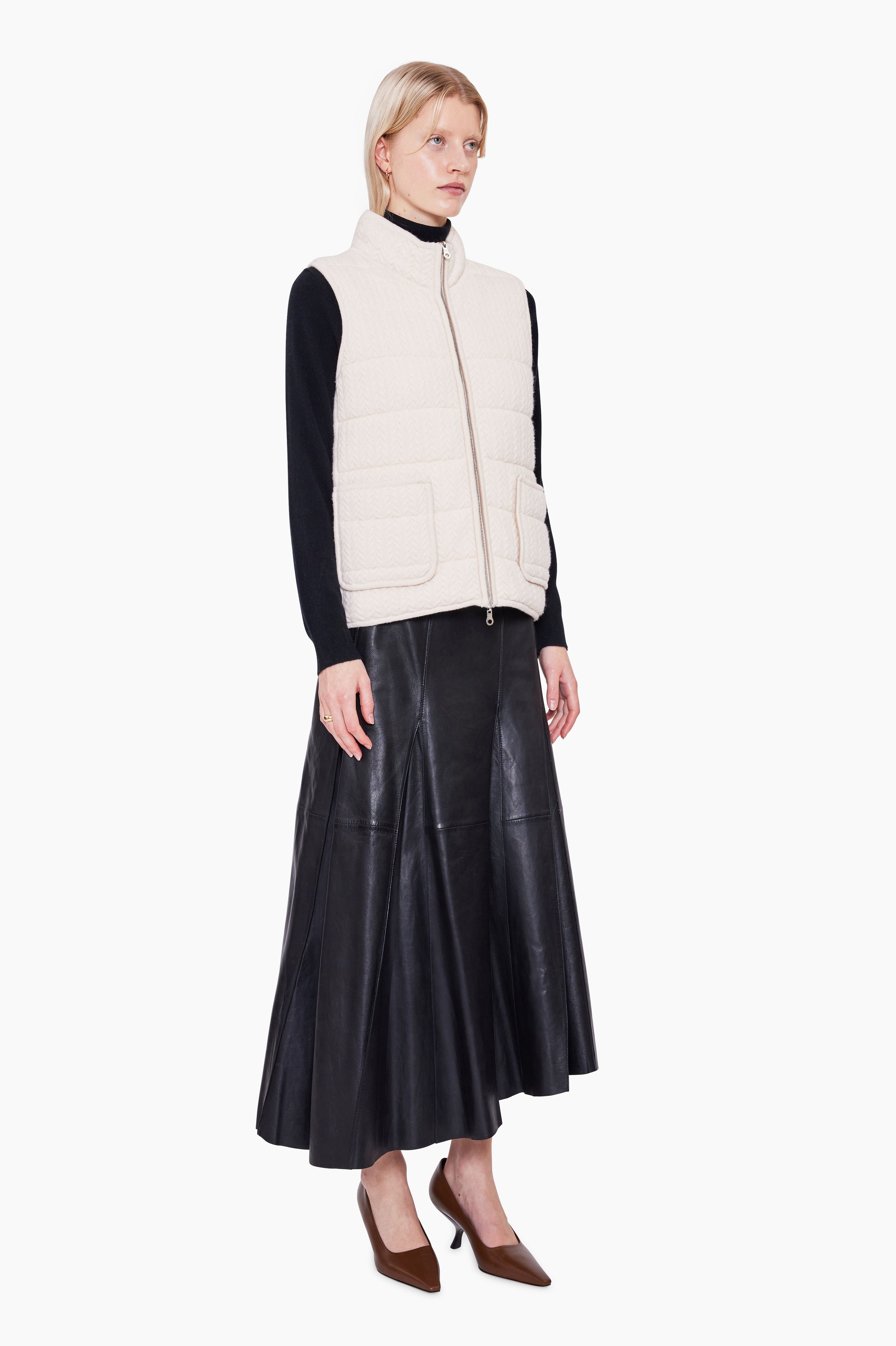 This quilted knit gilet, made from 100% cashmere, offers both versatility and luxury. Fully reversible, it allows you to choose between a soft ivory or a warm ecru colour to suit your style. Featuring a high neck and sleek neck closure, it provides both warmth and sophistication.