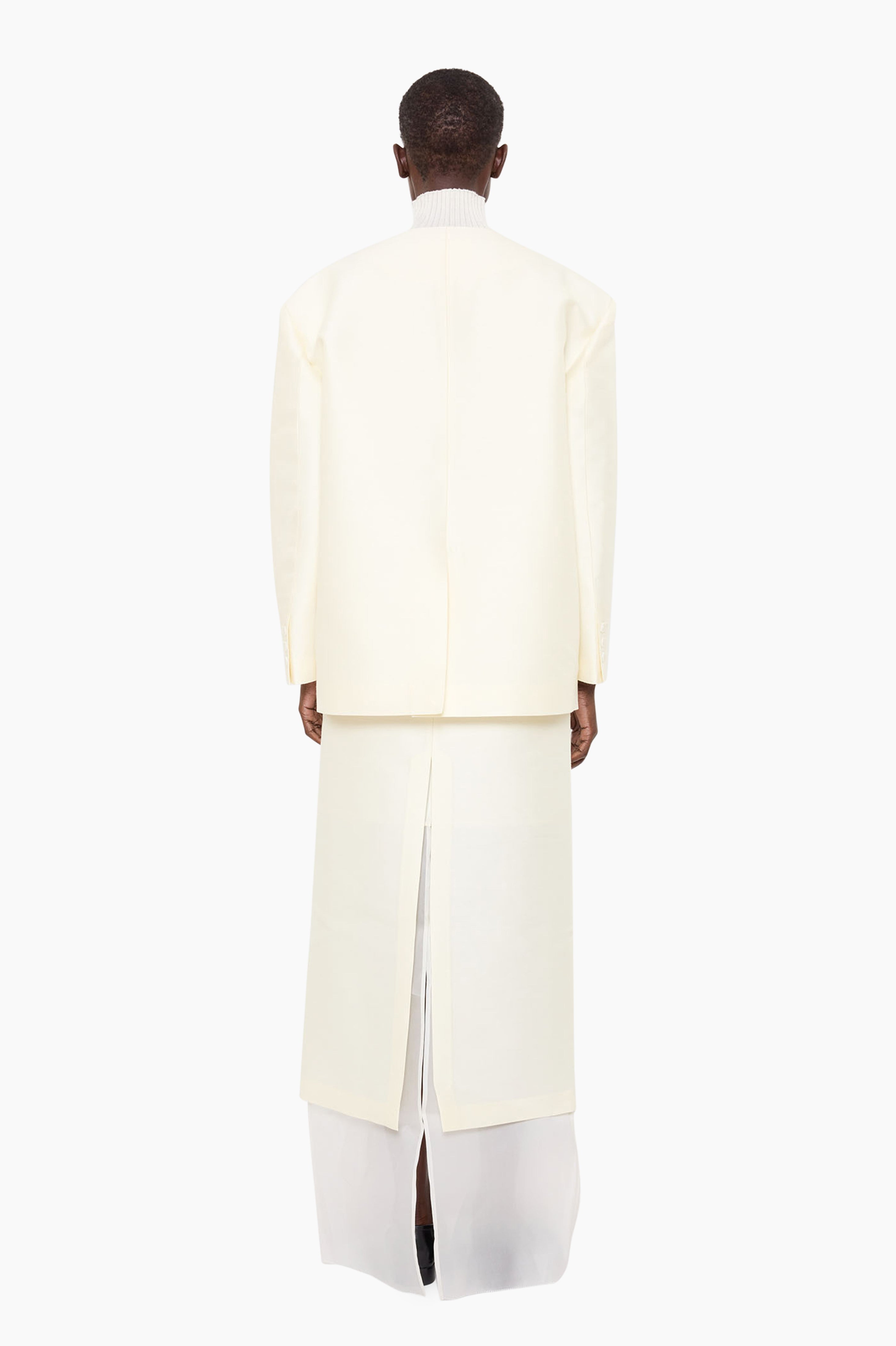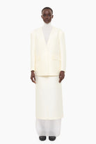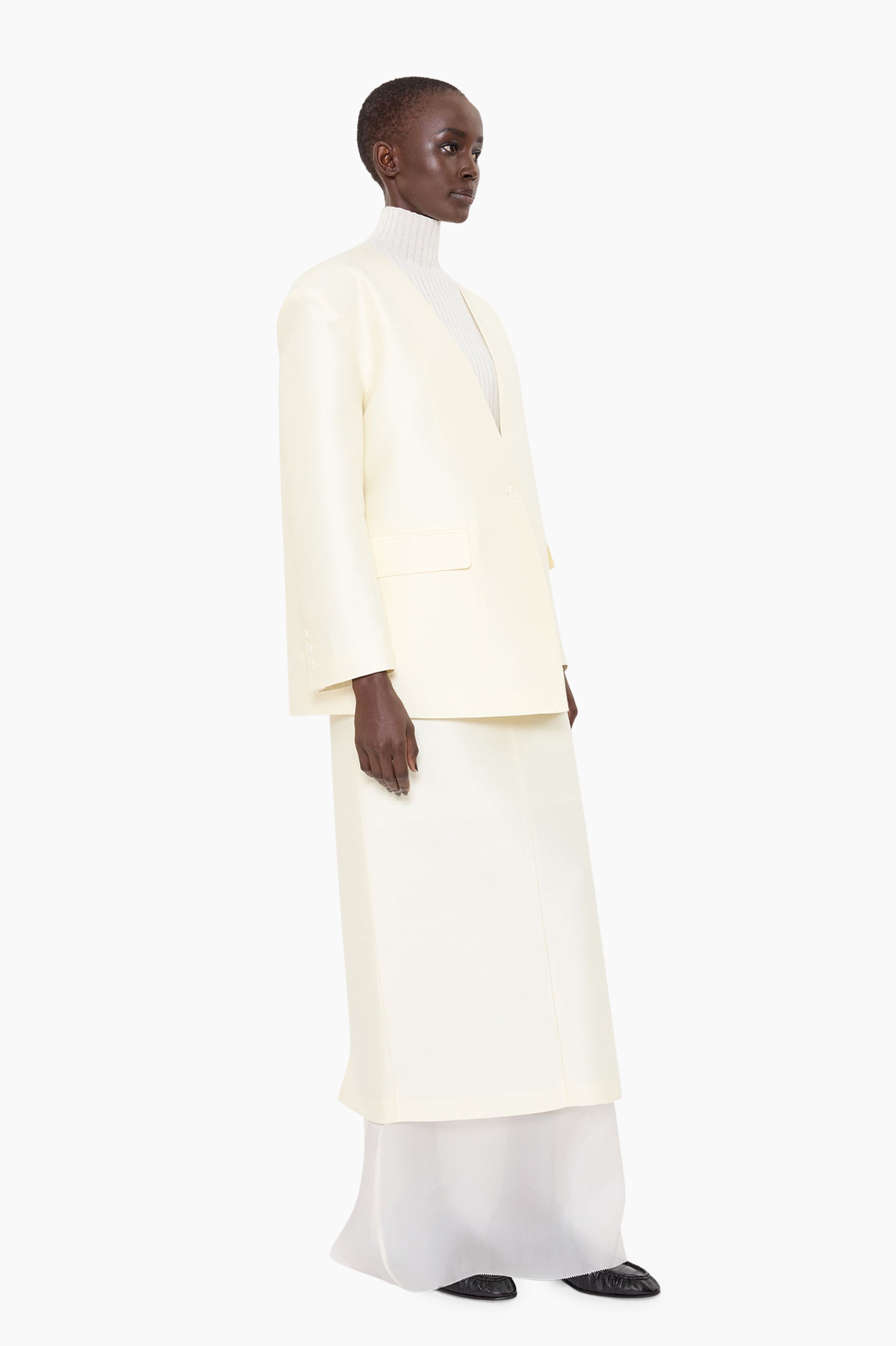 A softly tailored jacket crafted from a wool silk blend. Designed in a clean, relaxed silhouette, it features a deep V neckline, single-button fastening and flap pockets. The fabric offers a subtle sheen and refined drape, bringing a sense of lightness to classic tailoring for a modern, understated finish.