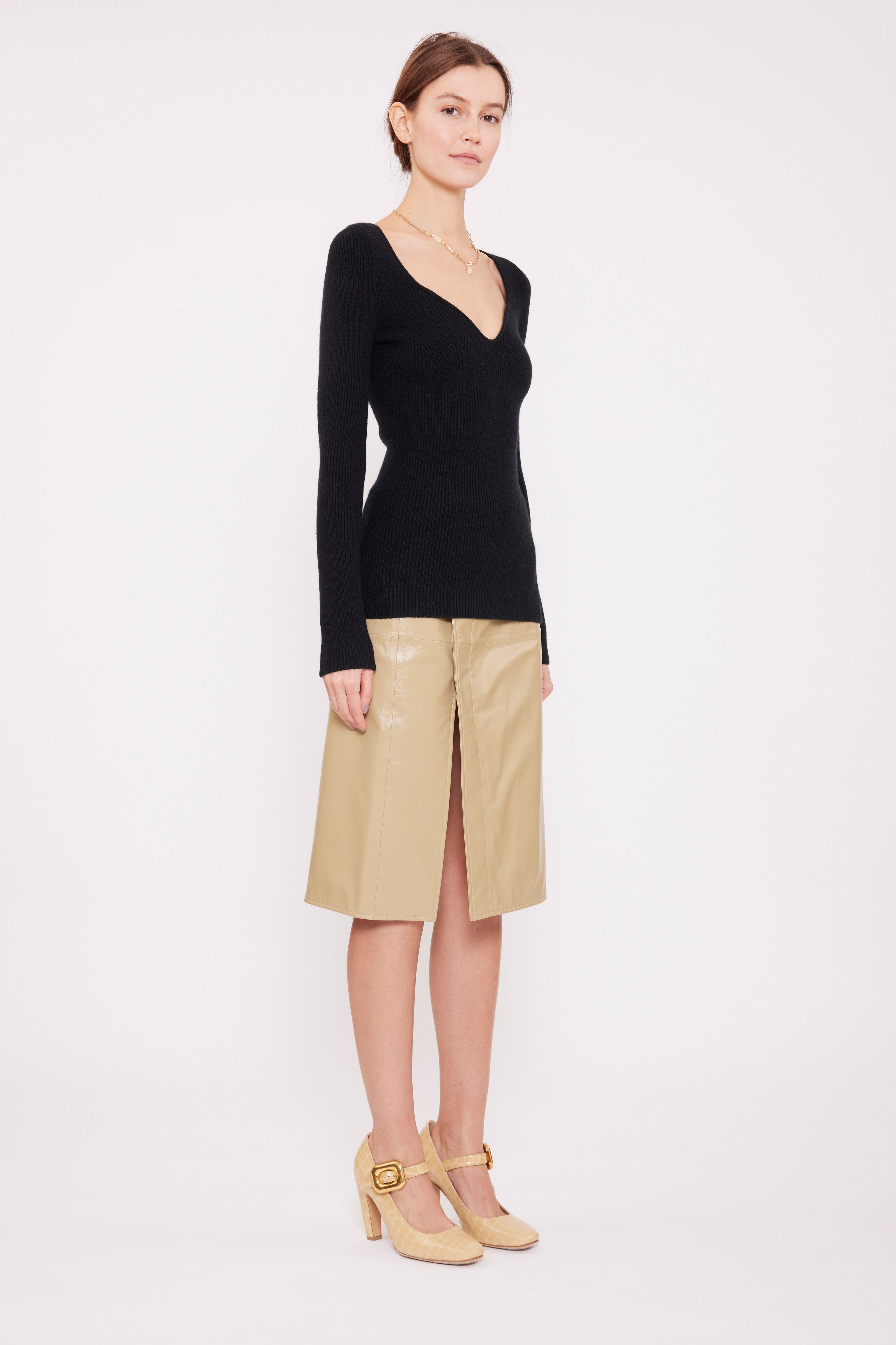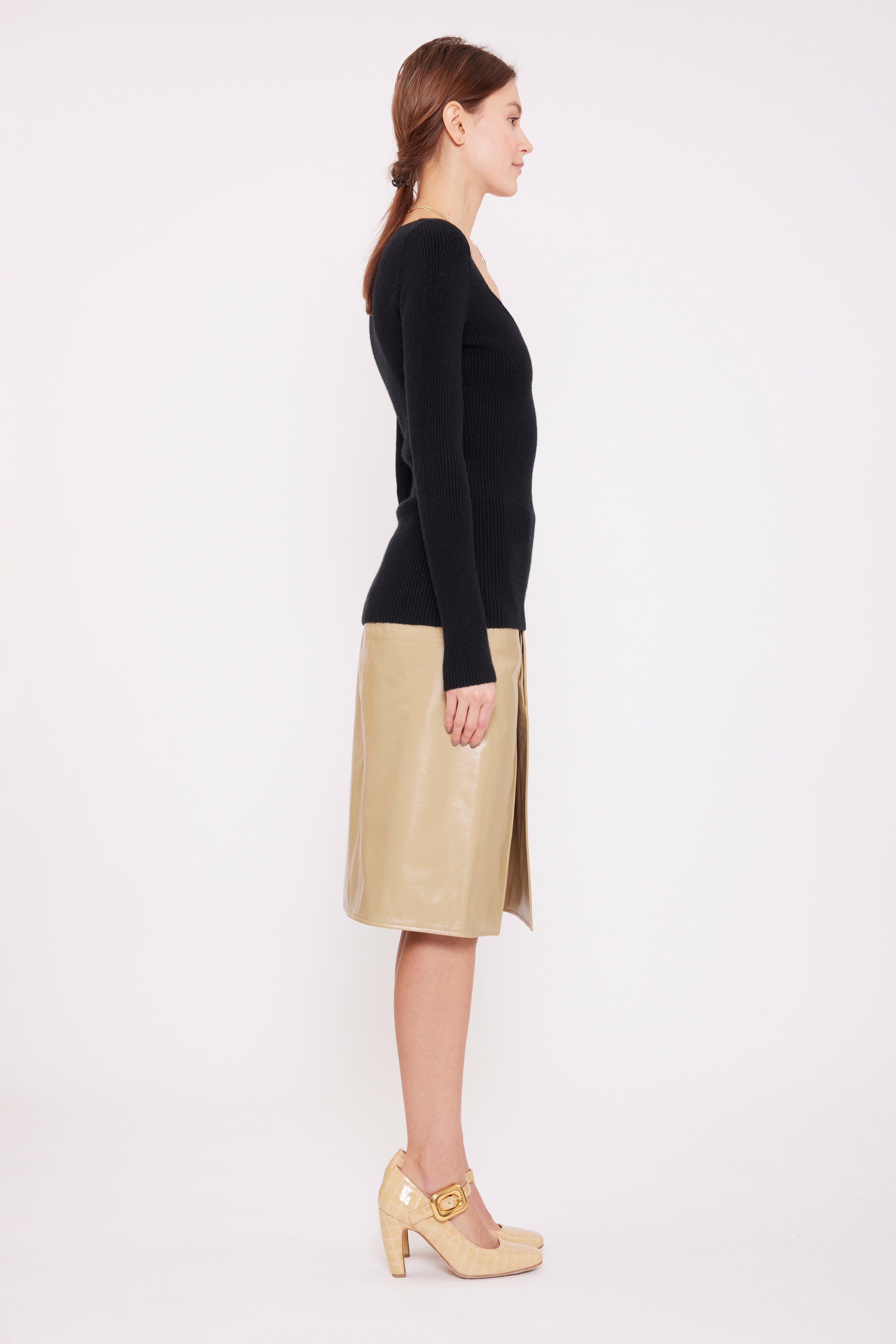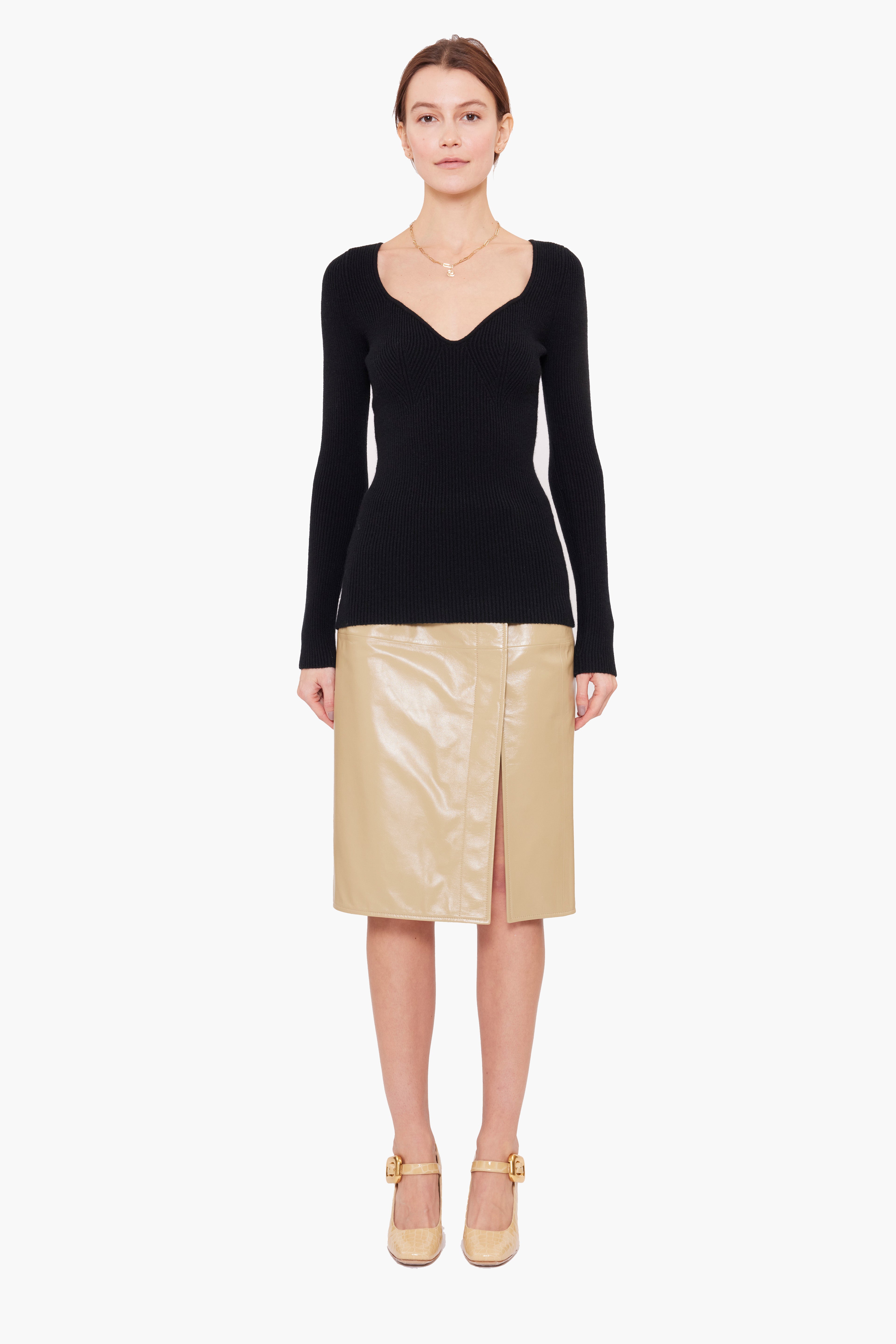 This unique long sleeve jumper, highlighted by a flattering sweetheart neckline, in luxurious stretchy knit cashmere, has been carefully and sustainably selected for its exceptional stretch and fabric recovery. It features fully fashioned seams and bust detail, with a refined, sexy but elegant silhouette.