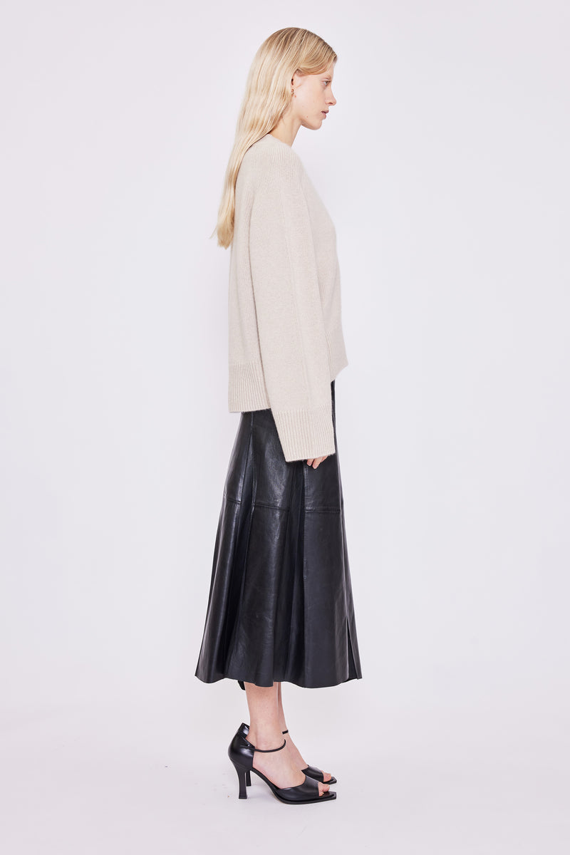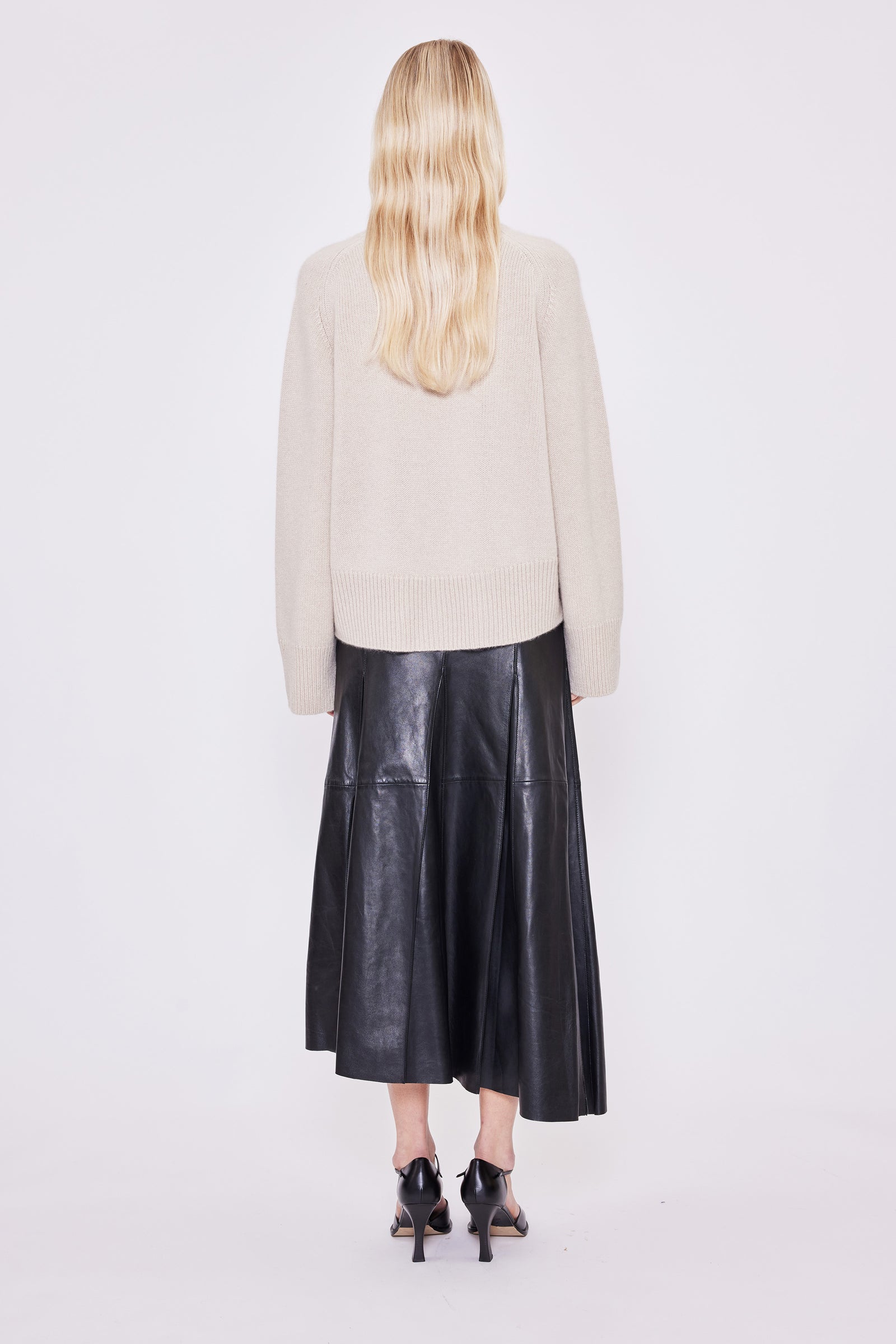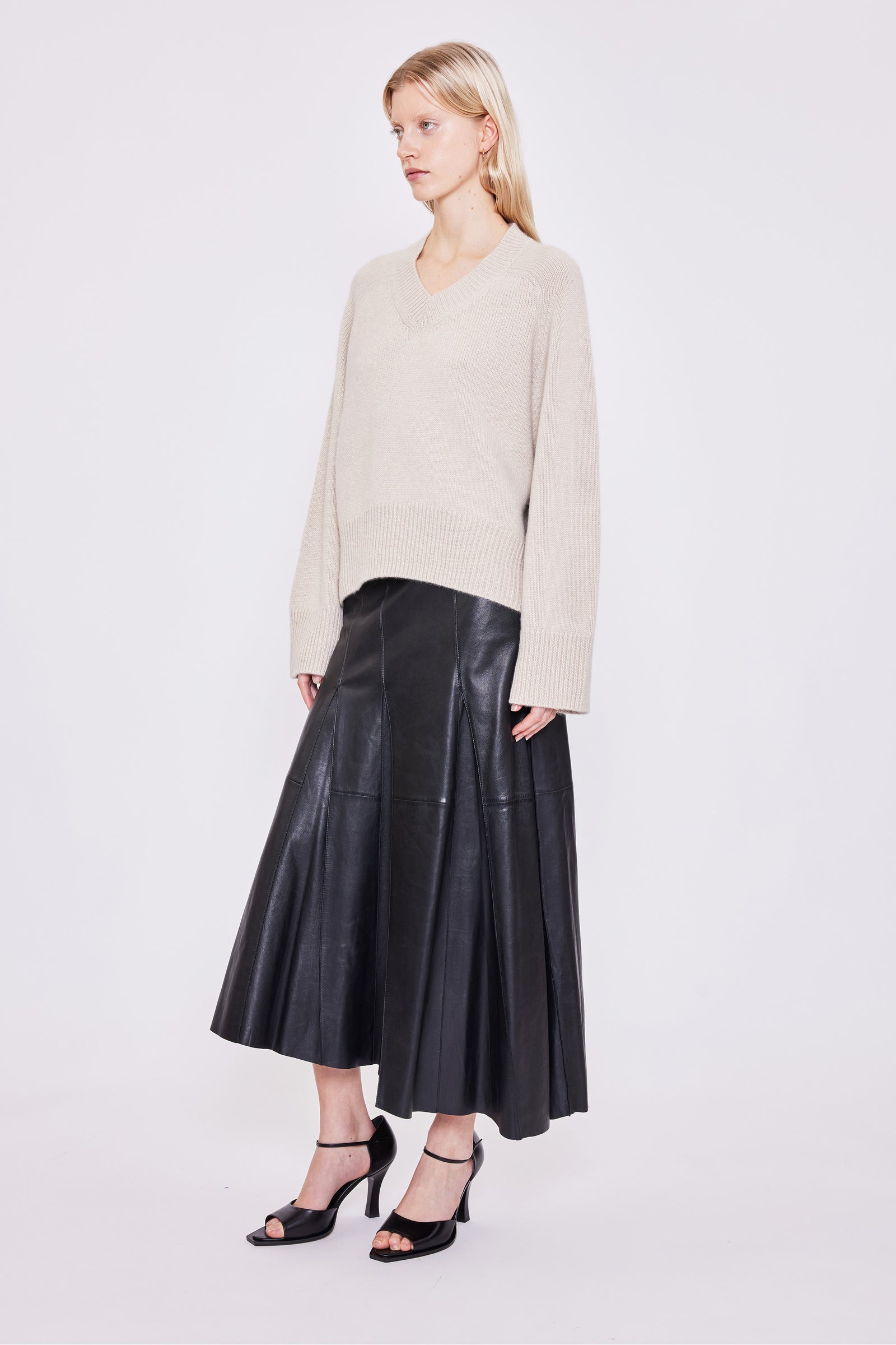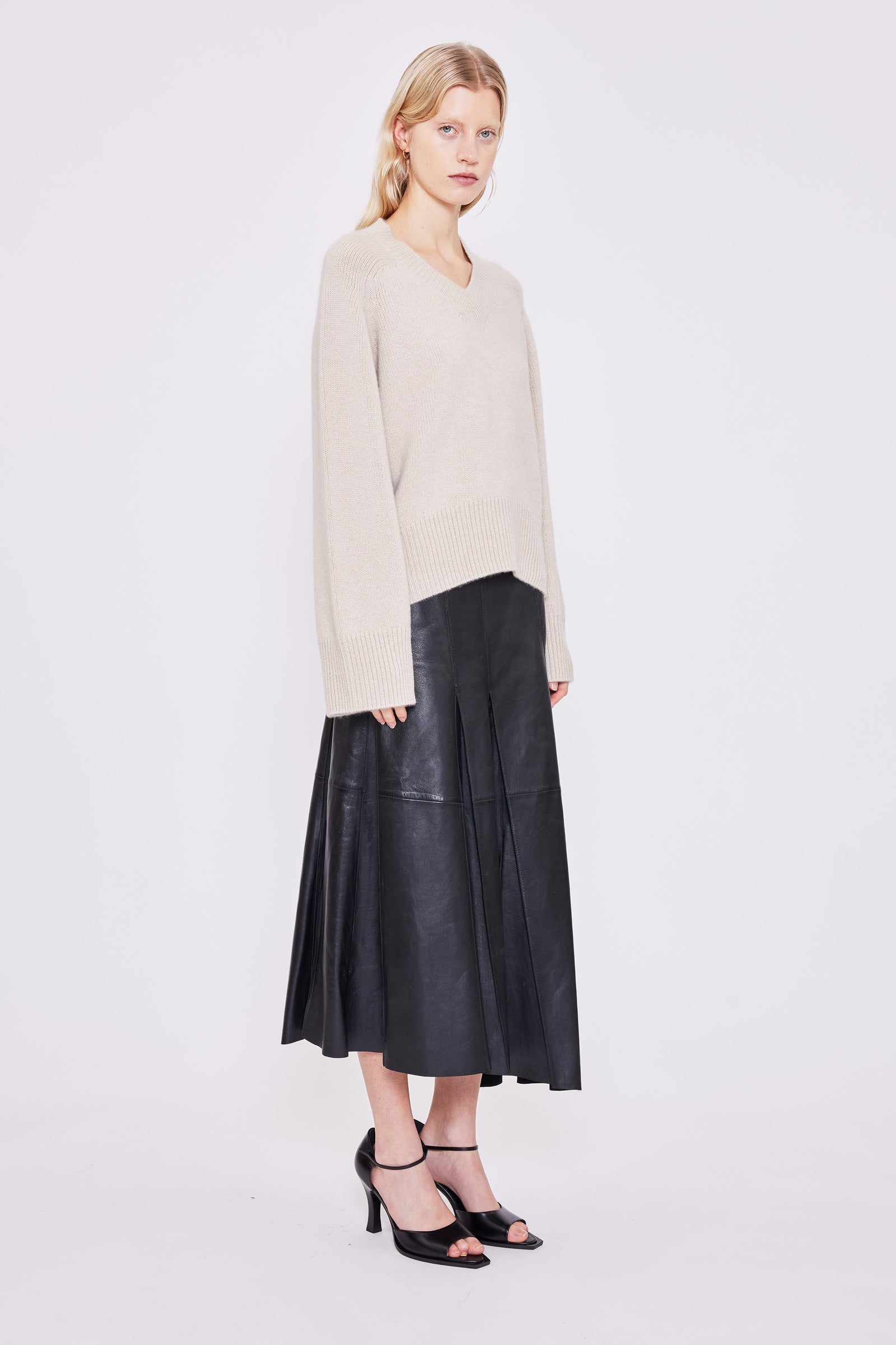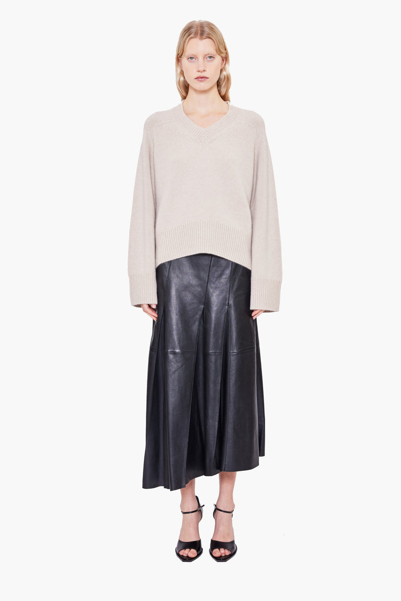 This v-neck jumper, in heavy-weight luxurious chunky knit cashmere, was carefully and sustainably selected for its exceptional softness and rich texture. Featuring fully fashioned seams, with a relaxed silhouette and accented with beautiful fisherman raglan seams. Refined by a ribbed neckline, cuffs and hem.
