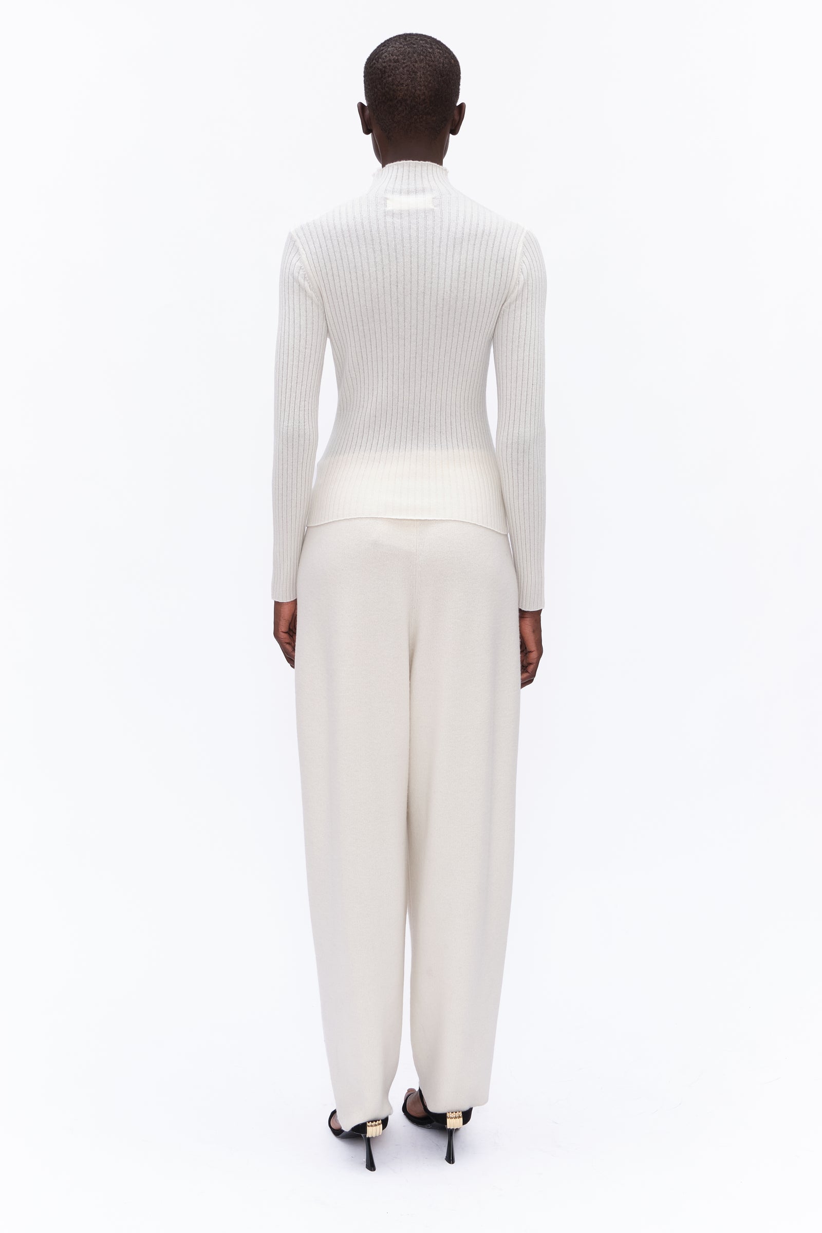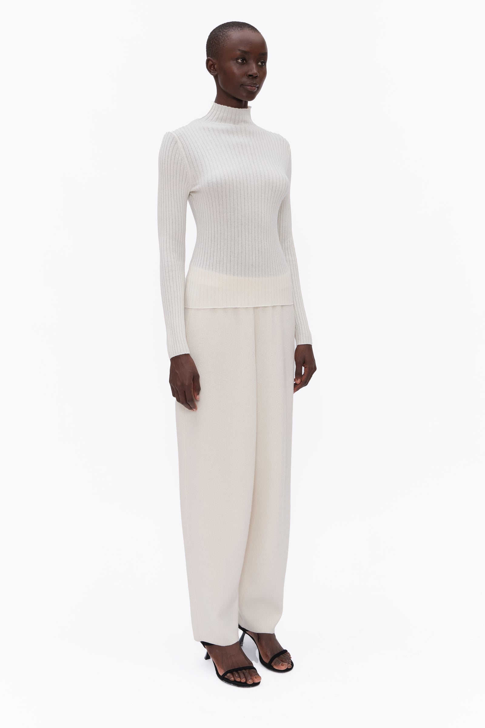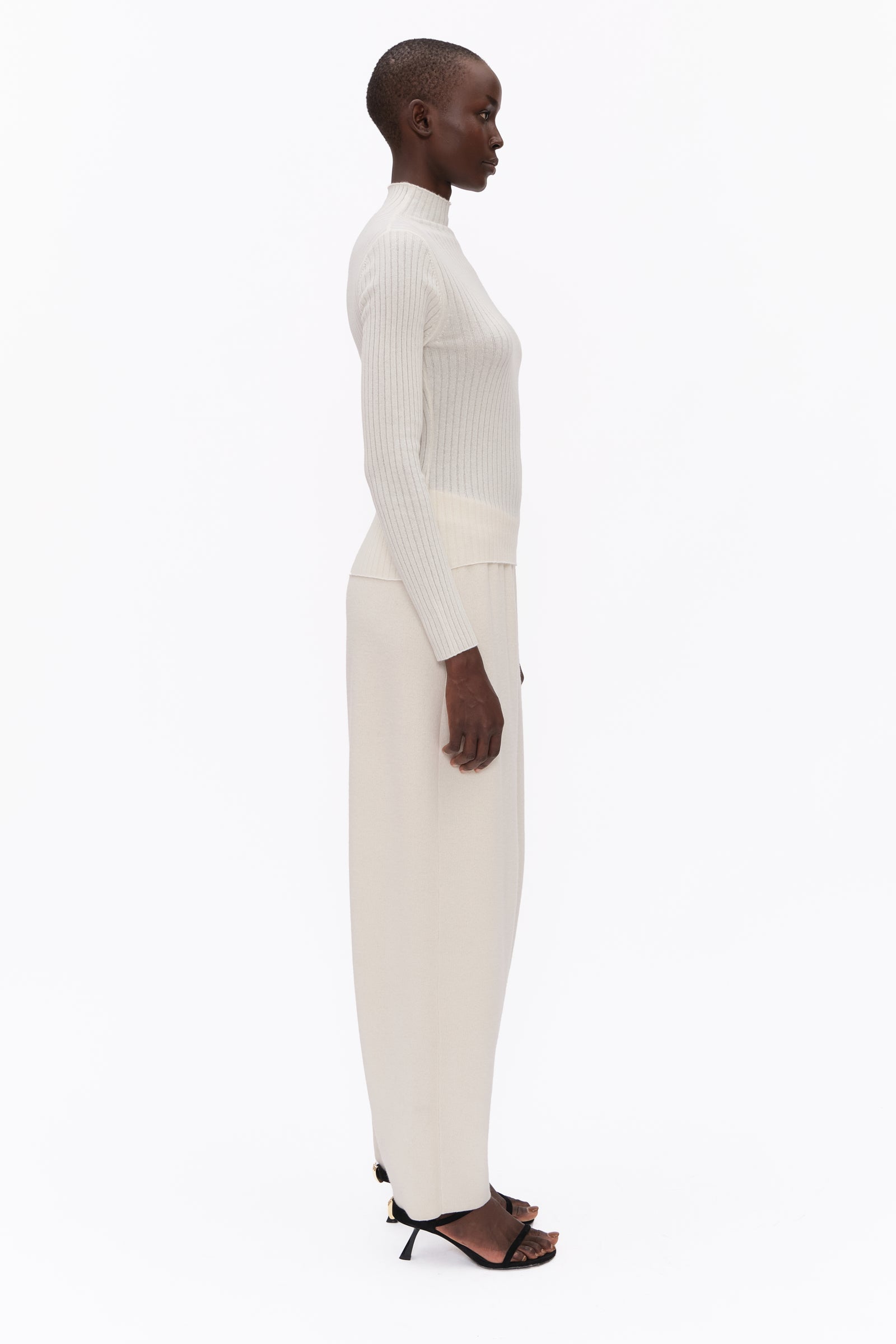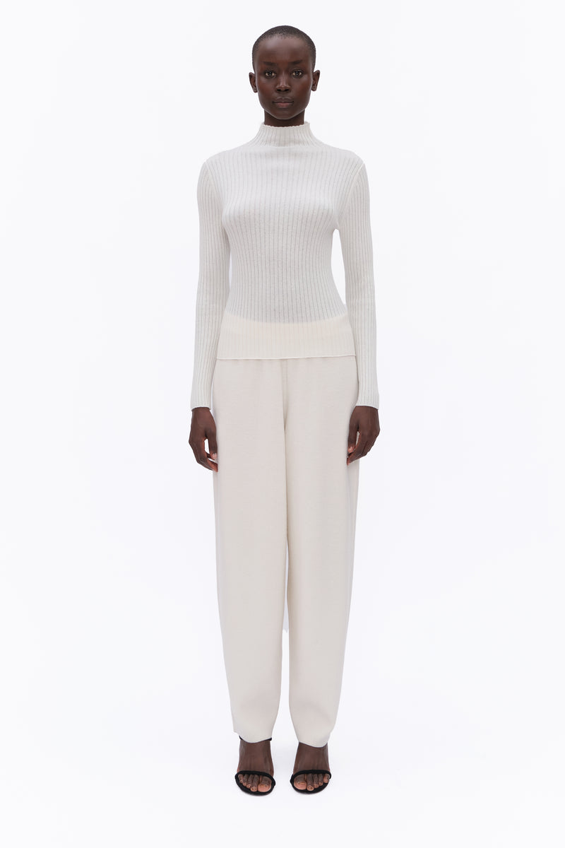 This half roll neck ribbed top, in luxurious baby goat cashmere, has been carefully and sustainably selected for its exceptional lightweight softness. It has a fitted silhouette balanced by long, elegant sleeves. 100% Baby goat cashmere.