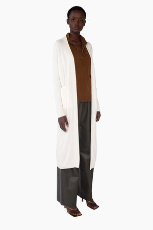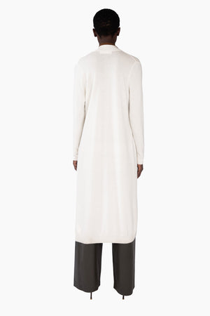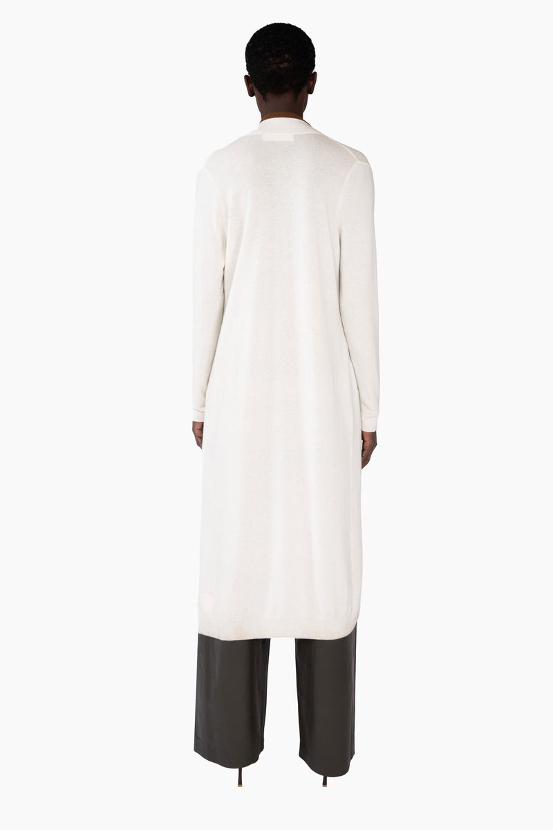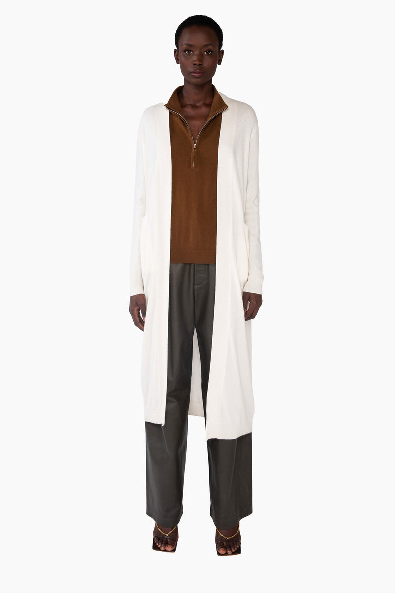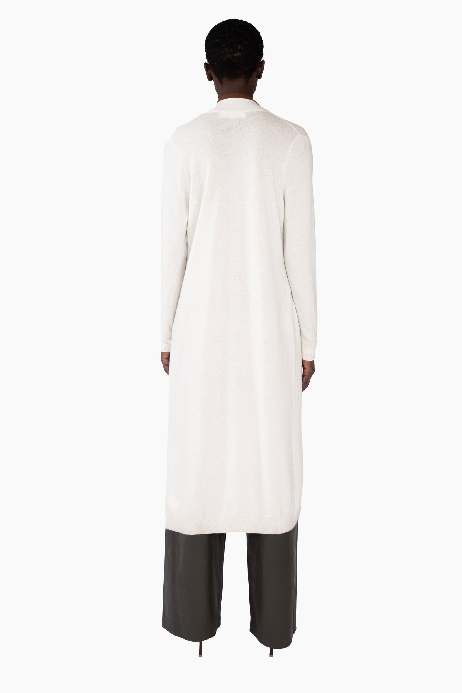 This open elongated cardigan, in luxurious baby goat cashmere, carefully and sustainably selected for its exceptional lightweight softness. With a fitted silhouette and elegant high pockets balanced with long slim sleeves.