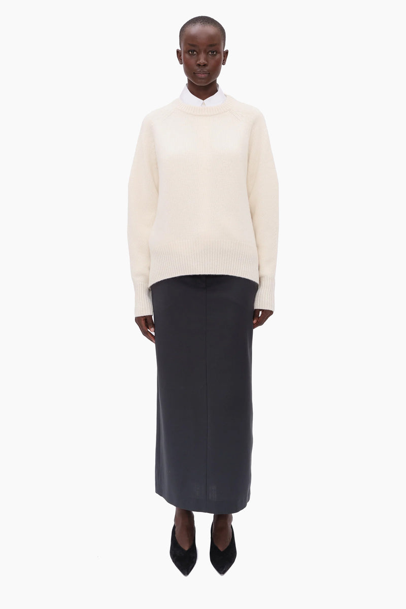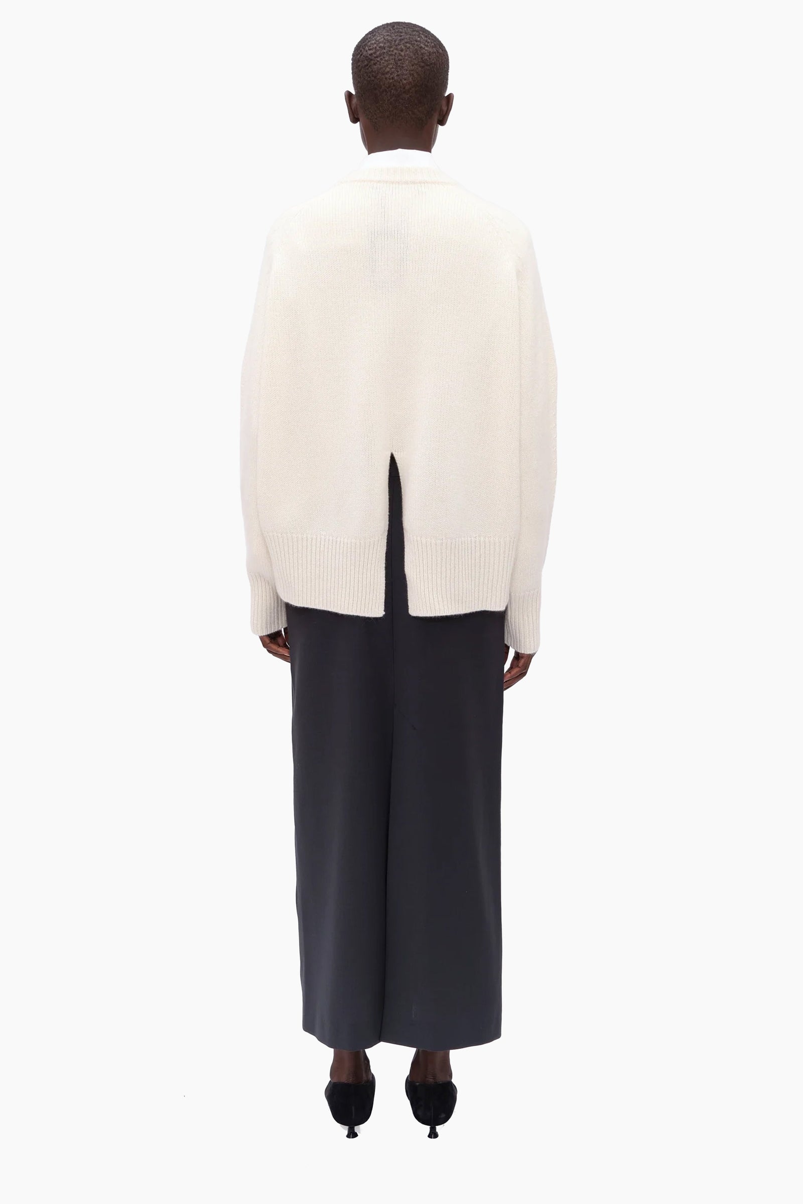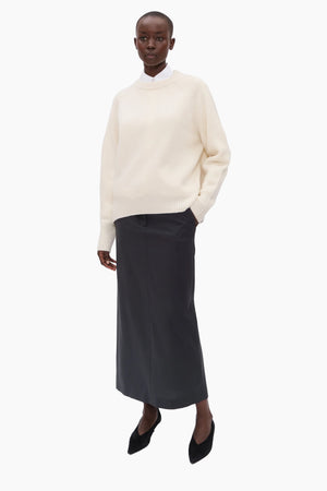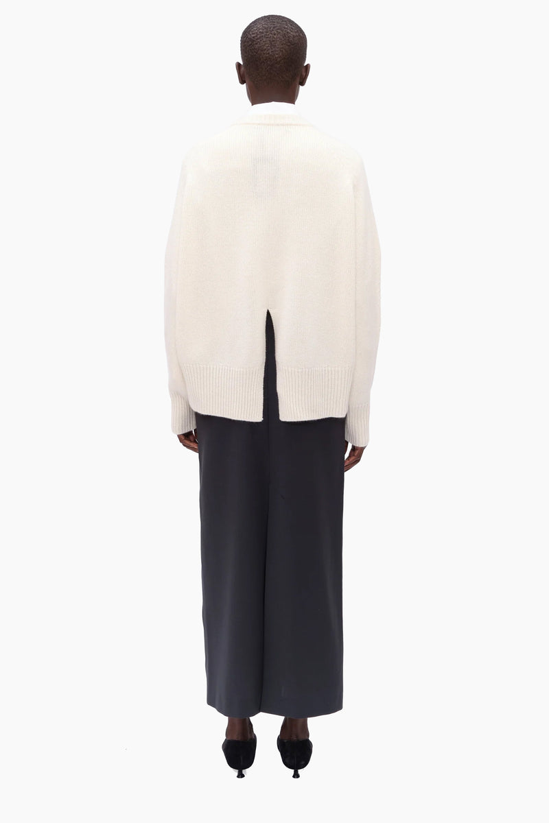 This crew neck jumper, in heavy weight luxurious chunky knit cashmere, carefully and sustainably selected for its exceptional softness and rich texture. Featuring fully fashioned seams, with a one-size-fits-all, oversized silhouette, refined by a ribbed neckline, cuffs and high-low hem. Accented with a central back split.