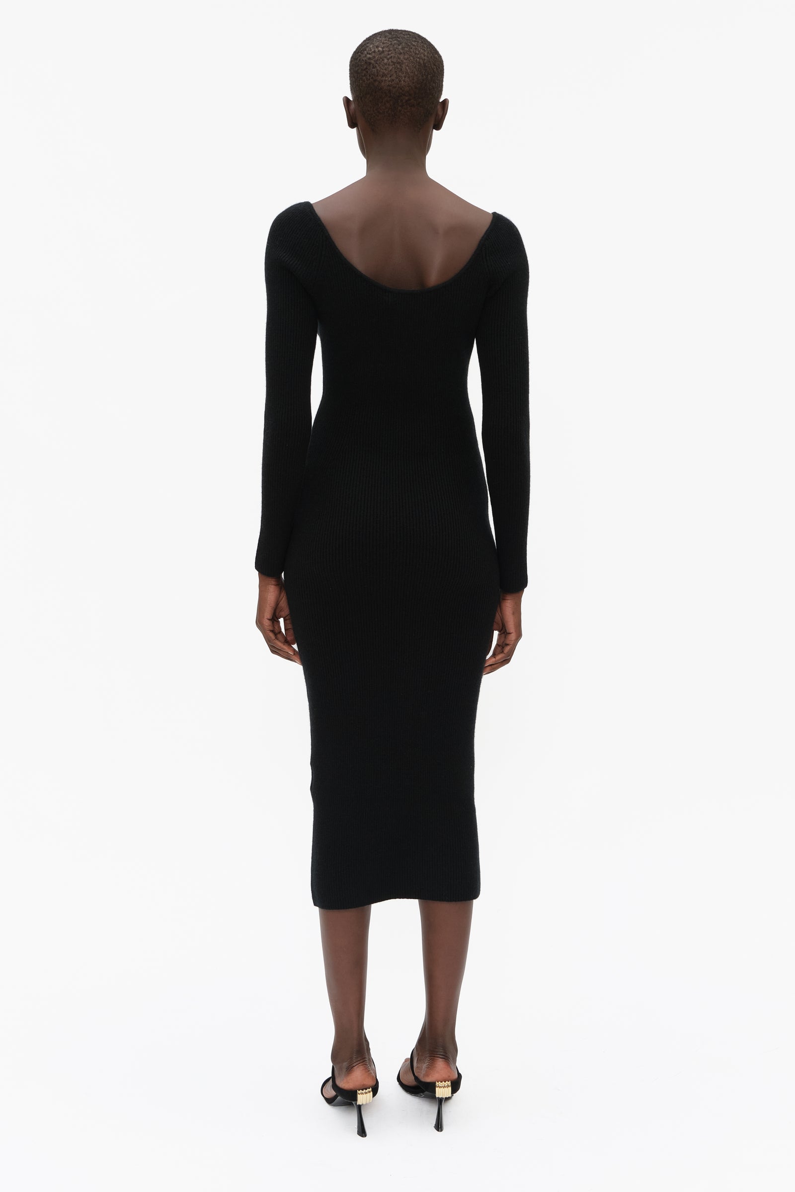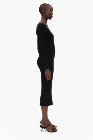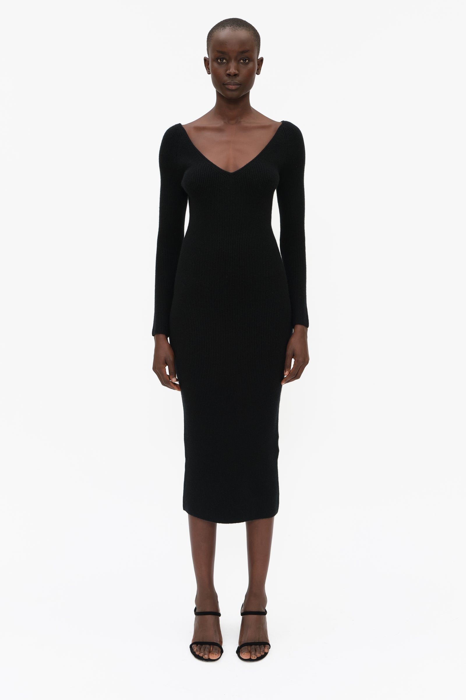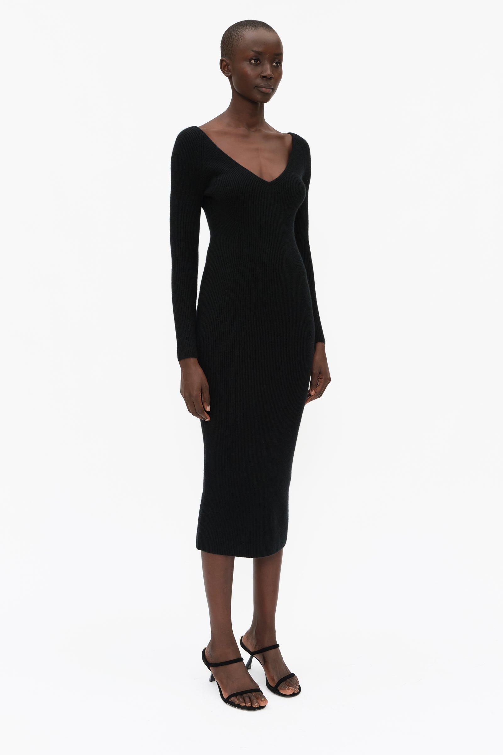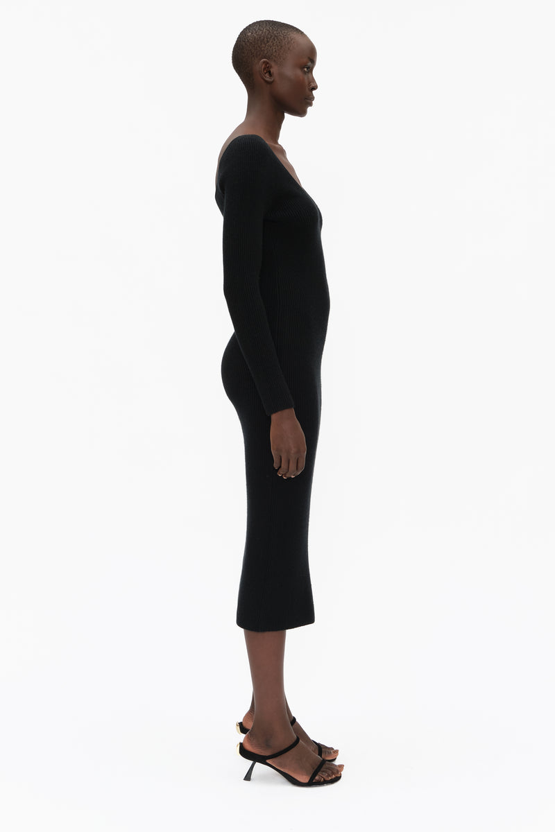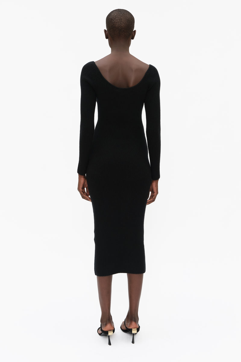 This unique long sleeve dress, highlighted by a flattering V-neck, in luxurious stretchy knit cashmere, has been carefully and sustainably selected for its exceptional stretch and fabric recovery. It features fully fashioned seams and bust detail, with a refined sexy, but elegant silhouette.