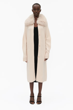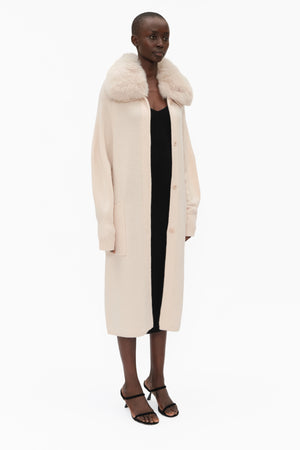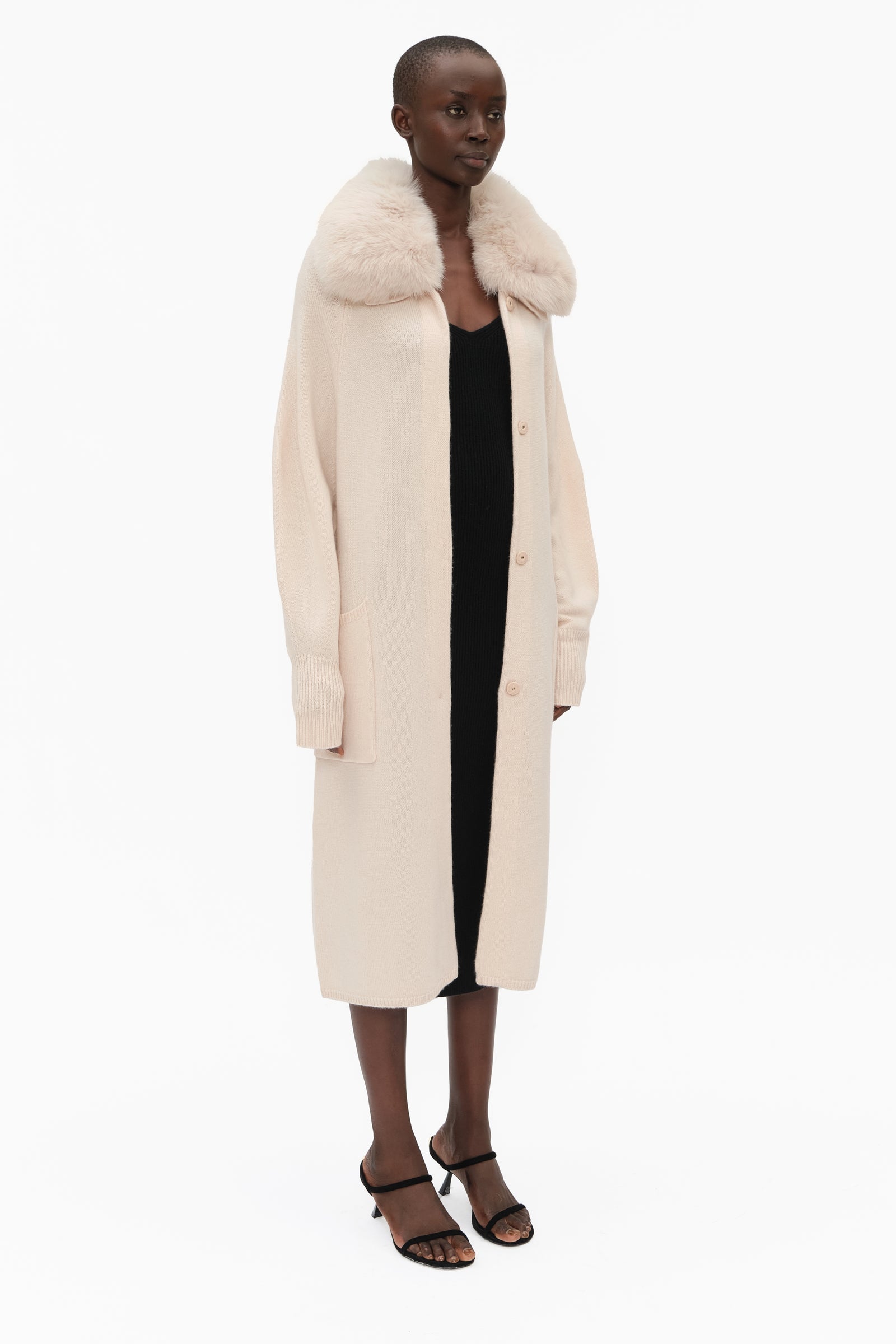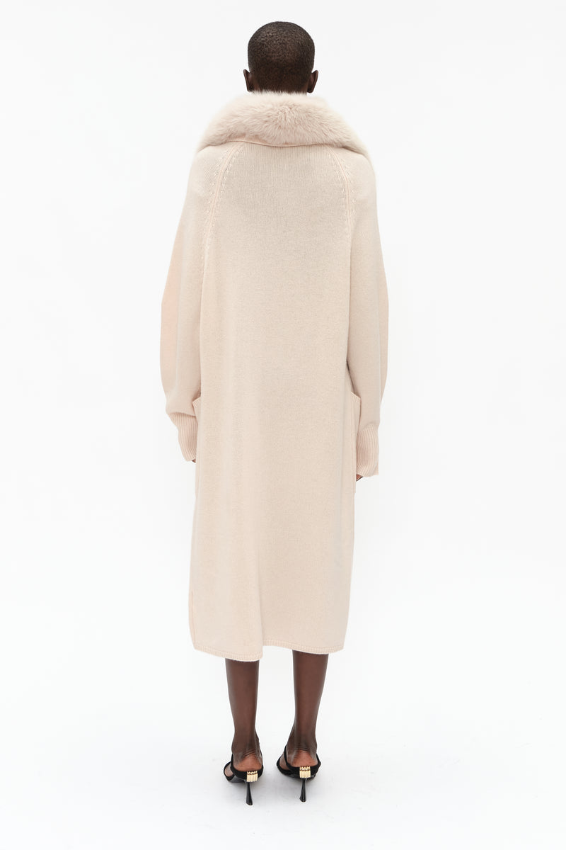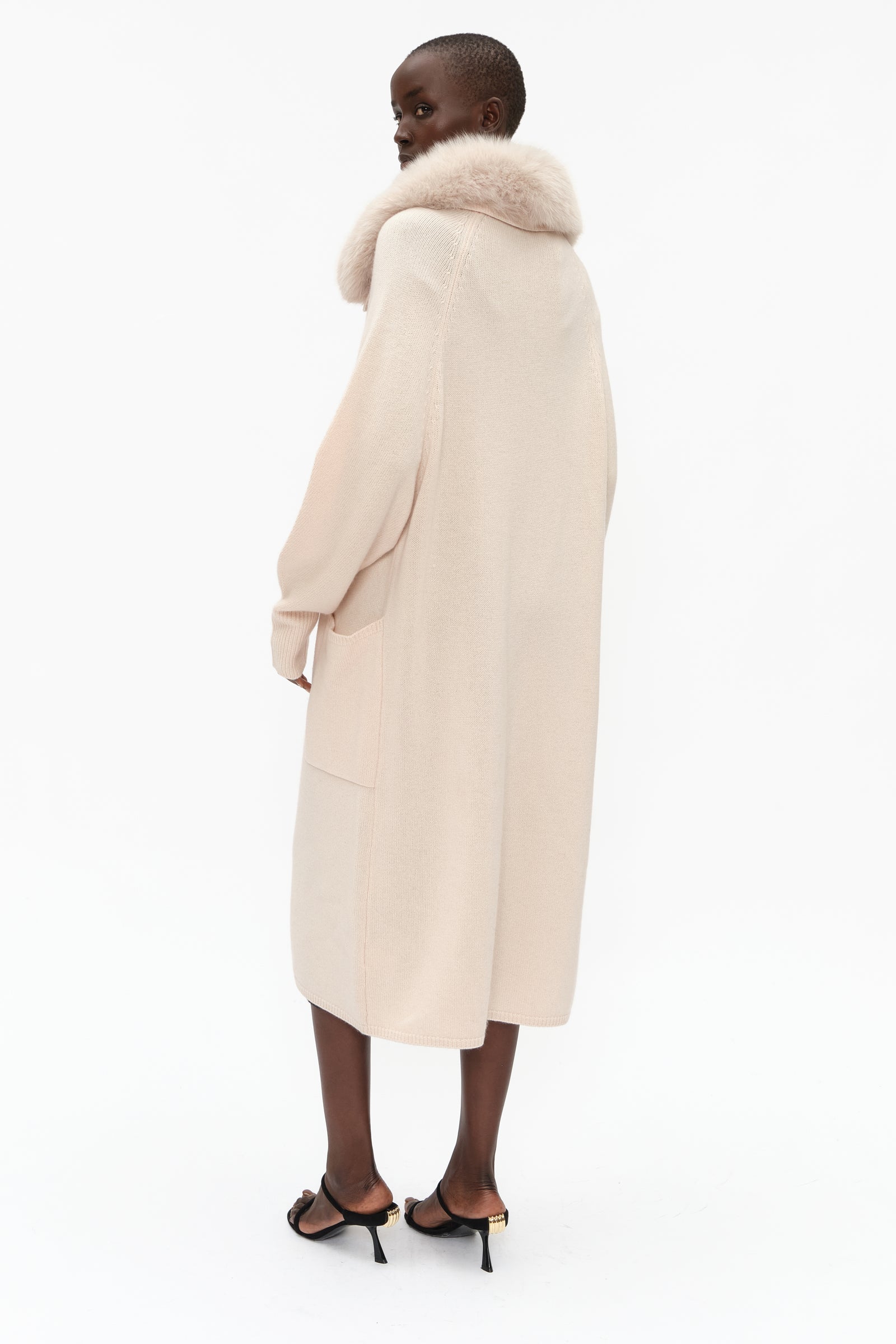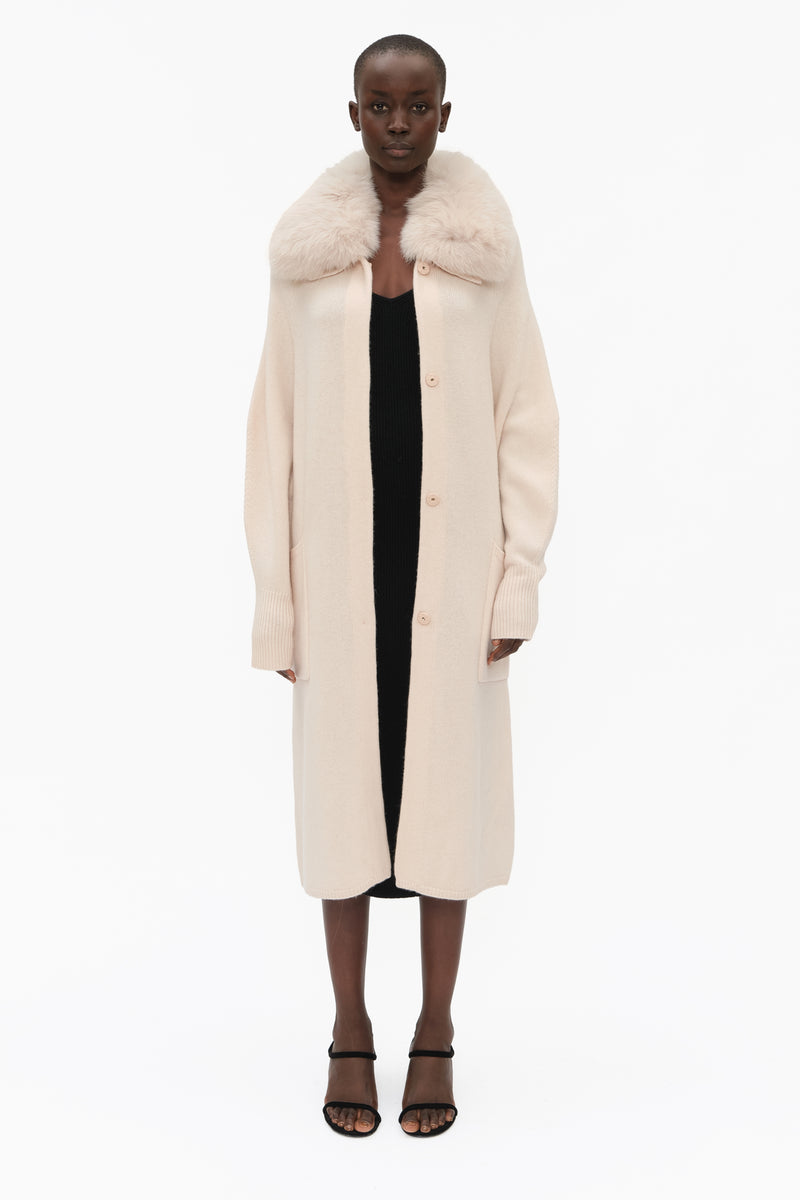Introducing the Cadogan: A fur-collared cardigan, in heavy weight luxurious chunky knit cashmere, carefully and sustainably selected for its exceptional softness and rich texture. Featuring fully functional pockets, a relaxed silhouette balanced by beautiful long sleeves, fur collar and refined by ribbed cuffs and hem.