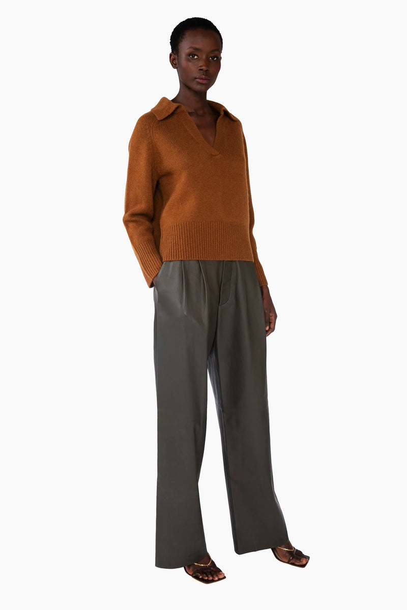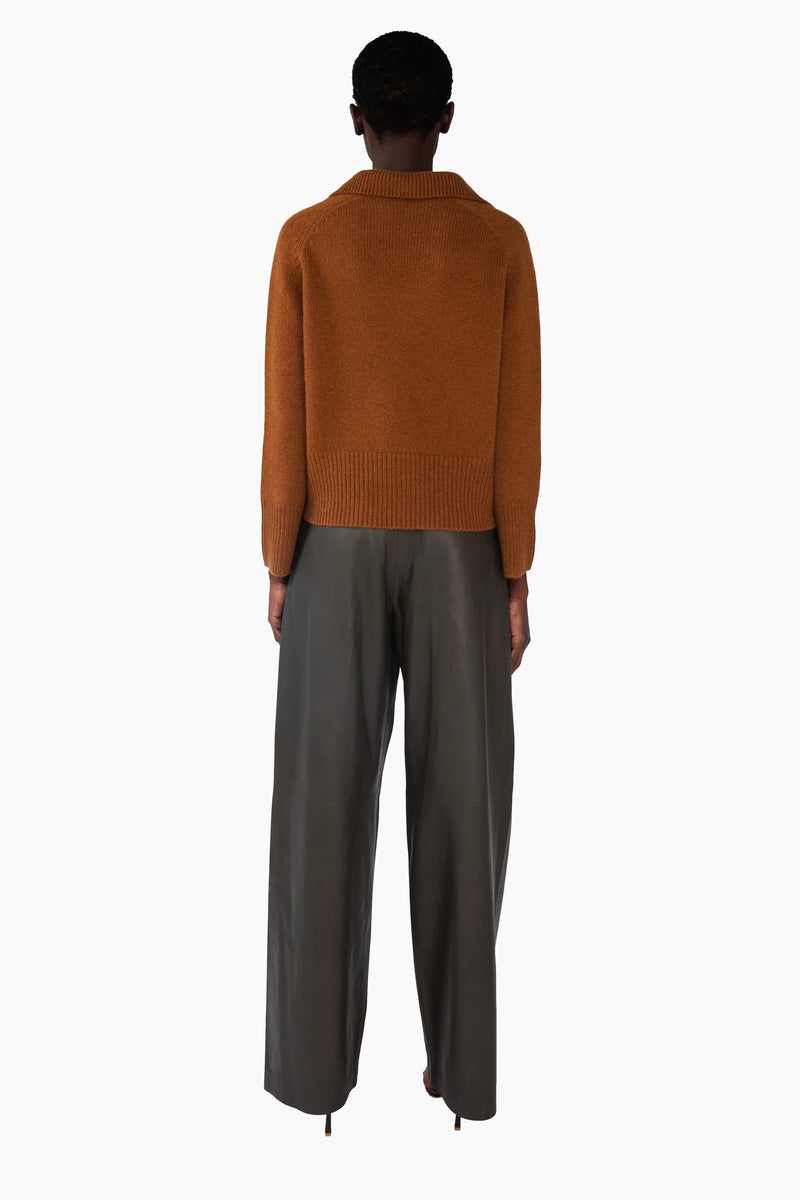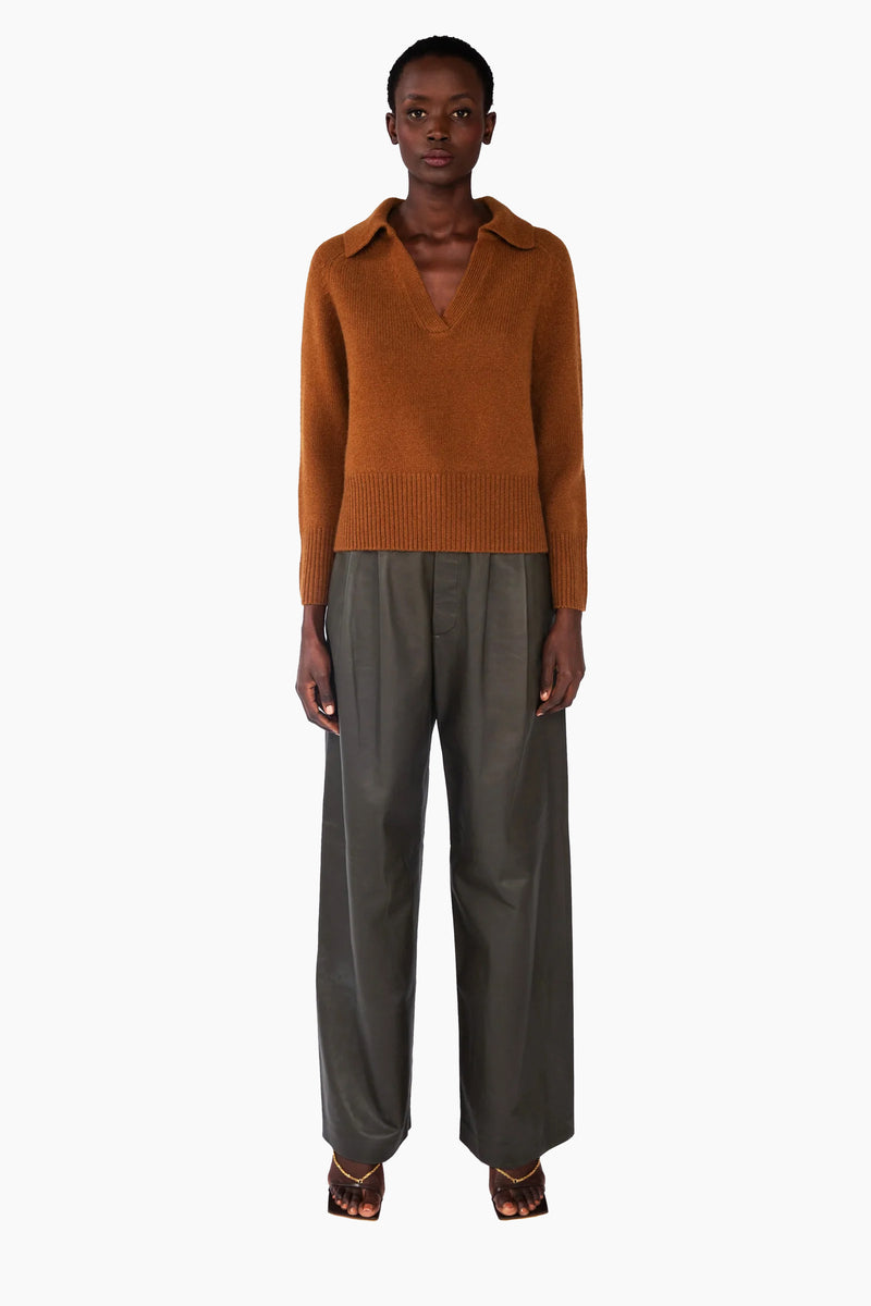 This V-neck collared jumper, in heavy-weight luxurious chunky knit cashmere, has been carefully and sustainably selected for its exceptional softness and rich texture. Featuring fully fashioned seams, with a relaxed cropped silhouette balanced by beautiful raglan sleeves, an oversized collar and refined by ribbed cuffs and hem.