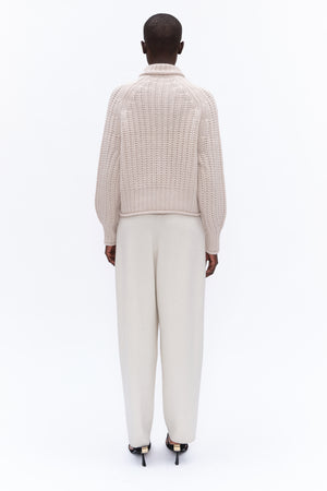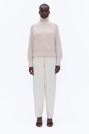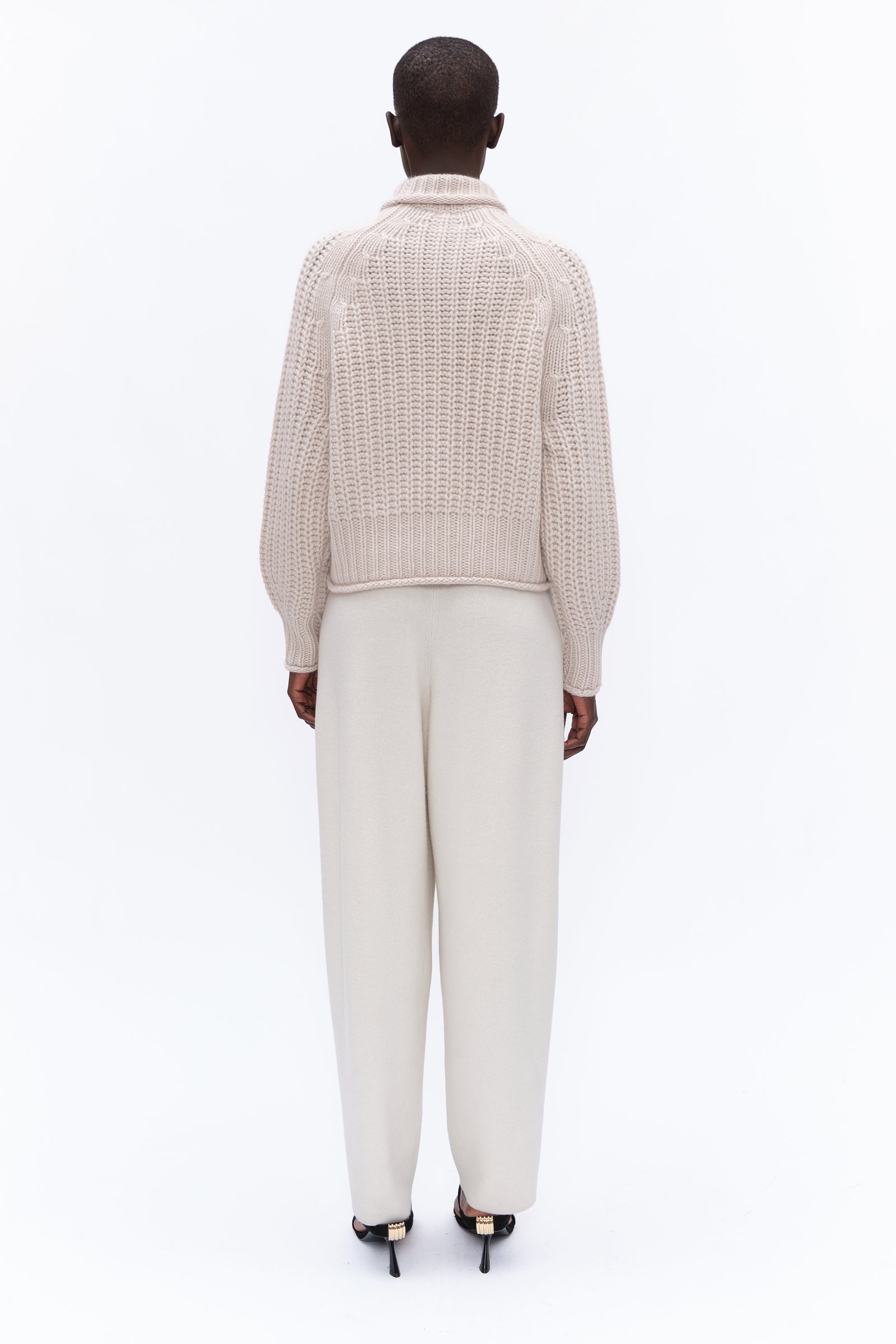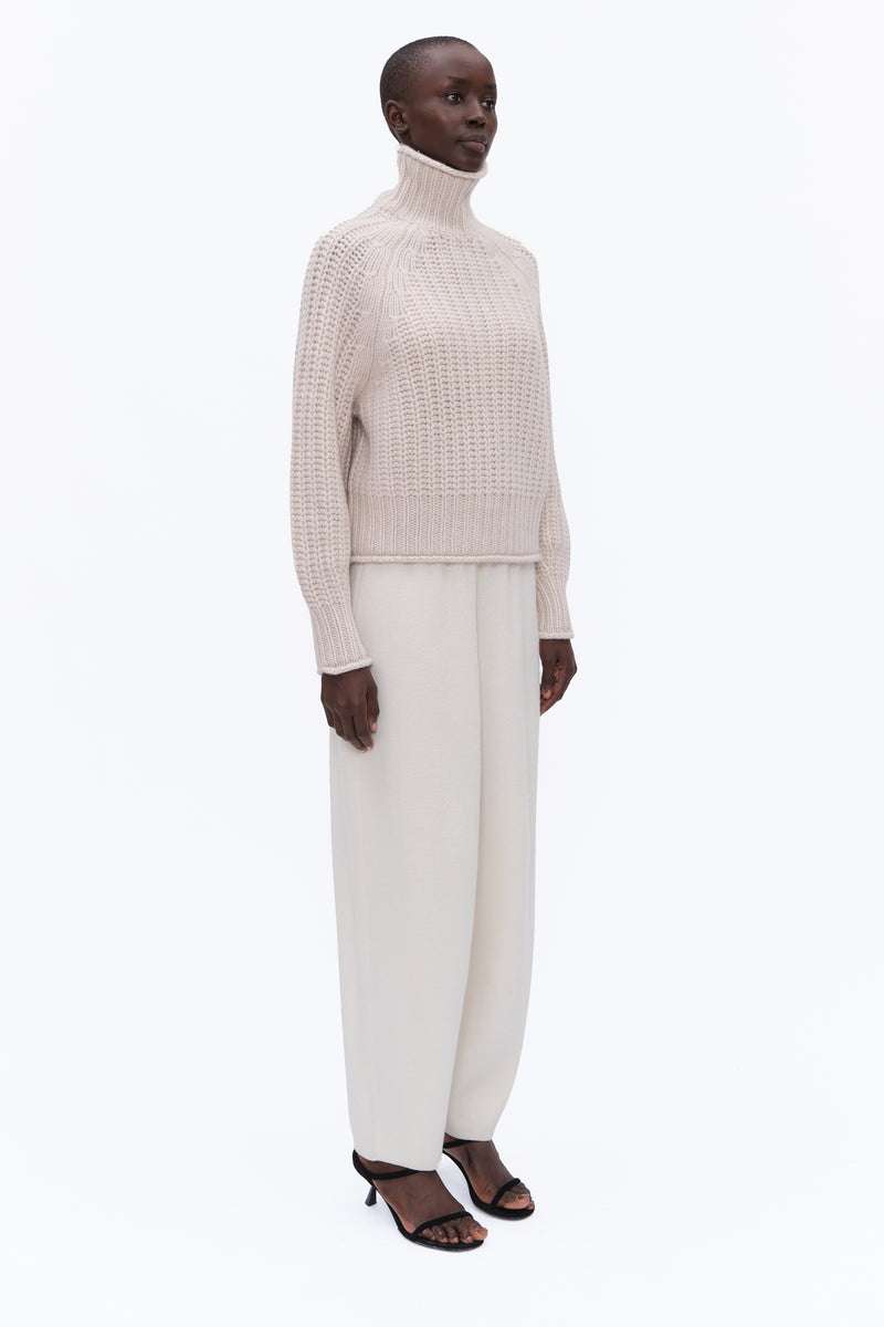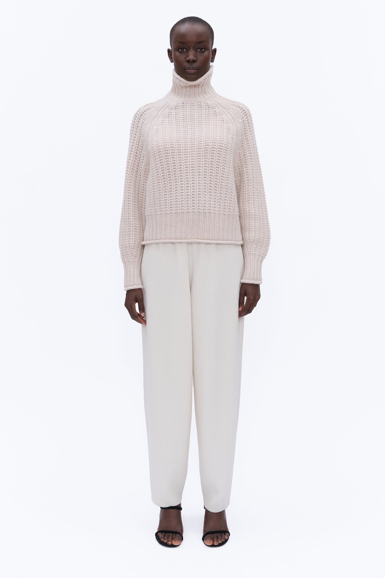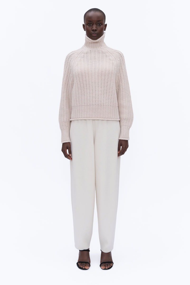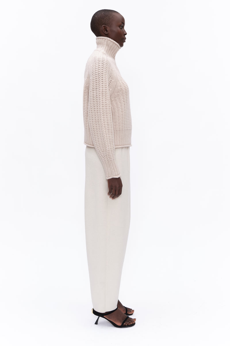 This high-neck hand-knitted cashmere jumper showcases artisanal craftsmanship and luxurious comfort. Designed with a relaxed silhouette, it offers an effortlessly chic look for any occasion. Crafted from pure cashmere, it combines timeless style with exceptional softness.