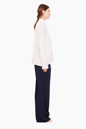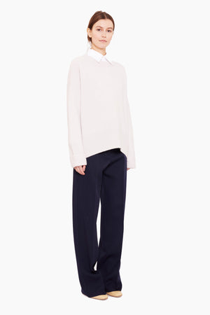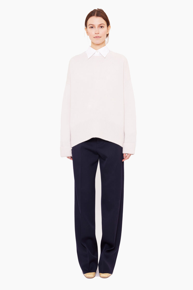 This crew neck jumper, in heavy weight luxurious chunky knit cashmere, carefully and sustainably selected for its exceptional softness and rich texture. Featuring fully fashioned seams, with a one-size-fits-all, oversized silhouette and slouchy roll-up sleeves. Refined by a ribbed neckline, cuffs and a high-low hem.