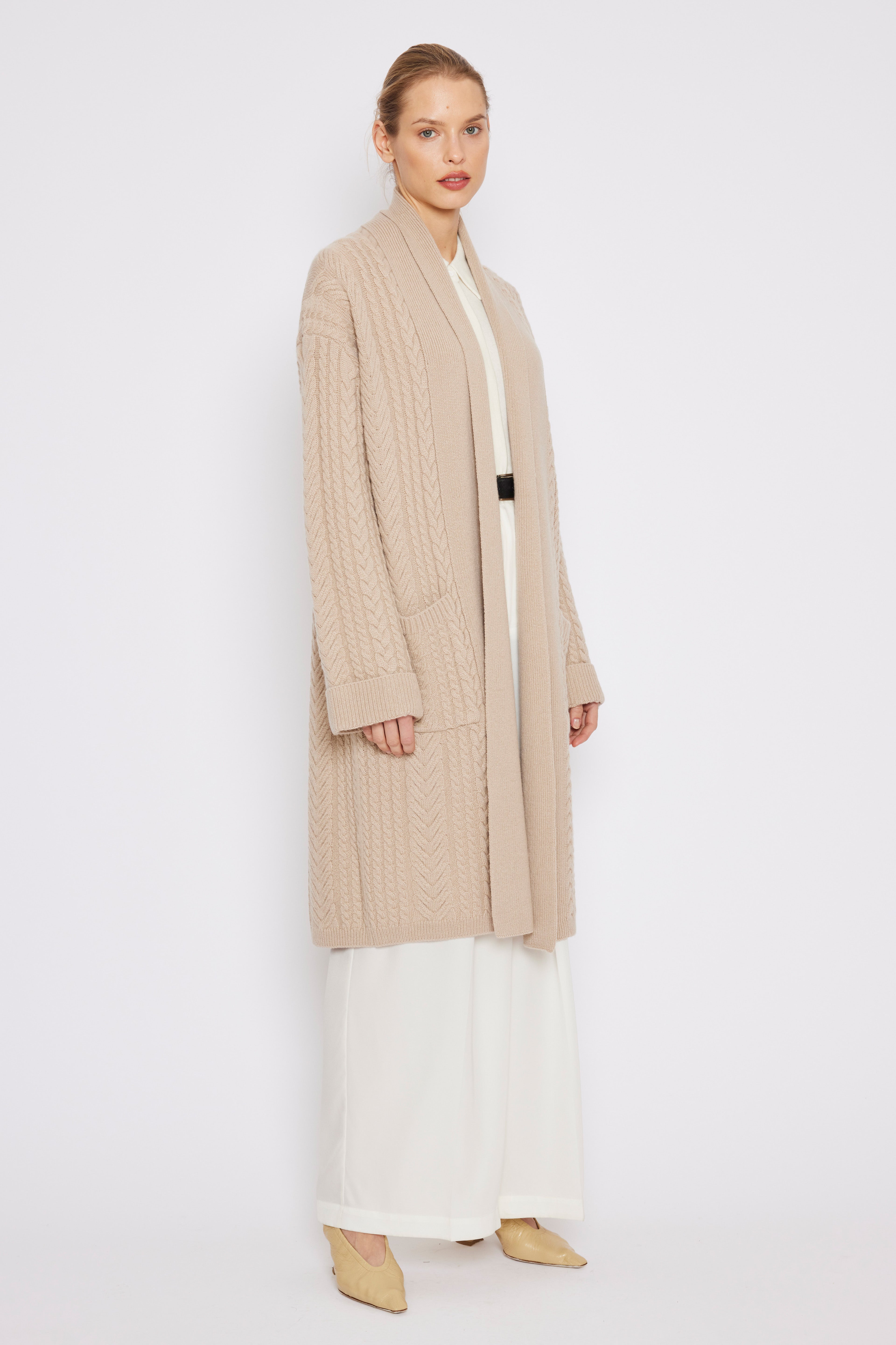 This effortlessly elegant longline cardigan in heavy weight luxurious hand knit cashmere, carefully and sustainably selected for its exceptional softness and rich texture. Featuring fully fashioned seams.
