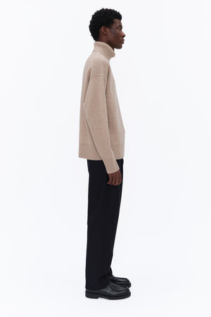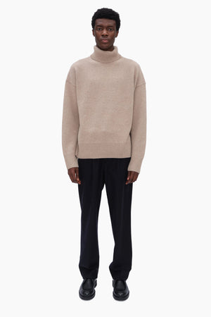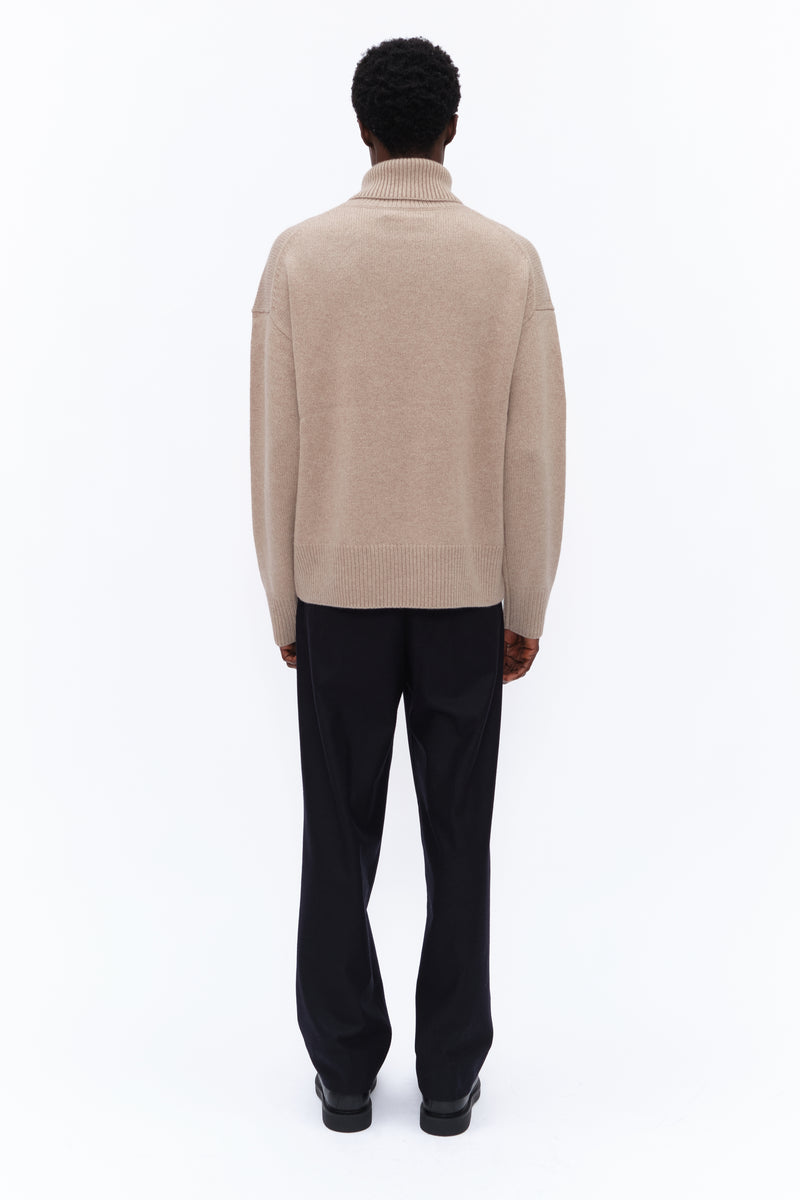 This Double Roll neck jumper, in luxurious chunky knit cashmere, carefully and sustainably selected for its exceptional lightweight softness. With relaxed silhouette, ribbed cuffs and hem, and balanced by elegant long sleeves, Mr Worlds end is perfect for layering or wearing on its own.