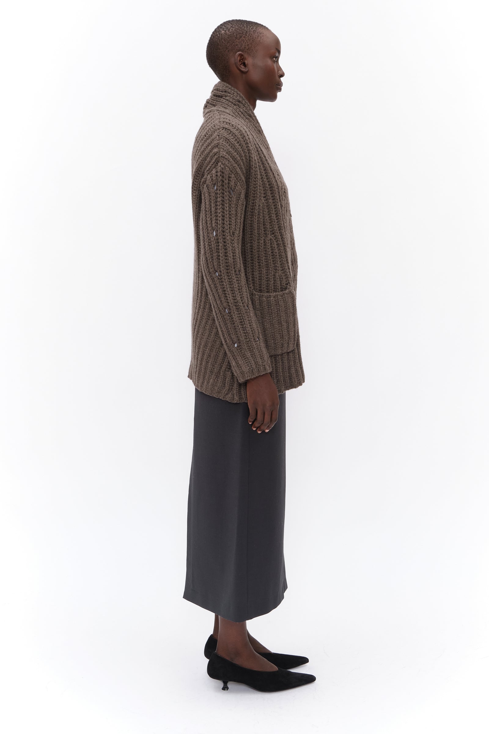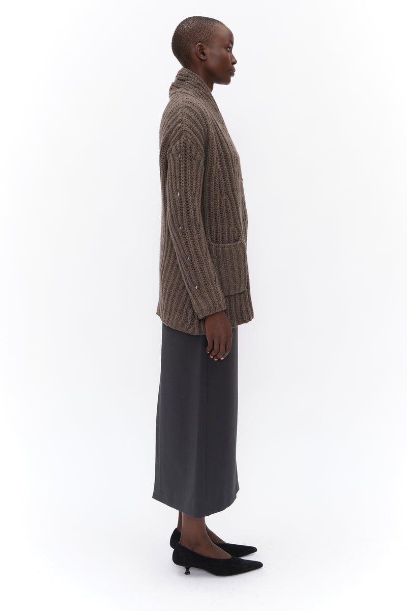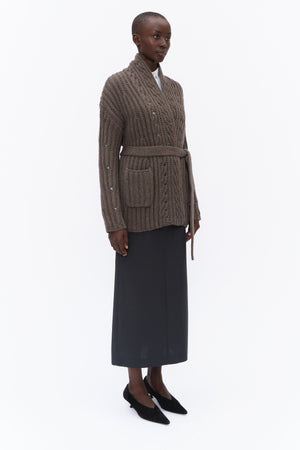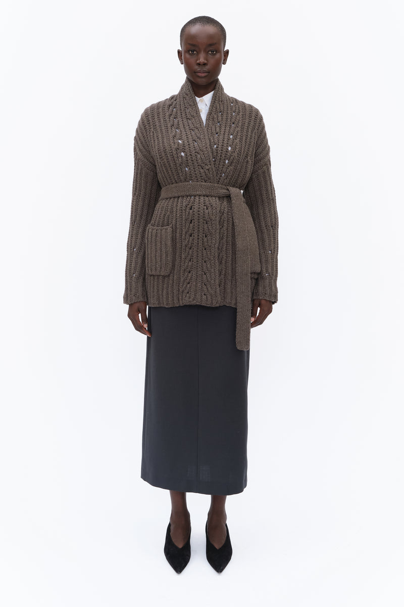 This effortlessly elegant short cardigan in heavy weight luxurious hand knit cashmere, has been carefully and sustainably selected for its exceptional softness and rich texture. Featuring fully fashioned seams, with a cropped silhouette and tie waist for added shape.