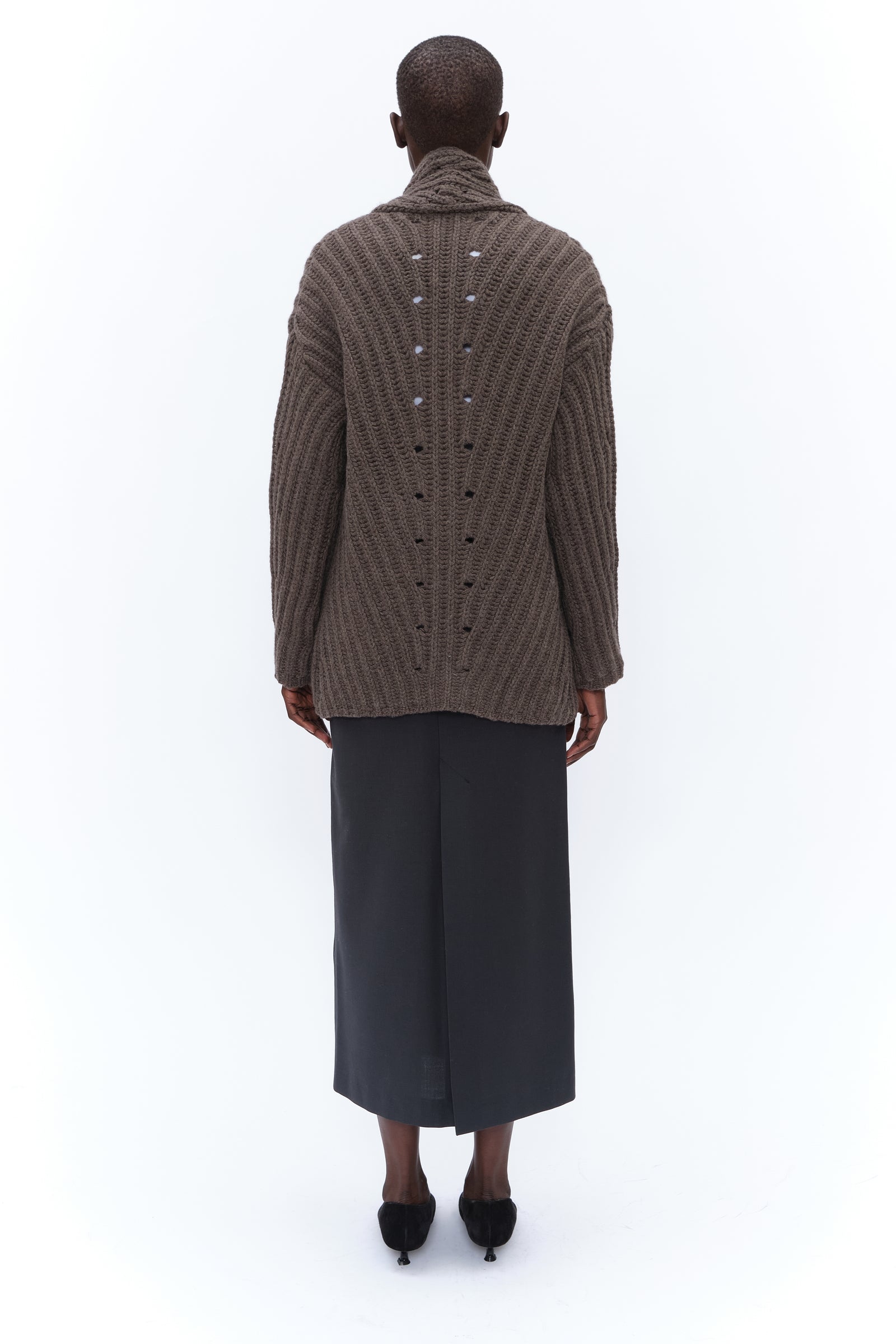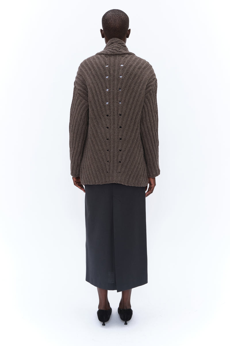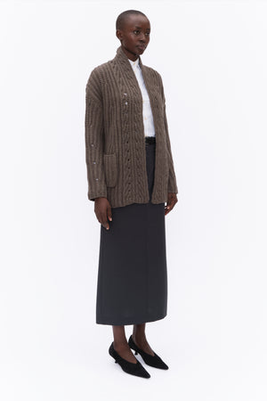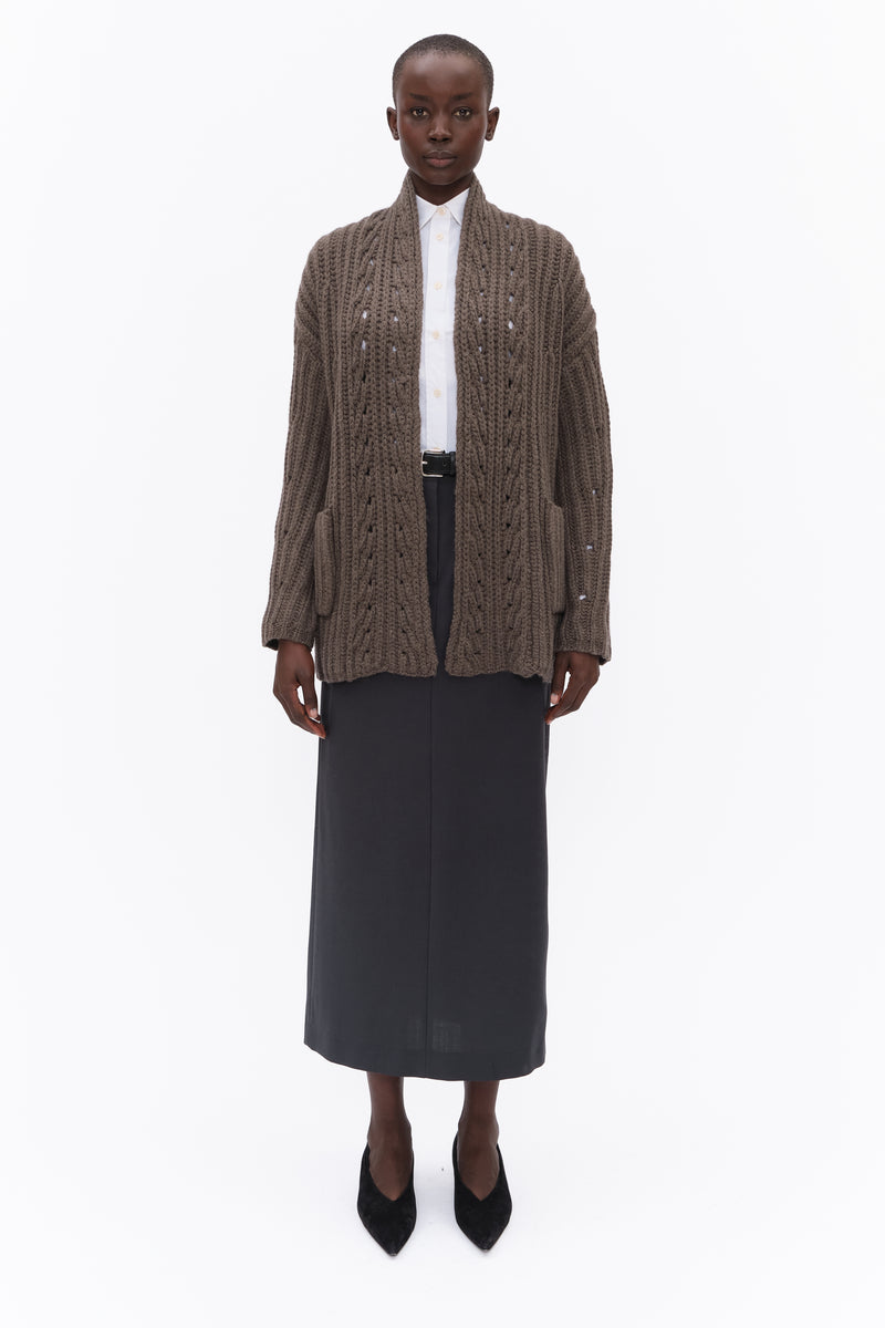 This effortlessly elegant short cardigan in heavy weight luxurious hand knit cashmere, has been carefully and sustainably selected for its exceptional softness and rich texture. Featuring fully fashioned seams, with a cropped silhouette and tie waist for added shape.