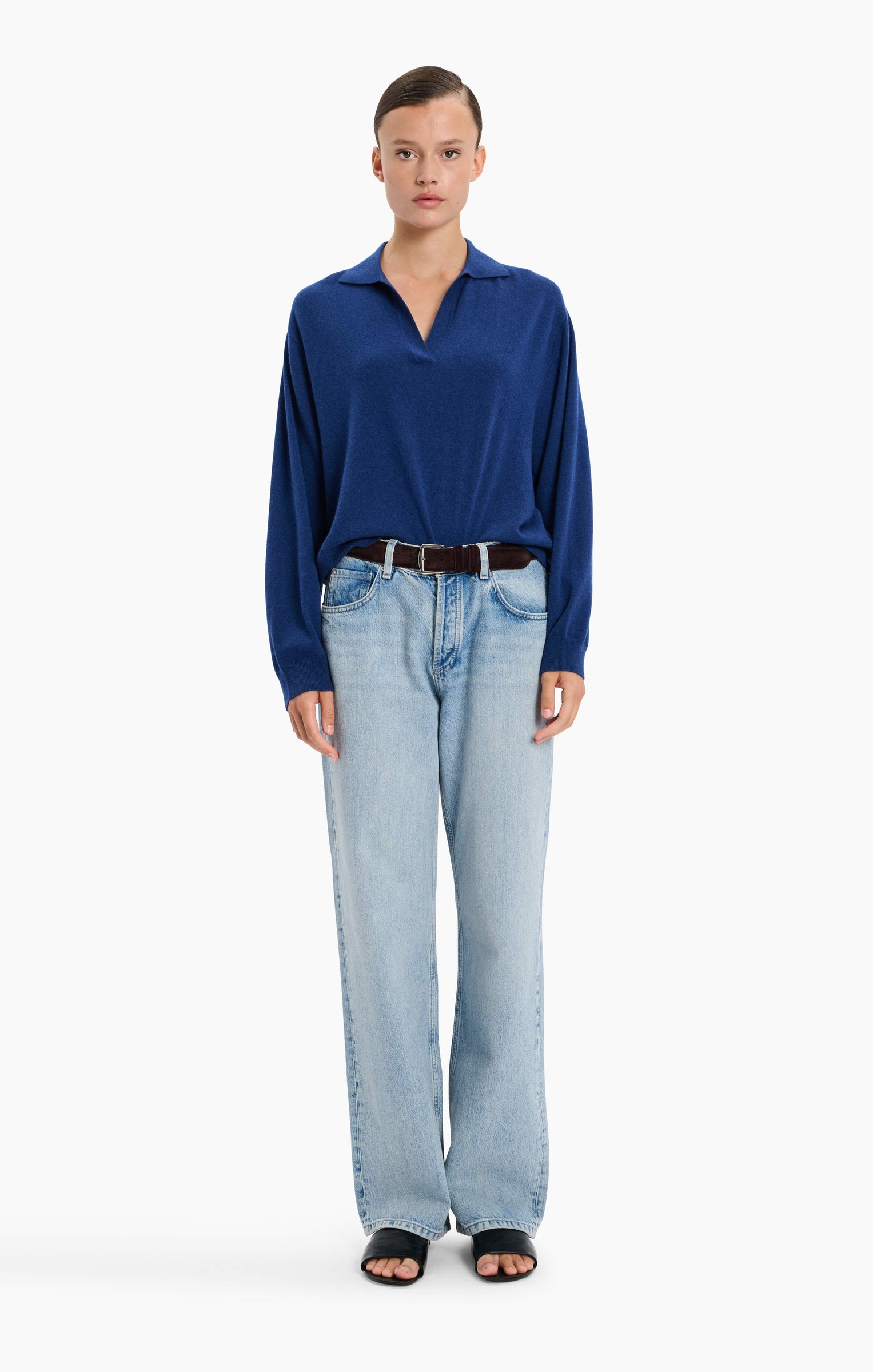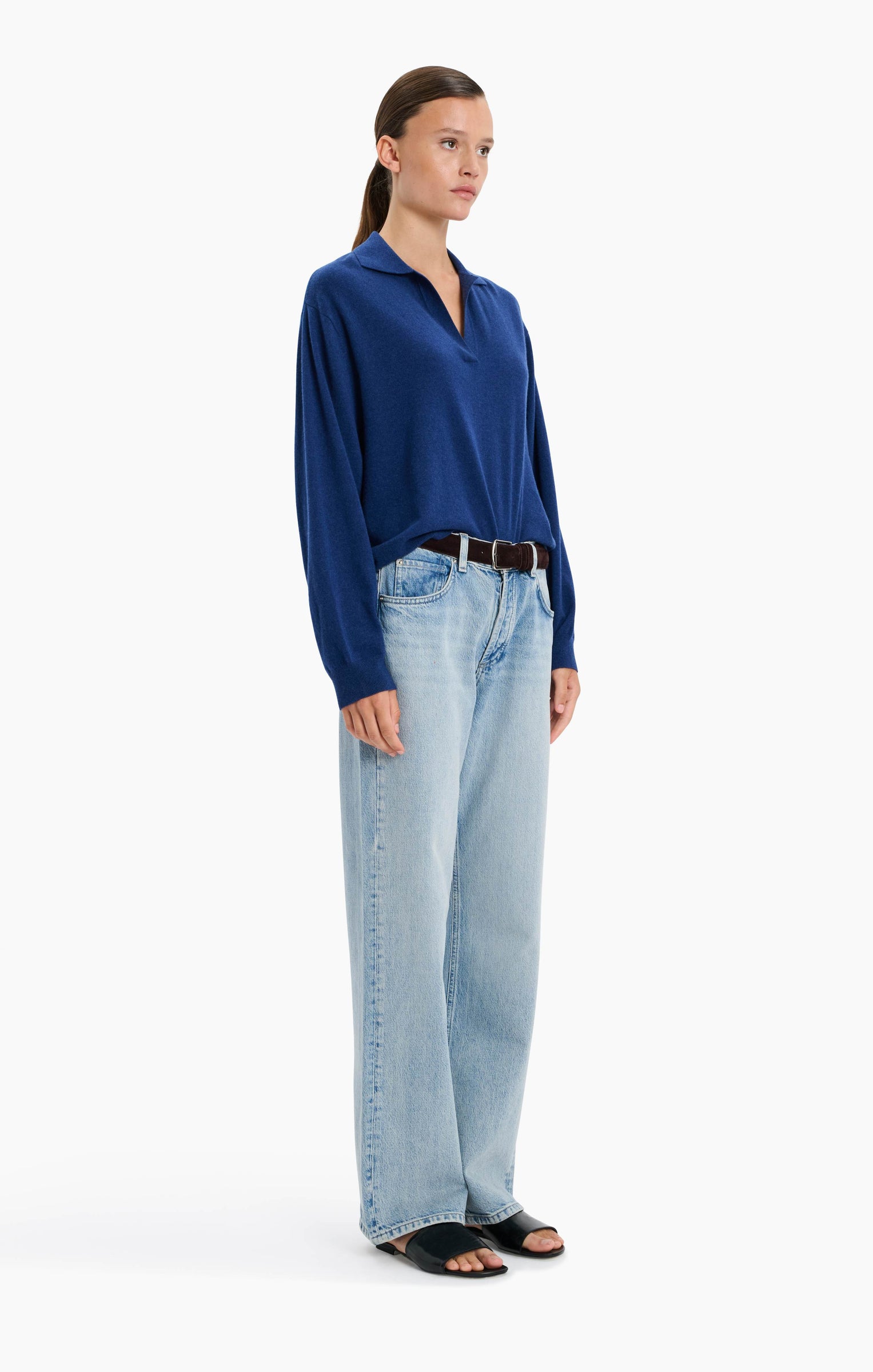 This V-neck collared jumper, in luxurious baby goat cashmere, has been carefully and sustainably selected for its exceptional lightweight softness. Featuring fully fashioned seams with a relaxed cropped silhouette balanced by beautiful drop shoulder sleeves, an oversized collar and refined by ribbed cuffs and hem.
