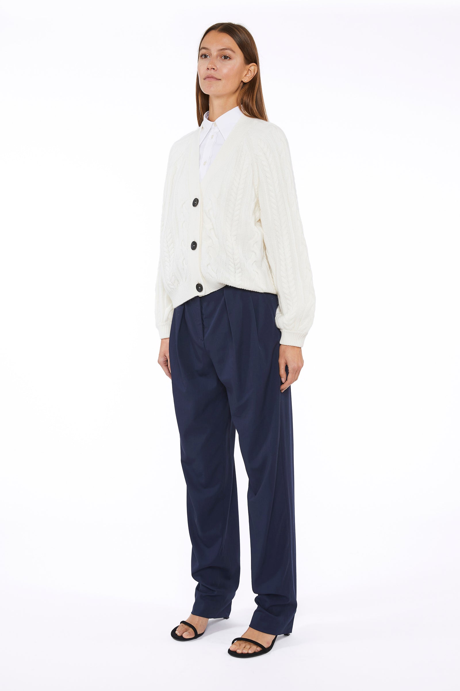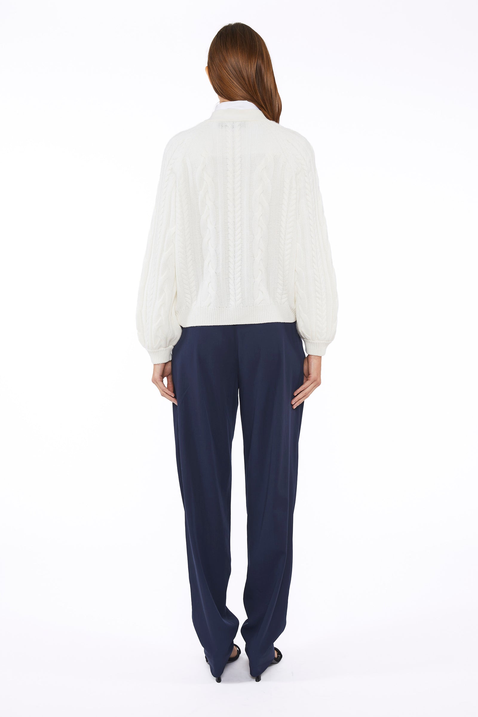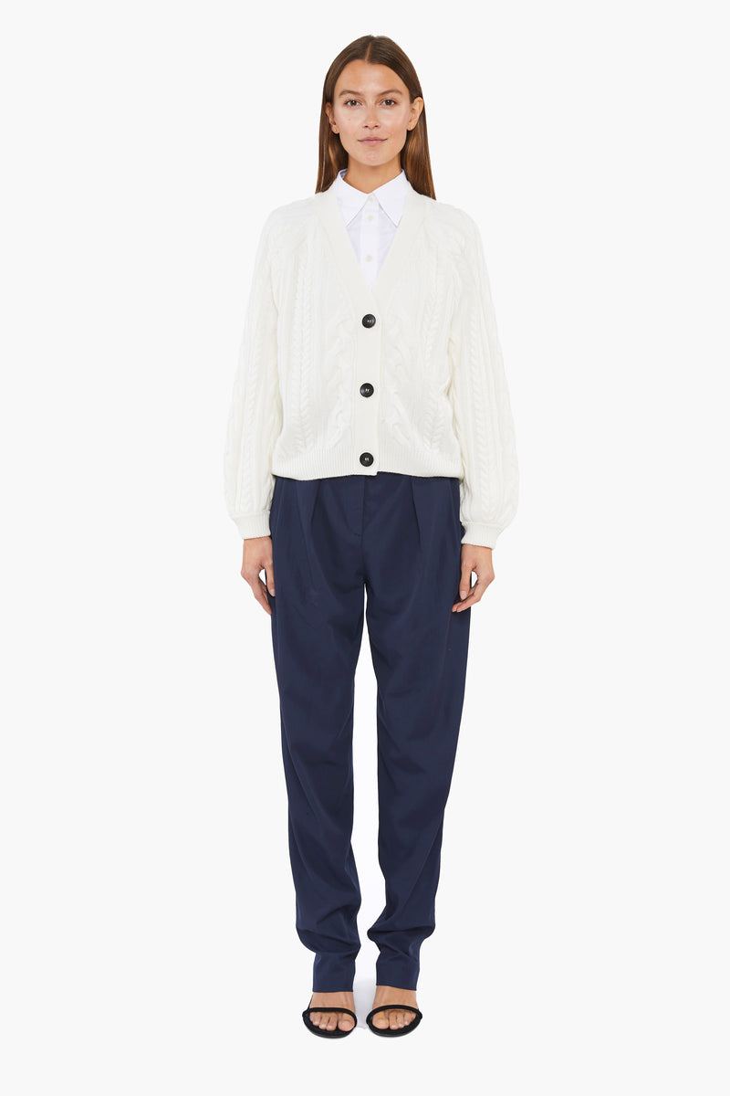 This V-neck cashmere winter cable knit cardigan is the perfect combination of warmth and elegance. Featuring a timeless cable knit design and three statement buttons down the front, it adds a touch of sophistication to your cold-weather wardrobe.