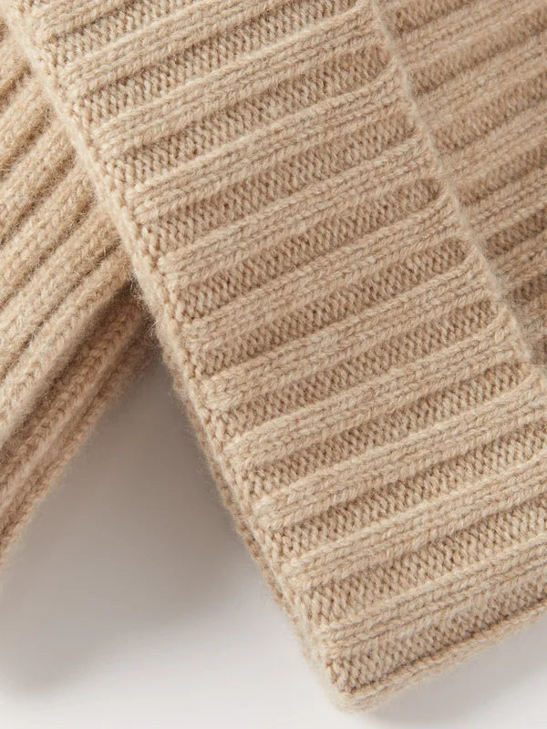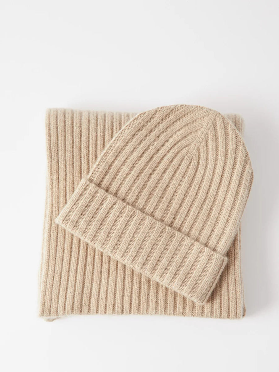 This textured hat and scarf set, in heavy weight luxurious chunky knit cashmere, carefully and sustainably selected for its exceptional softness and rich texture. Featuring fully fashioned seams and a flattering hem turn up.