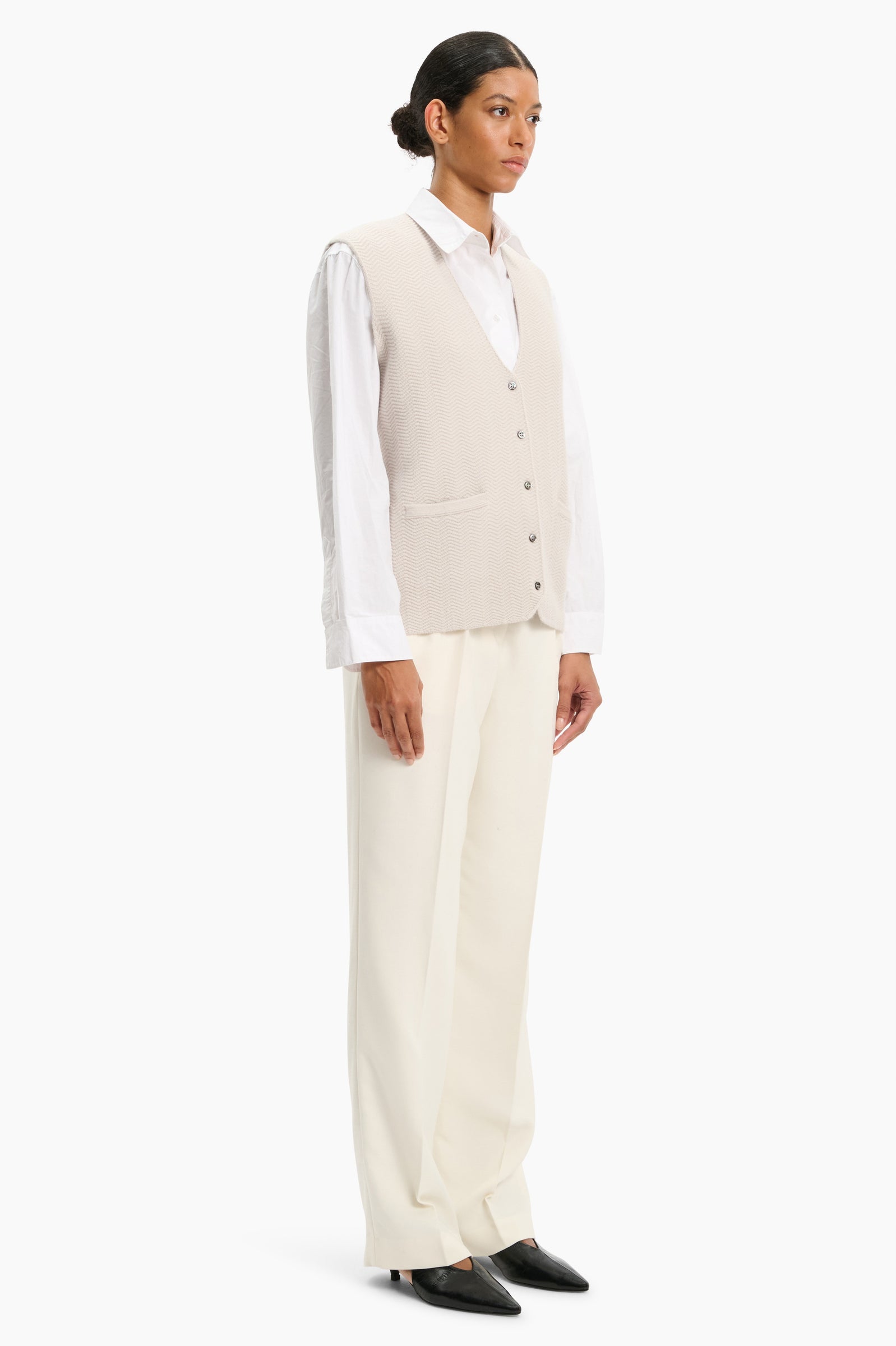This deep V-neck vest in heavy weight luxurious milano knit cashmere, has been carefully and sustainably selected for its exceptional softness and rich texture. Featuring fully fashioned seams, with a fitted silhouette refined by button closures, and a textured knit.