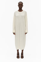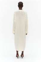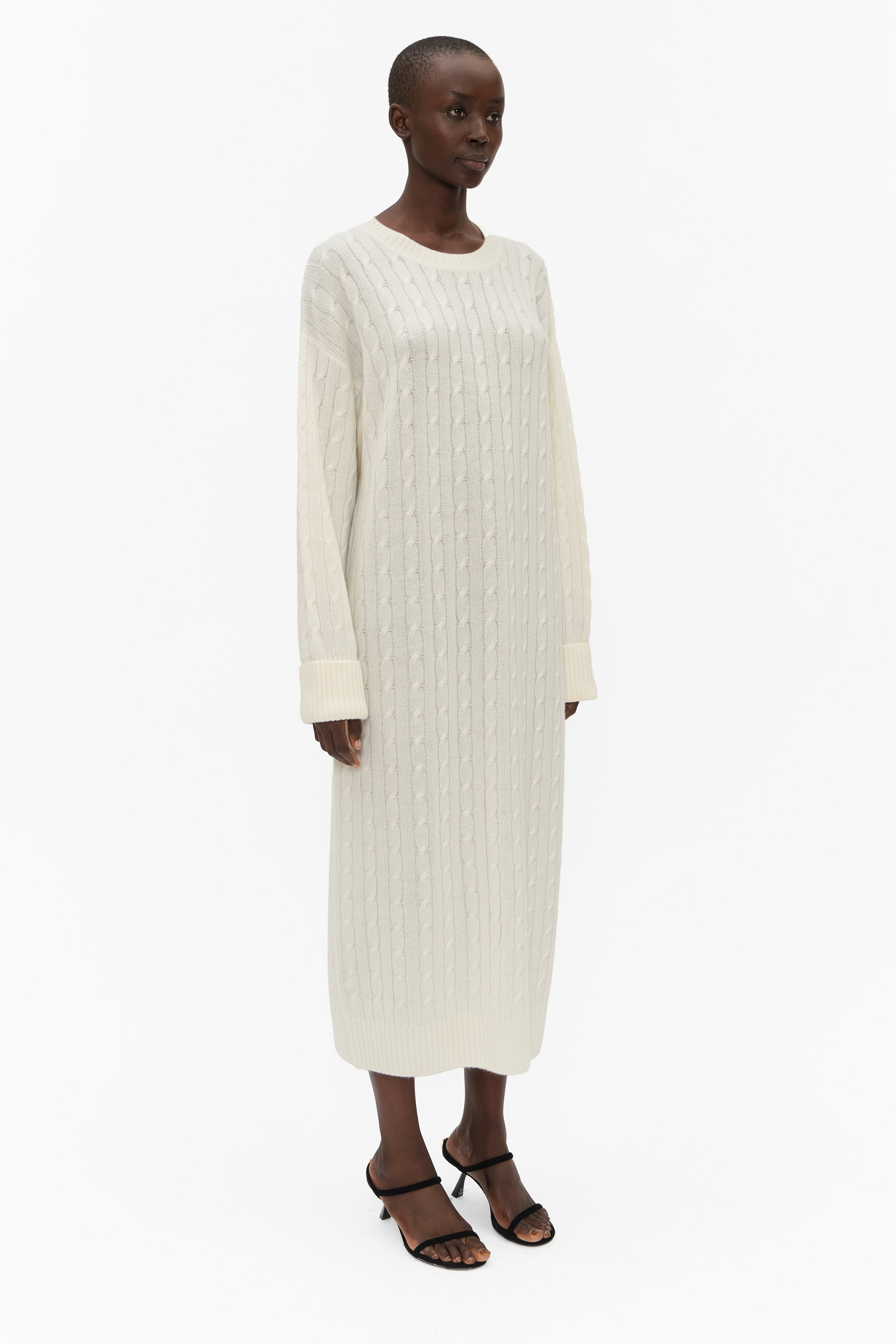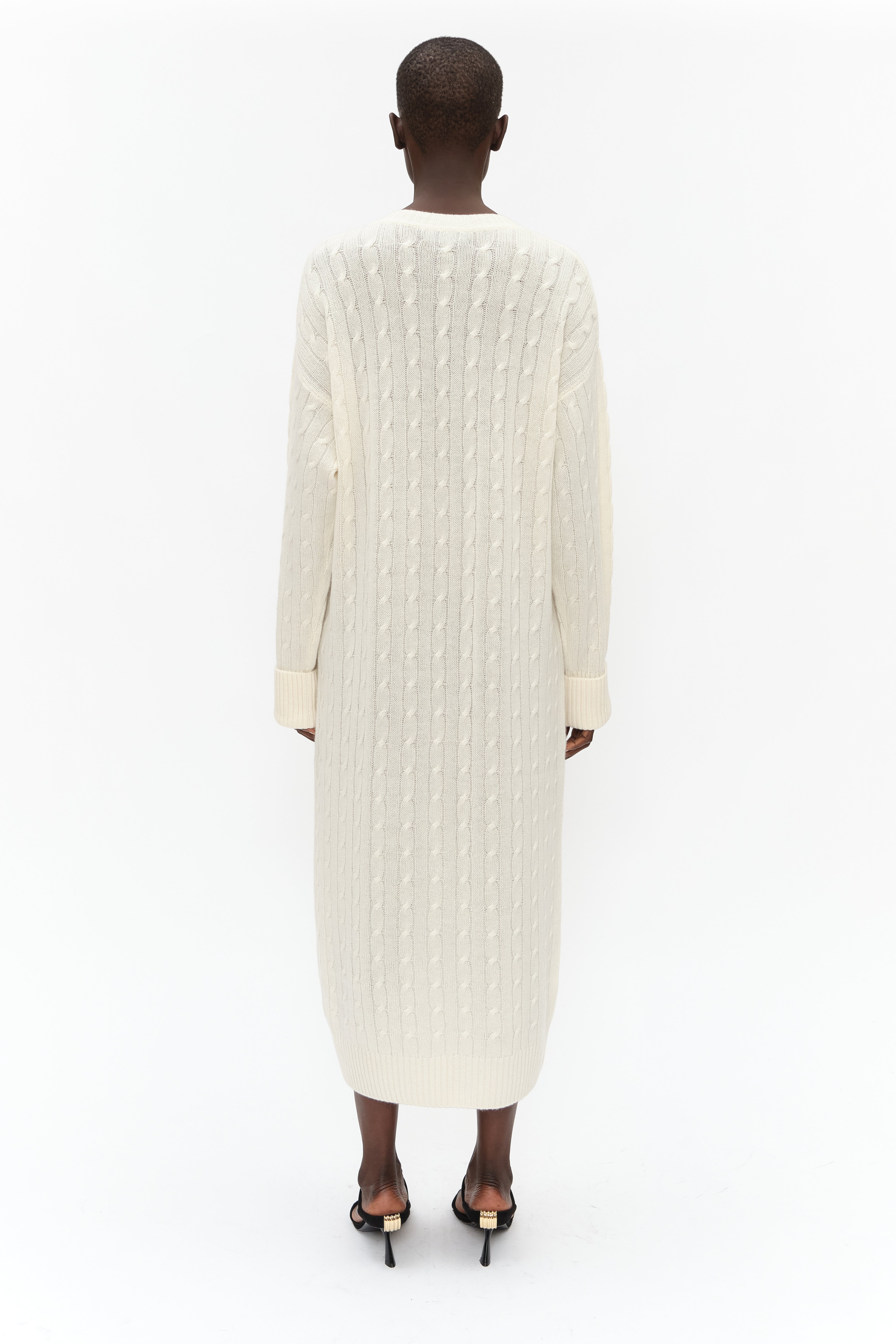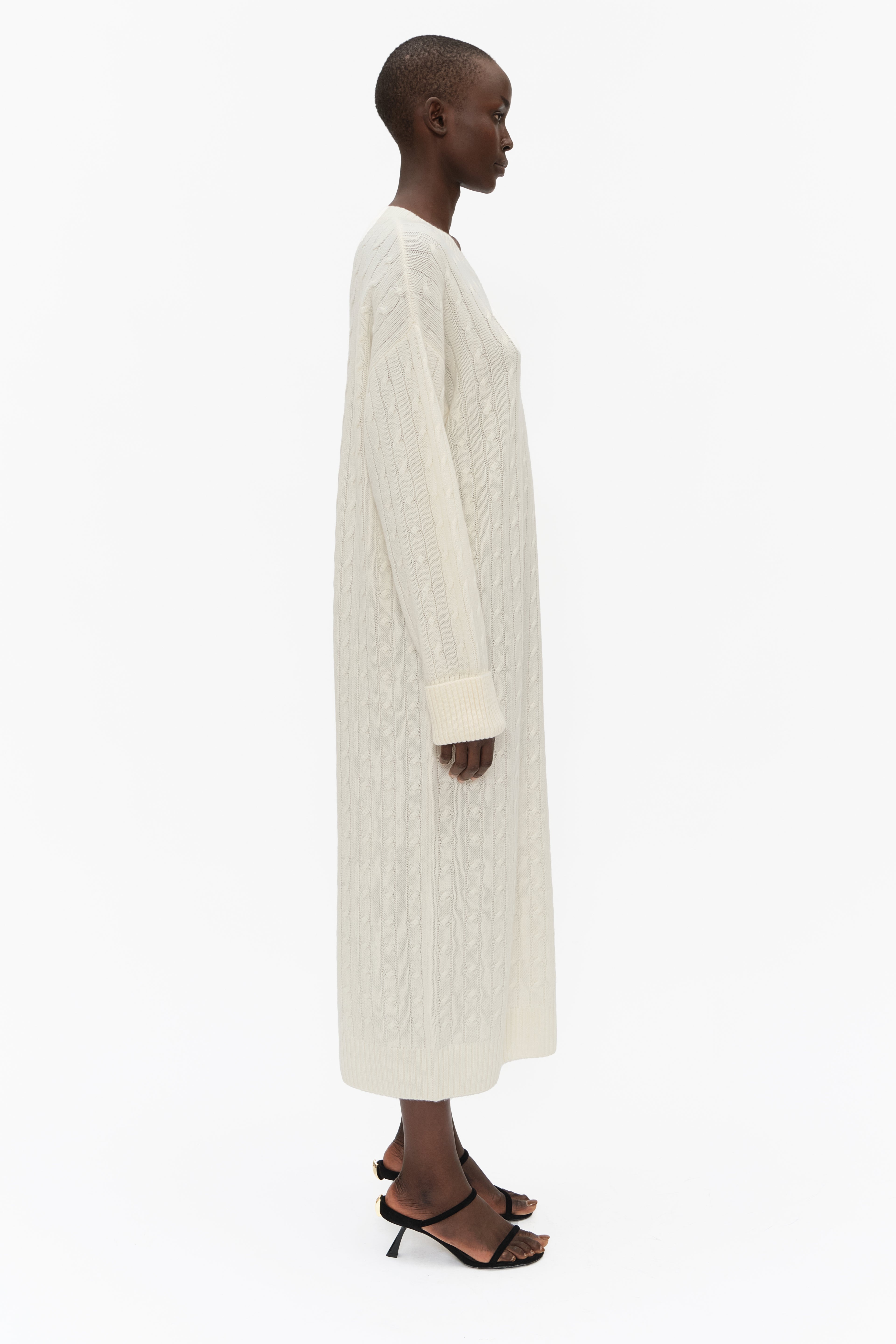 This effortlessly elegant longline dress in heavy weight winter cable knit cashmere, carefully and sustainably selected for its exceptional softness and rich texture. Featuring fully fashioned seams, with a full length silhouette and shift style for a casual yet chic look.