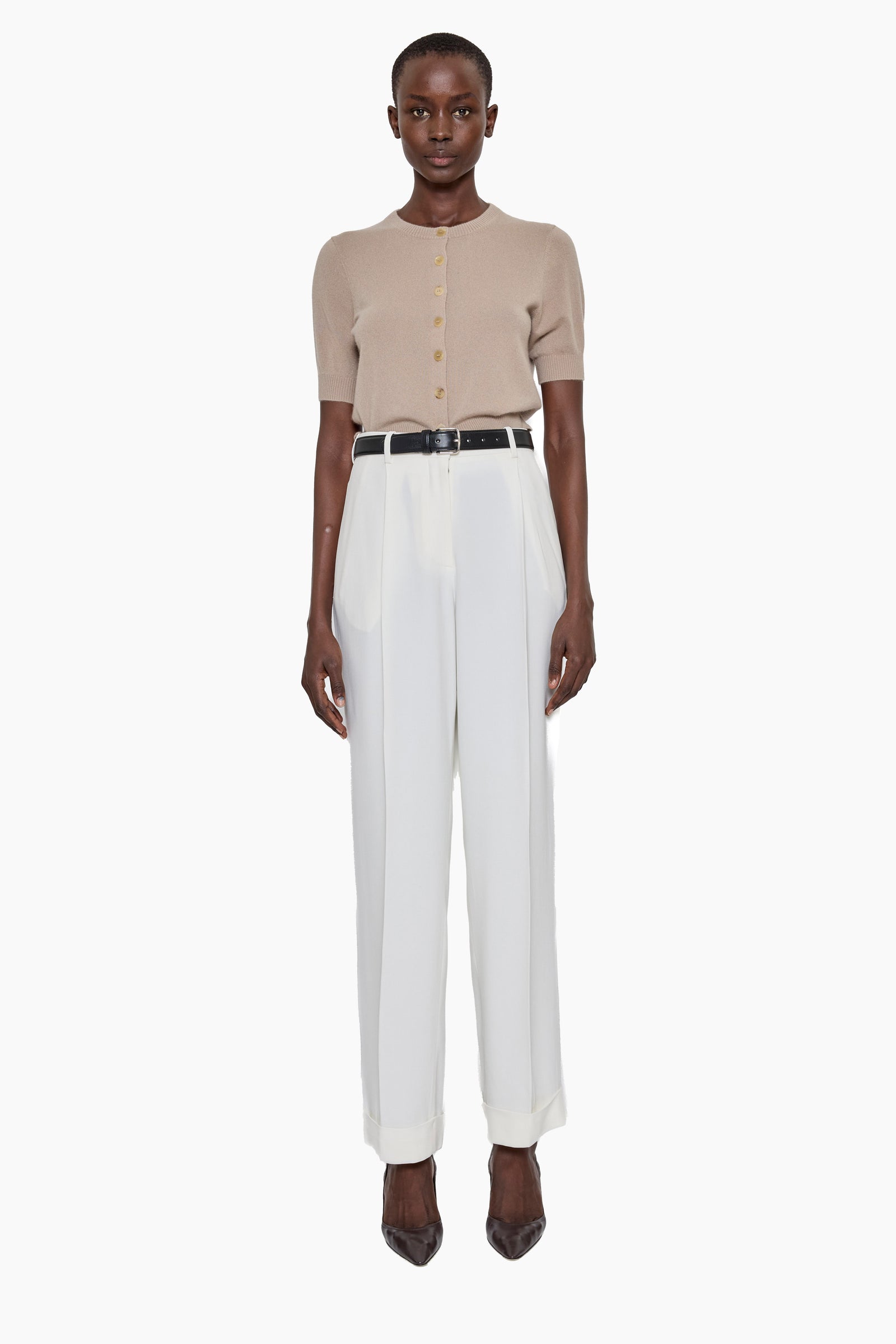 The Stanley Short-Sleeve Cardigan is a modern layering essential with a refined, understated silhouette. Crafted from 100% Baby Goat Cashmere, it features a crew neckline, button-down front, and ribbed trims for subtle structure. Lightweight yet luxurious, this versatile short sleeved cardigan can be worn on its own or layered, making it a timeless addition to any wardrobe.