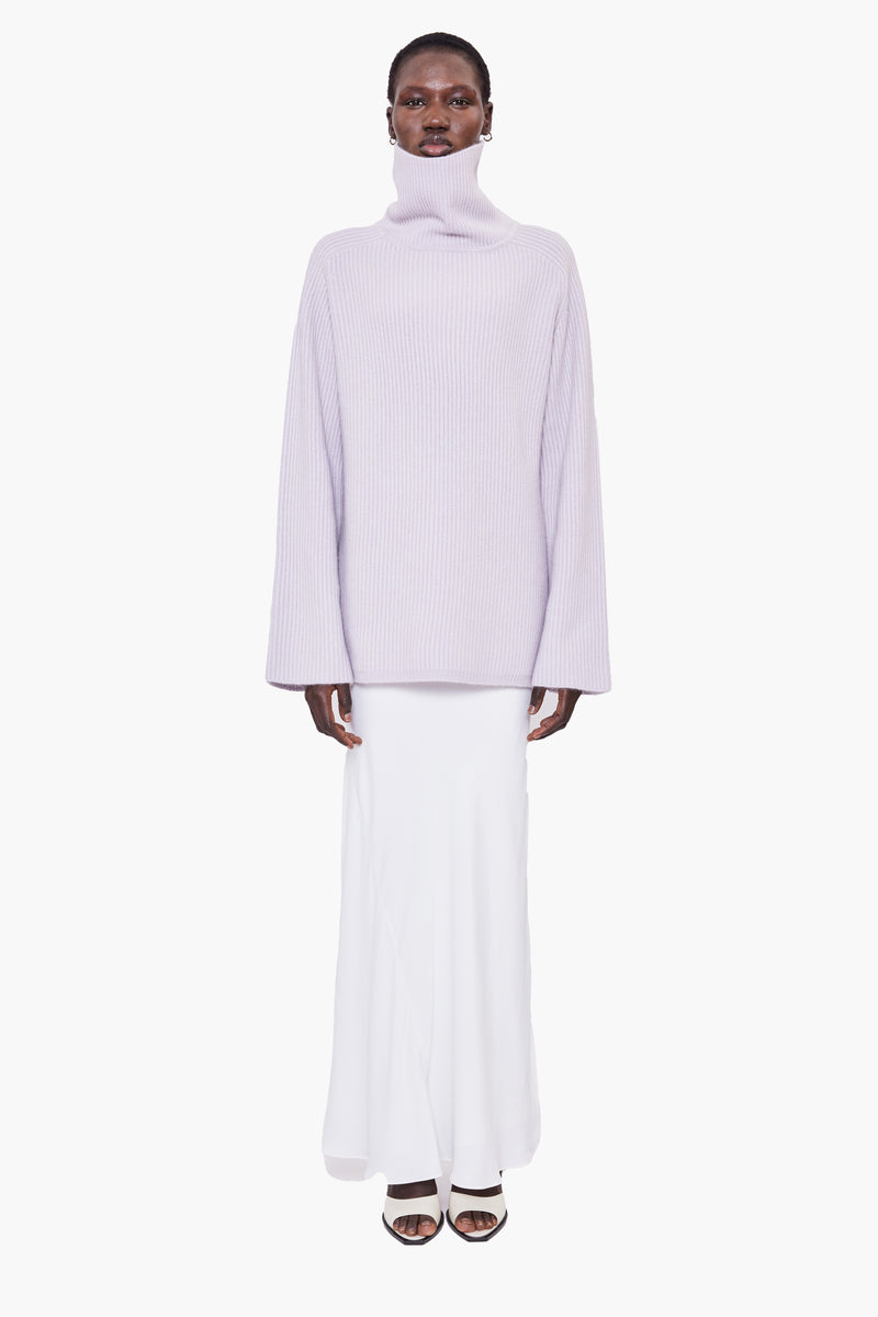 This high-neck chunky full cardigan stitch knit jumper, in heavy-weight luxurious chunky knit cashmere, has been carefully and sustainably selected for its exceptional softness and rich ribbed texture. Featuring fully fashioned seams and an oversized silhouette, this jumper is the perfect addition to any winter outfit.