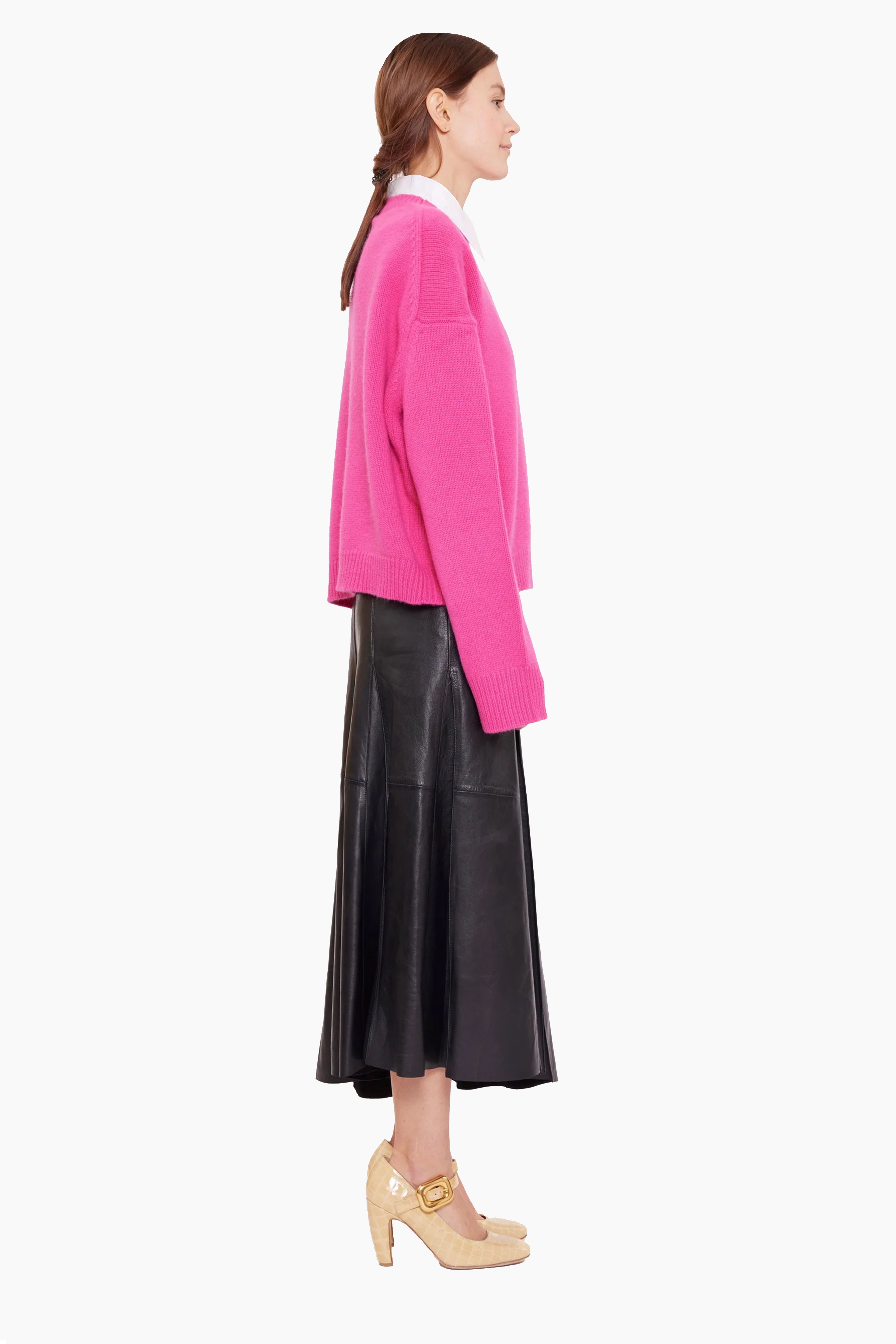 This crew neck jumper, in heavy-weight luxurious chunky knit cashmere, carefully and sustainably selected for its exceptional softness and rich texture. Featuring fully fashioned seams, with a slightly fitted cropped silhouette balanced by deliberately elongated sleeves and refined by a ribbed neckline, cuffs and hem.