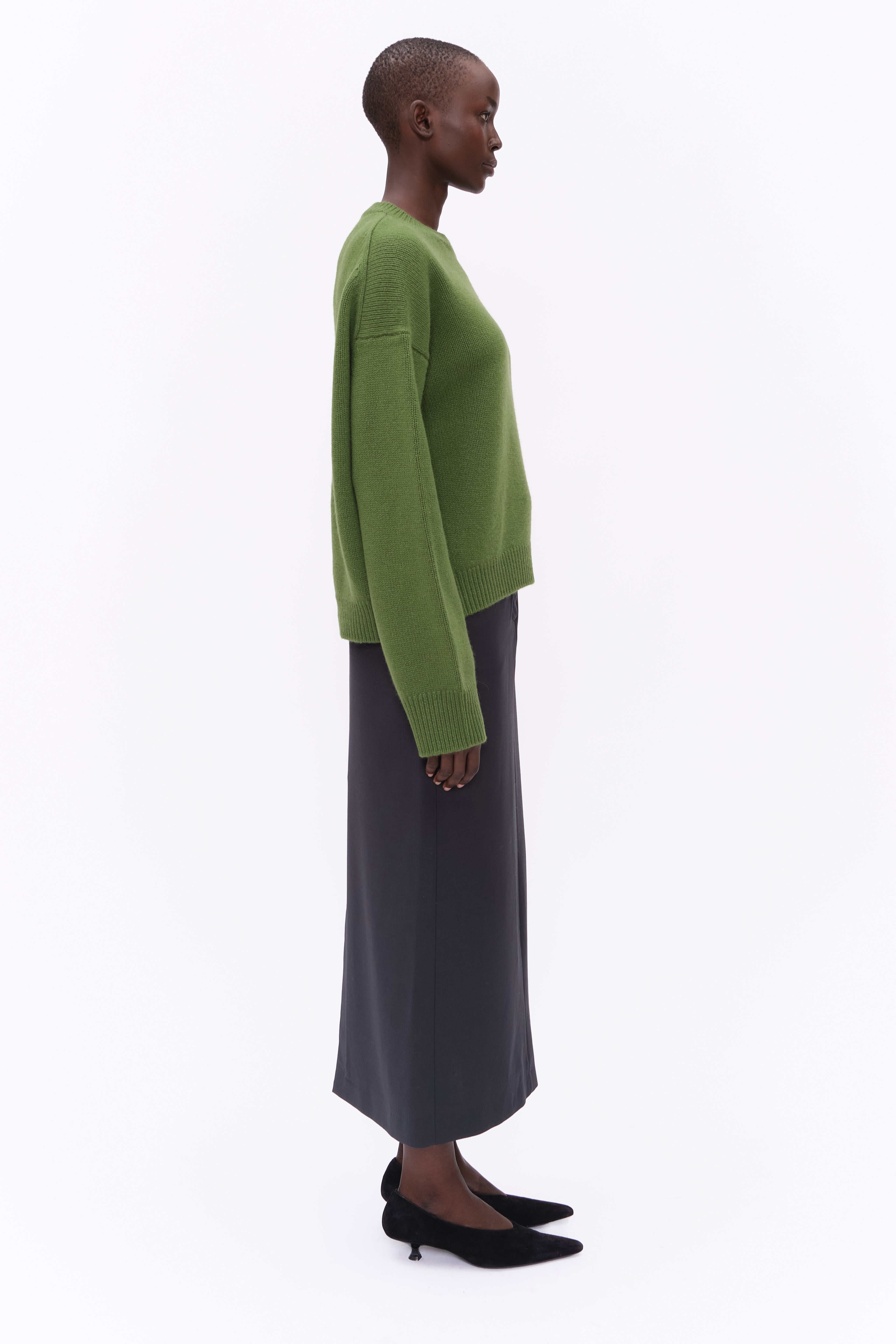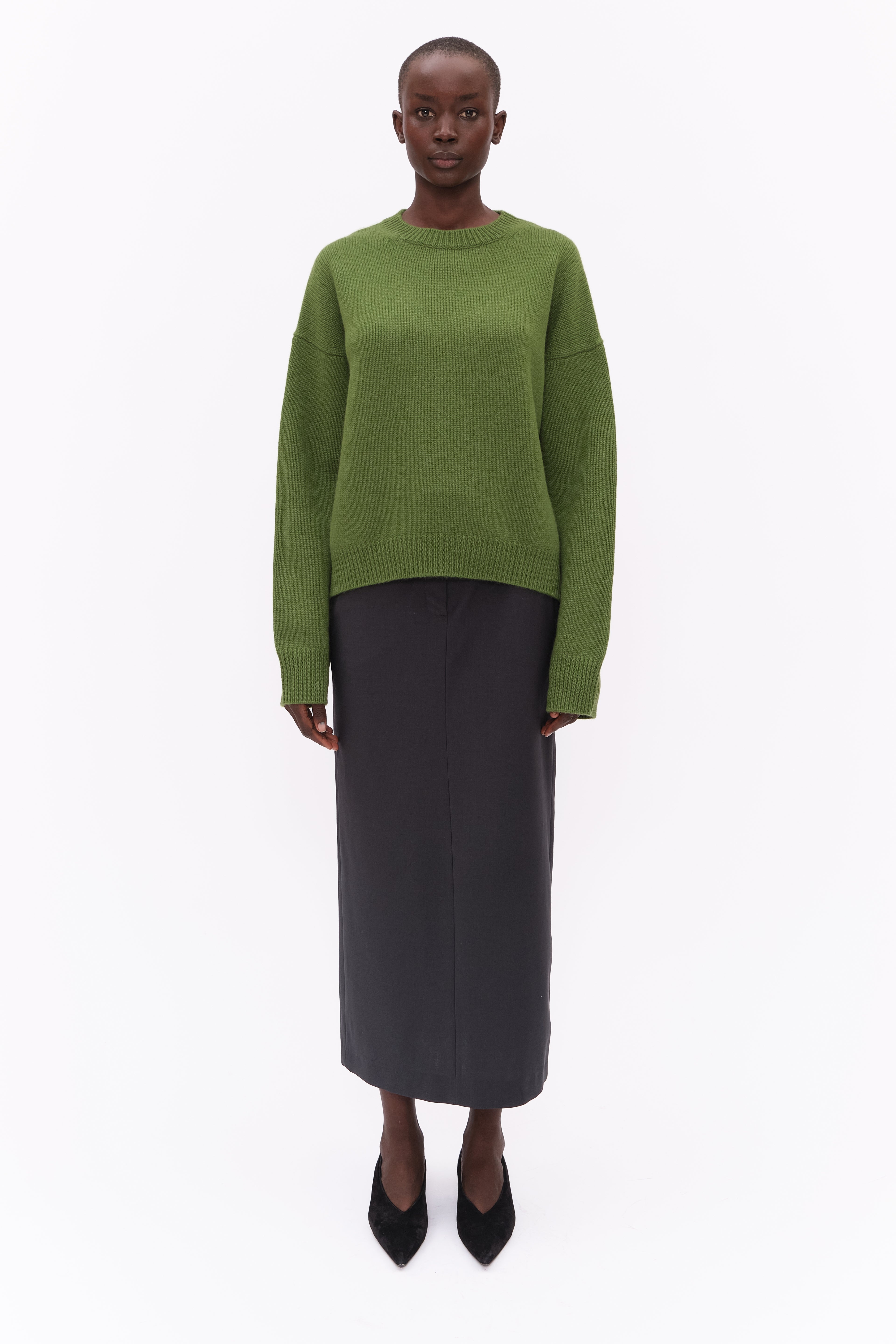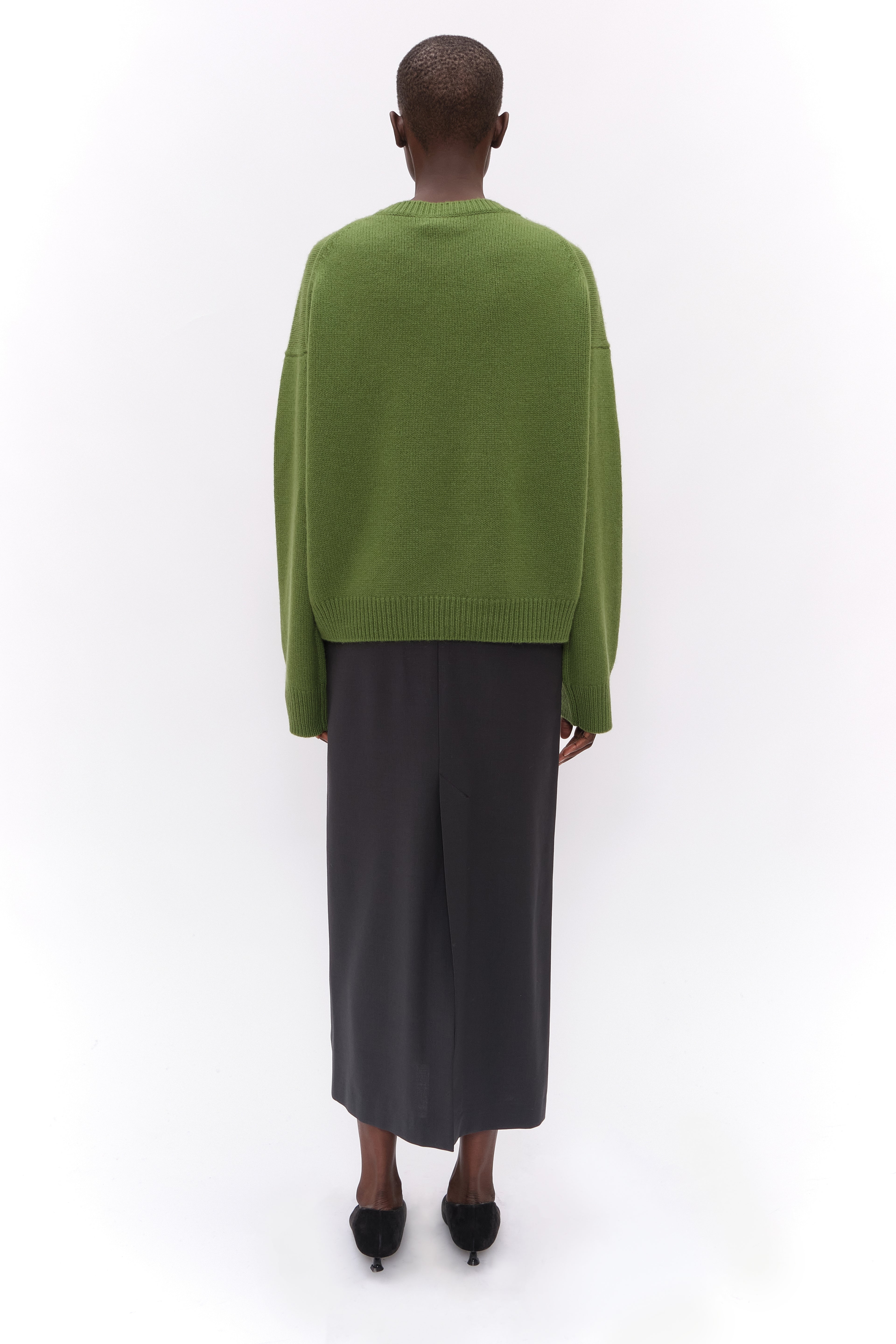 This crew neck jumper, in heavy-weight luxurious chunky knit cashmere, carefully and sustainably selected for its exceptional softness and rich texture. Featuring fully fashioned seams, with a slightly fitted cropped silhouette balanced by deliberately elongated sleeves and refined by a ribbed neckline, cuffs and hem.