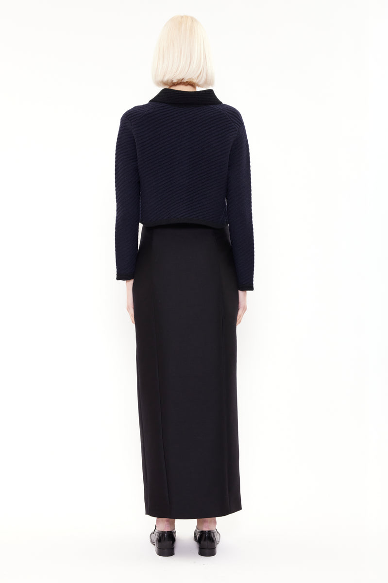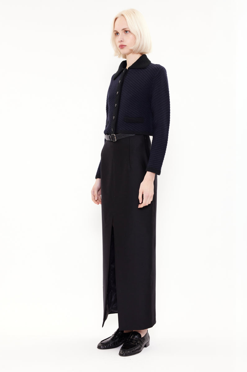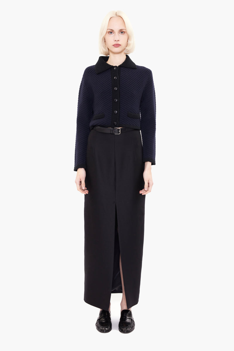 Elevate your layers with this diagonal ribbed cashmere knit cardigan, designed for both style and comfort. Featuring a ribbed collar, hemline, and cuffs, it blends structured details with a soft, cozy feel. A versatile piece that adds texture and elegance to any outfit.