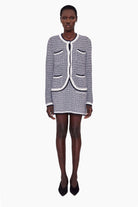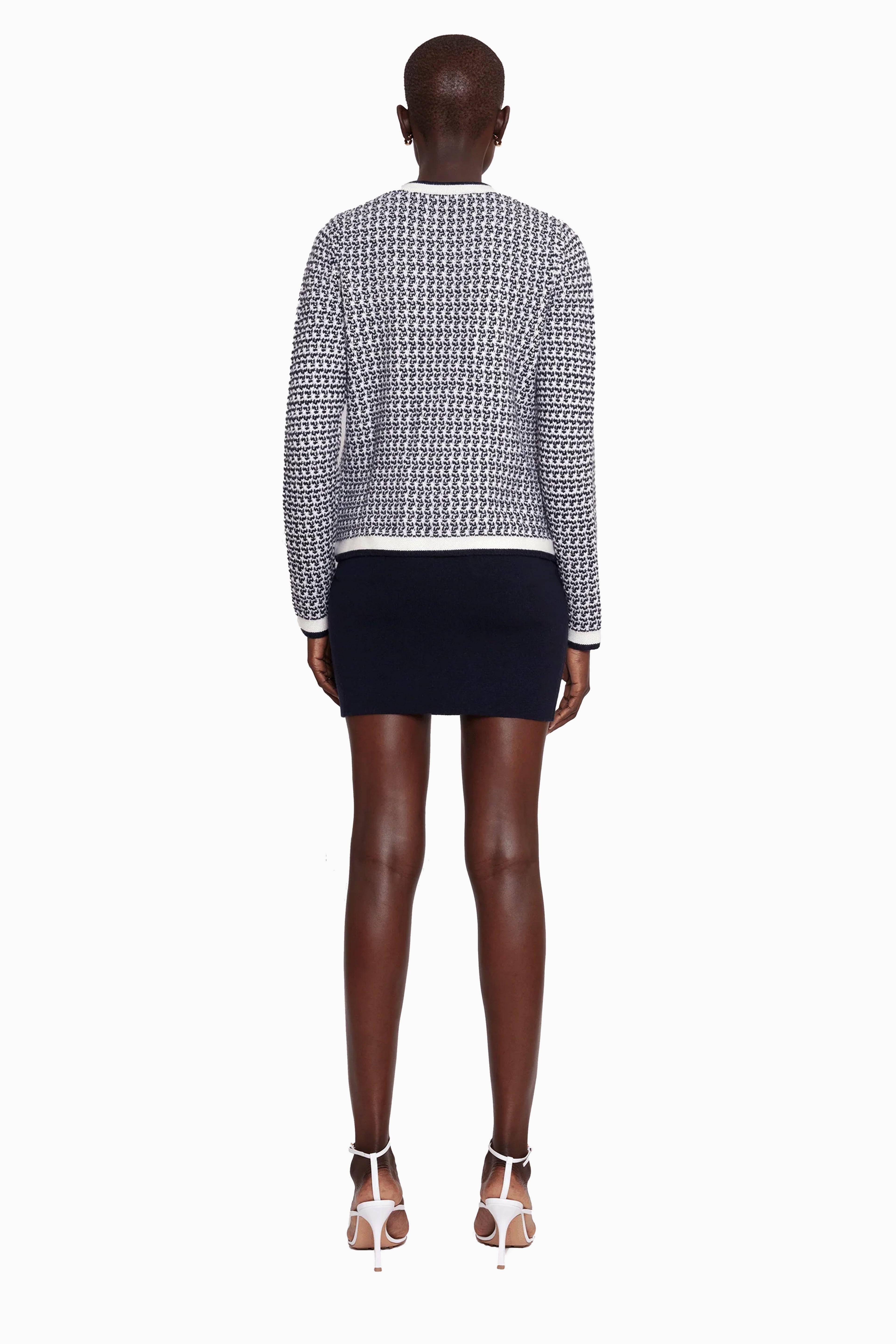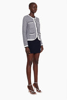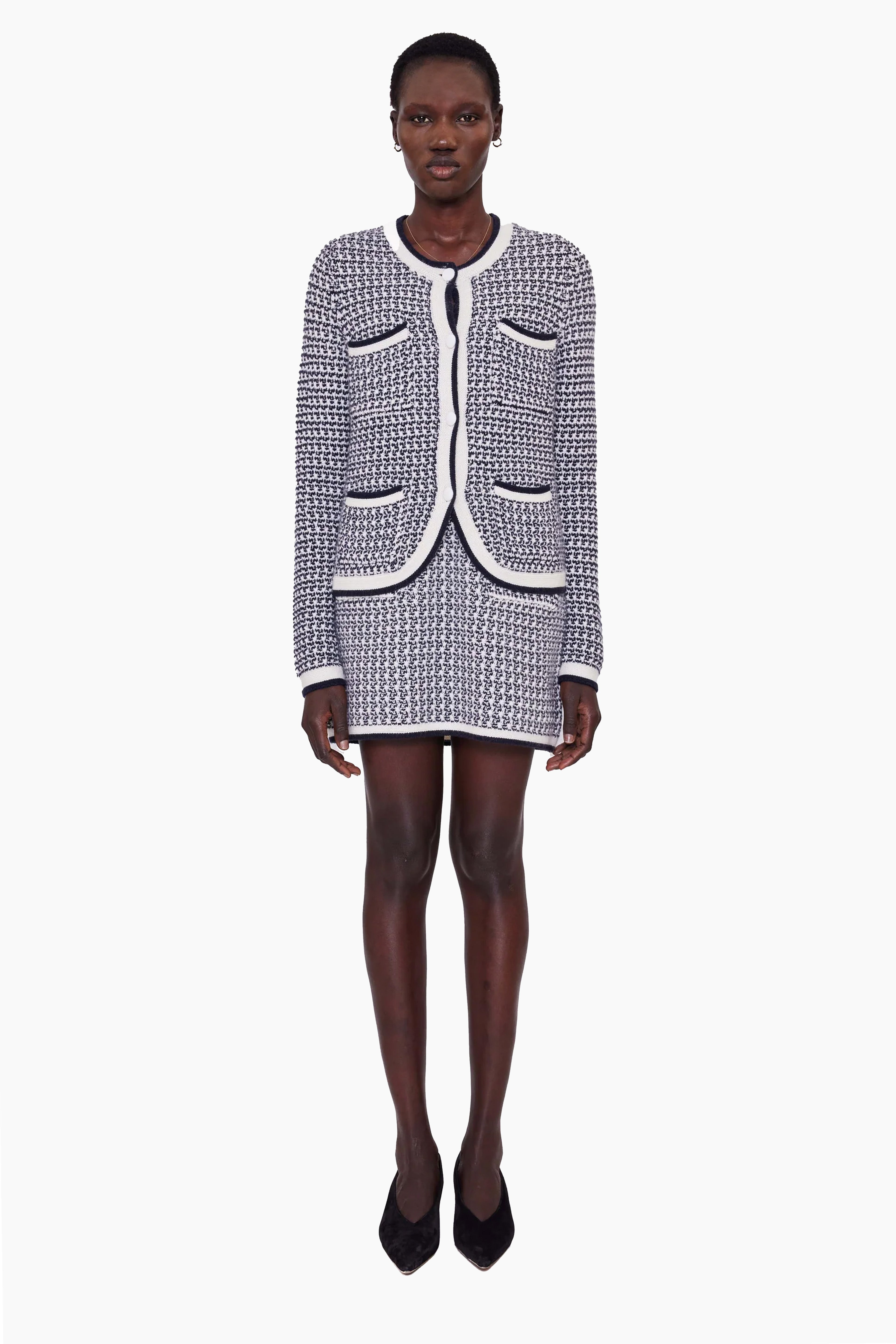 This scoop neck jacket, in luxurious tweed textured cashmere, has been carefully and sustainably selected for its exceptional softness and rich texture. Featuring fully fashioned seams, with a pocketed front and contrast seams.